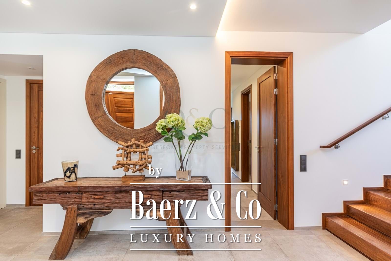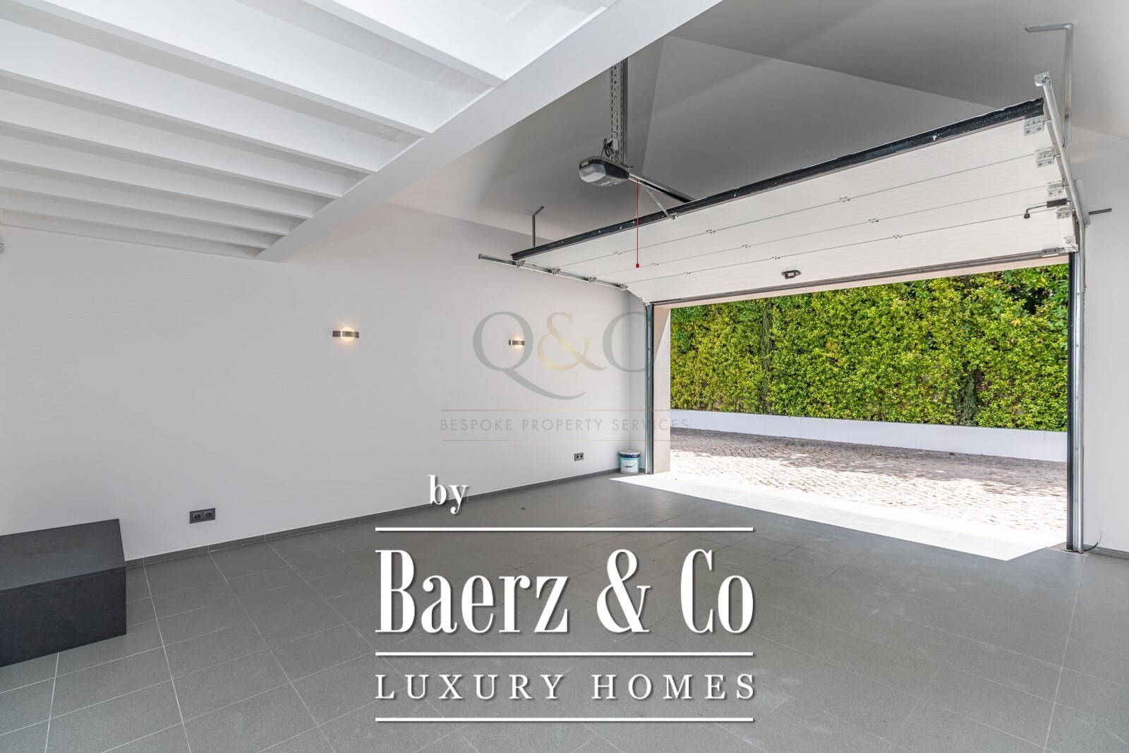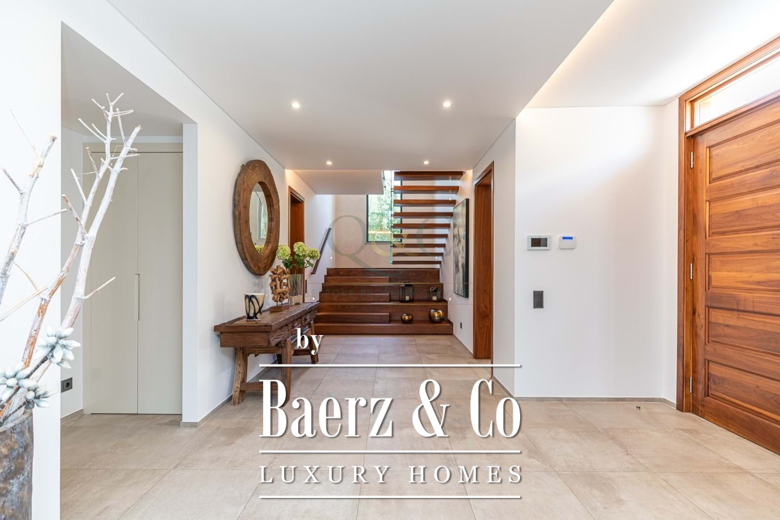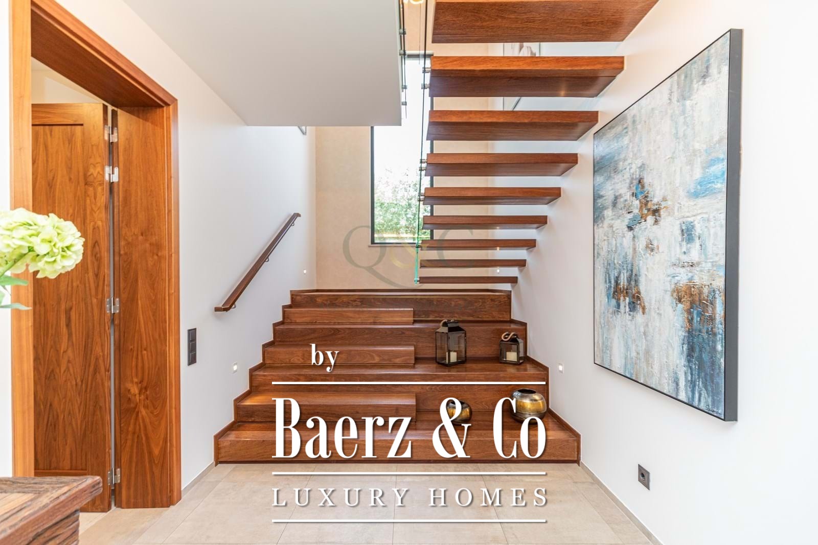 Step through impressive double wooden doors into a grand entrance hall that sets the tone for the entire home. On the ground floor, you'll find a spacious guest suite with private terrace access, a stylish cloakroom, and direct entry to the double garage. The heart of the villa is the expansive open-plan living area, featuring a state-of-the-art kitchen equipped to the highest standards, complete with a multifunctional island and breakfast bar. The dining and living areas are bathed in natural light through full-height glass doors that open onto a covered terrace with BBQ area, manicured gardens, and a stunning saltwater swimming pool pre-installed for heating and designed for both relaxation and entertainment.