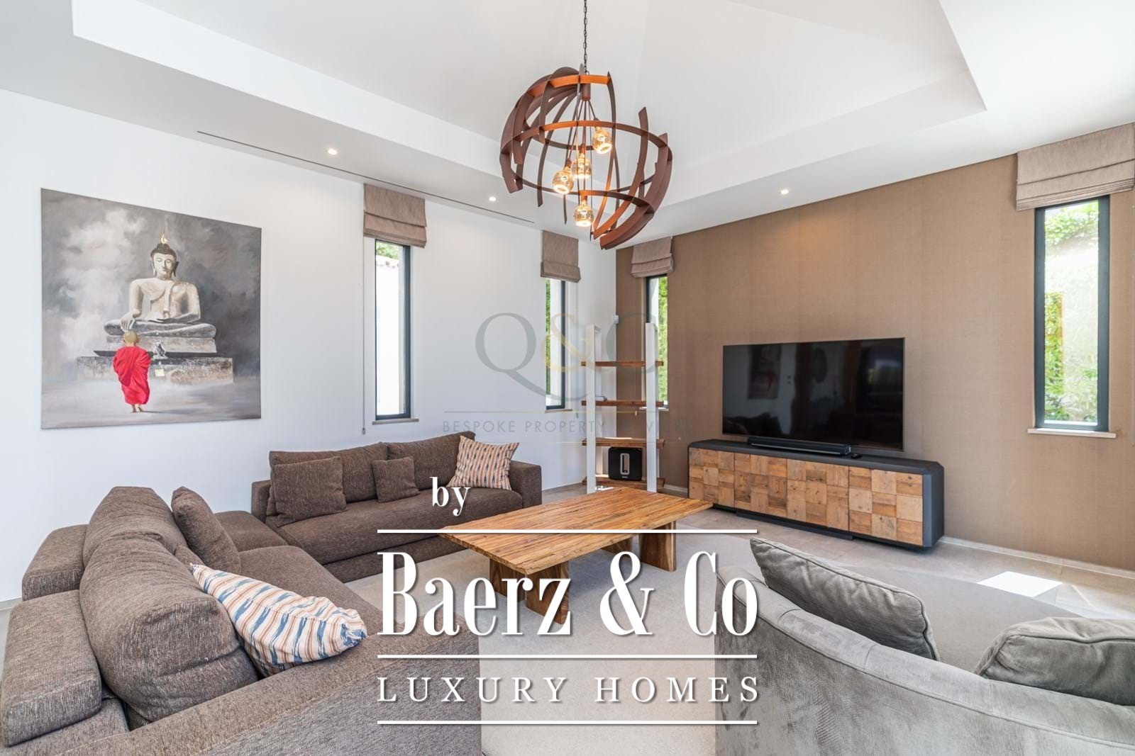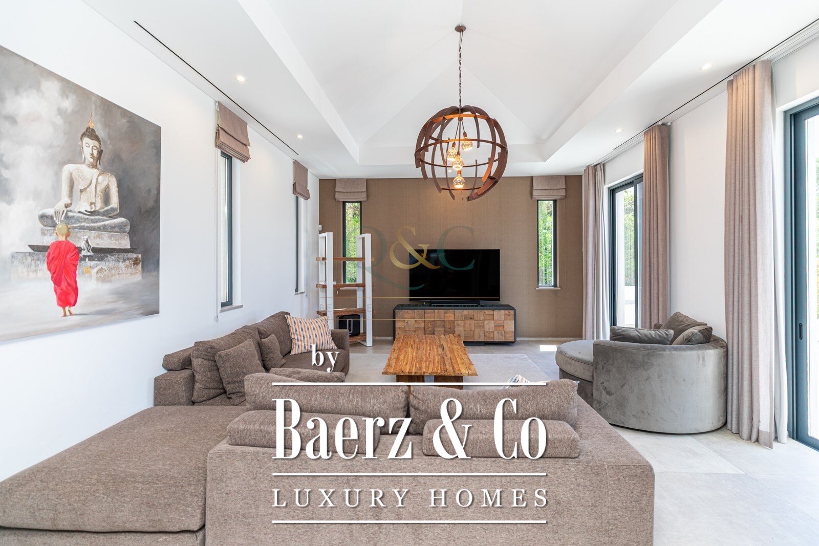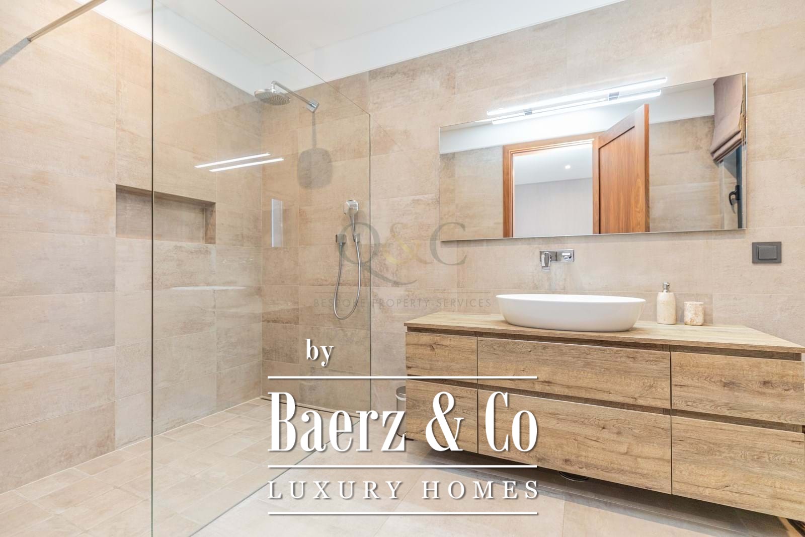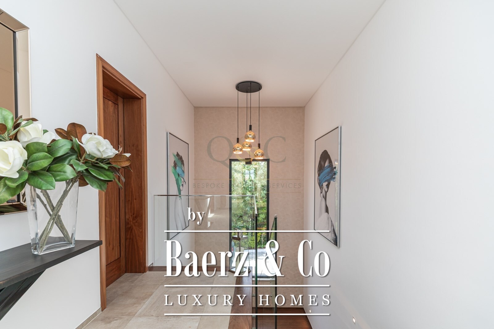 Step through impressive double wooden doors into a grand entrance hall that sets the tone for the entire home. On the ground floor, you'll find a spacious guest suite with private terrace access, a stylish cloakroom, and direct entry to the double garage. The heart of the villa is the expansive open-plan living area, featuring a state-of-the-art kitchen equipped to the highest standards, complete with a multifunctional island and breakfast bar. The dining and living areas are bathed in natural light through full-height glass doors that open onto a covered terrace with BBQ area, manicured gardens, and a stunning saltwater swimming pool pre-installed for heating and designed for both relaxation and entertainment.