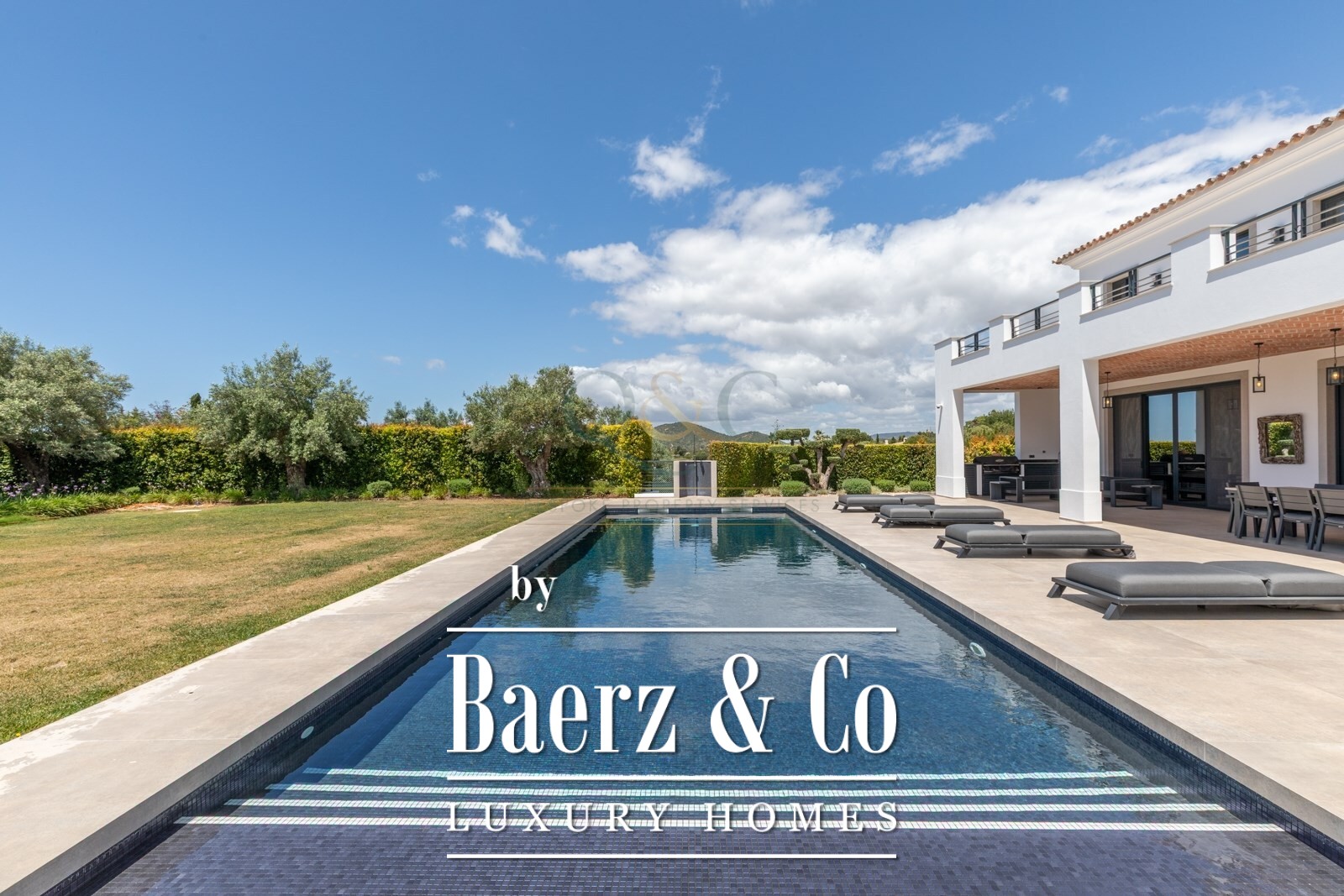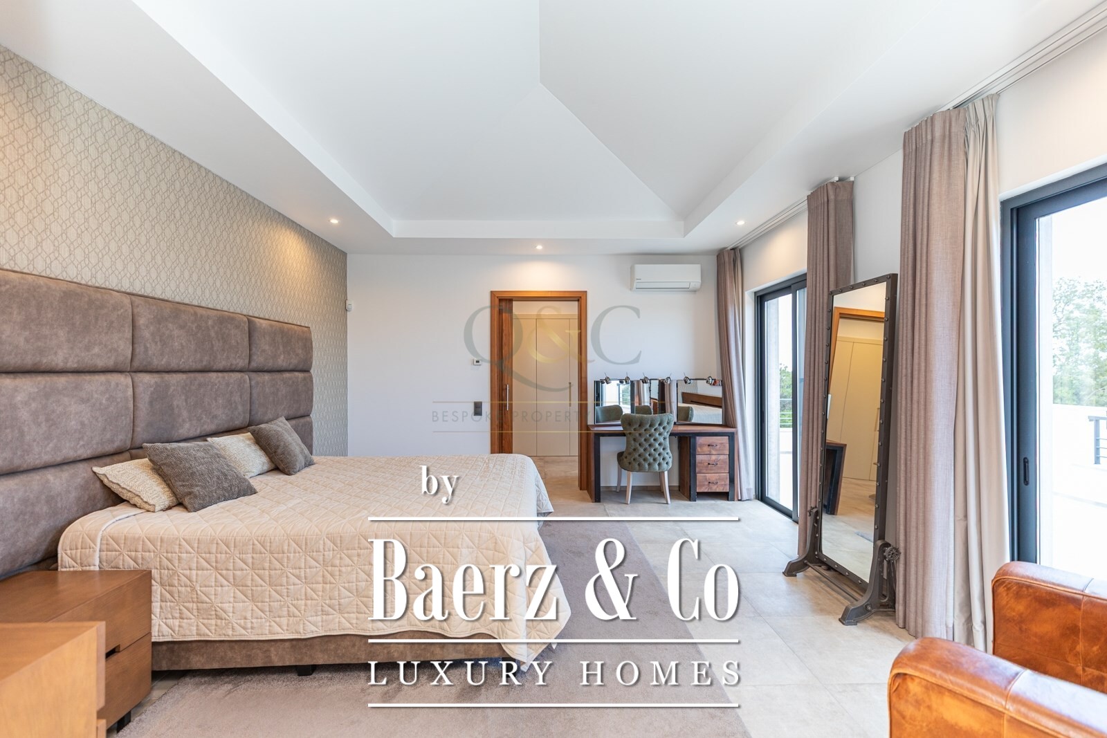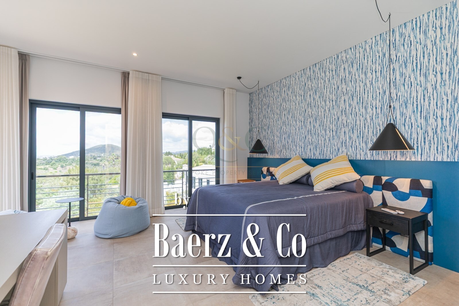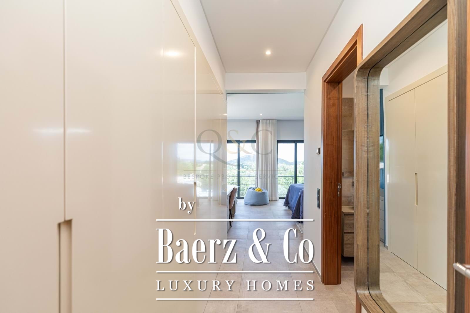 Upstairs, a beautifully crafted wooden staircase leads to a serene landing area. The master suite offers generous space, a dressing area, a sleek modern bathroom, and access to a large private terrace with breathtaking views over the countryside, hills, and coastline. Additional bedroom suites also boast their own terraces with equally captivating vistas.