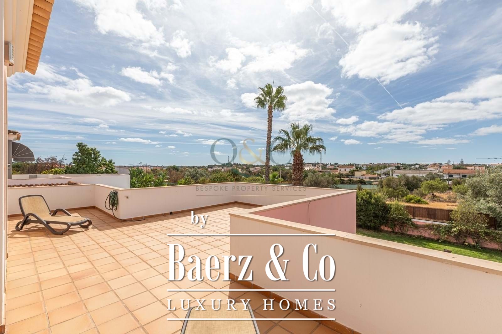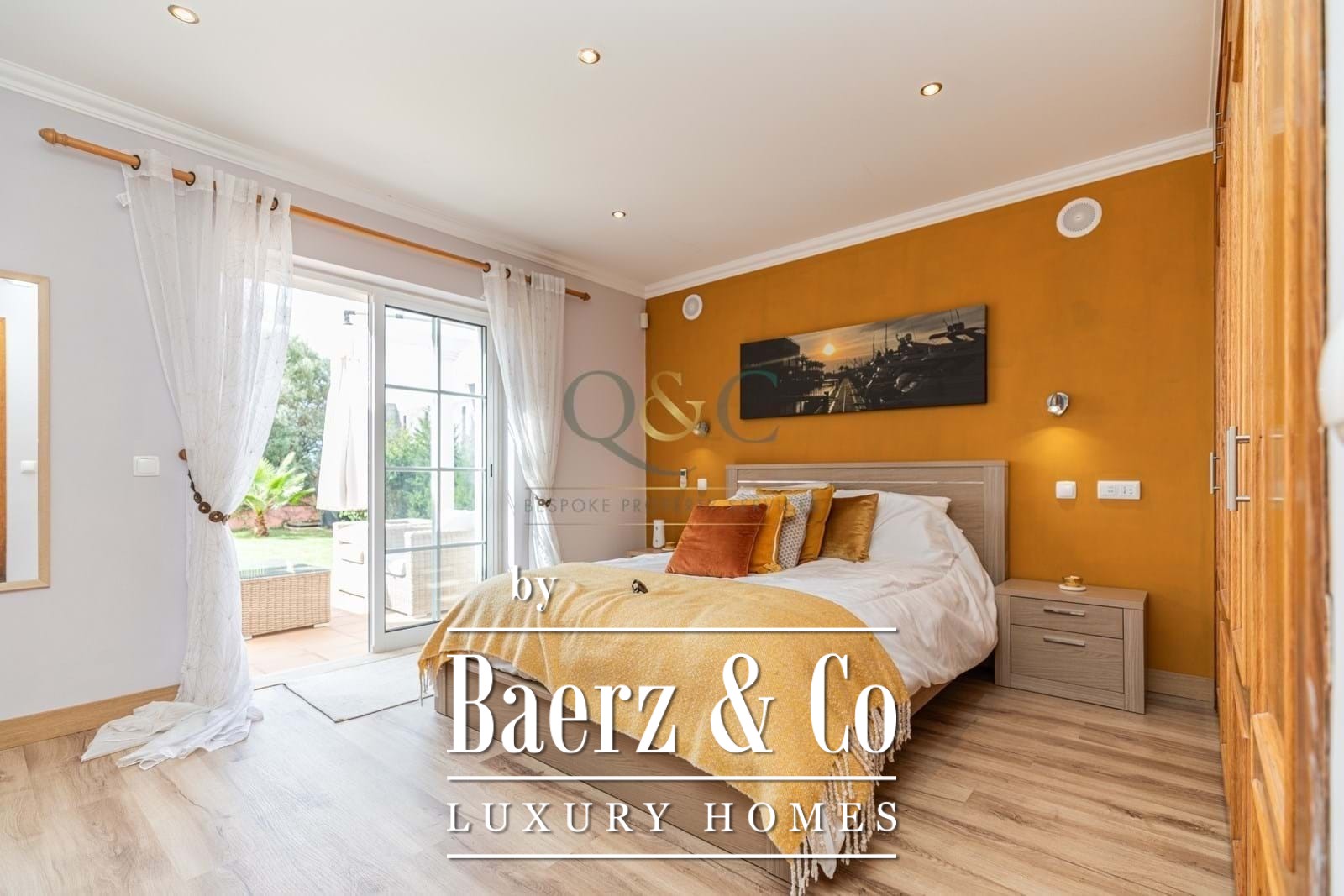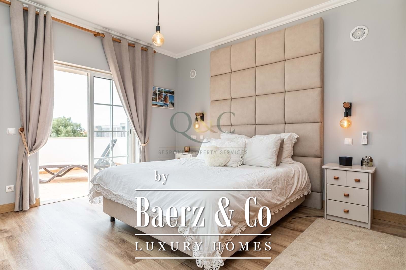 This elegant south facing five bedroom villa is well located to the south of Loule, a short drive to all amenities, beautiful beaches and the resorts of Vale de Lobo and Villamoura. The property which has three storeys has been recently completely renovated creating a pristine, comfortable modern home. The ground floor, which comprises a large open plan living area, is bathed in natural light from the terrace doors which give direct access to the pool and garden, and consists of a splendid new fully fitted kitchen with central aisle, dining and lounge. There is also another separate lounge / tv room on this level, along with two bedrooms and a bathroom. On the first floor are two generous suites which benefit from a spacious south facing terrace overlooking the pool and garden. Back down to the lower level you have a wonderful guest suite with a roll top bath as well as a shower and walk in wardrobe. Adjacent to this suite is a fantastic cinema room with 4k projector, surround sound and luxurious recliner seating. Set in the grounds of the villa is an 8 x 5 heated pool surrounded by a patio with outdoor shower and a fully irrigated fenced garden. The entrance to the property via electric gates offers ample parking on the calcada driveway and access to the garage. This very well presented property offers great potential as a full time family home, a holiday home or as a rental investment.