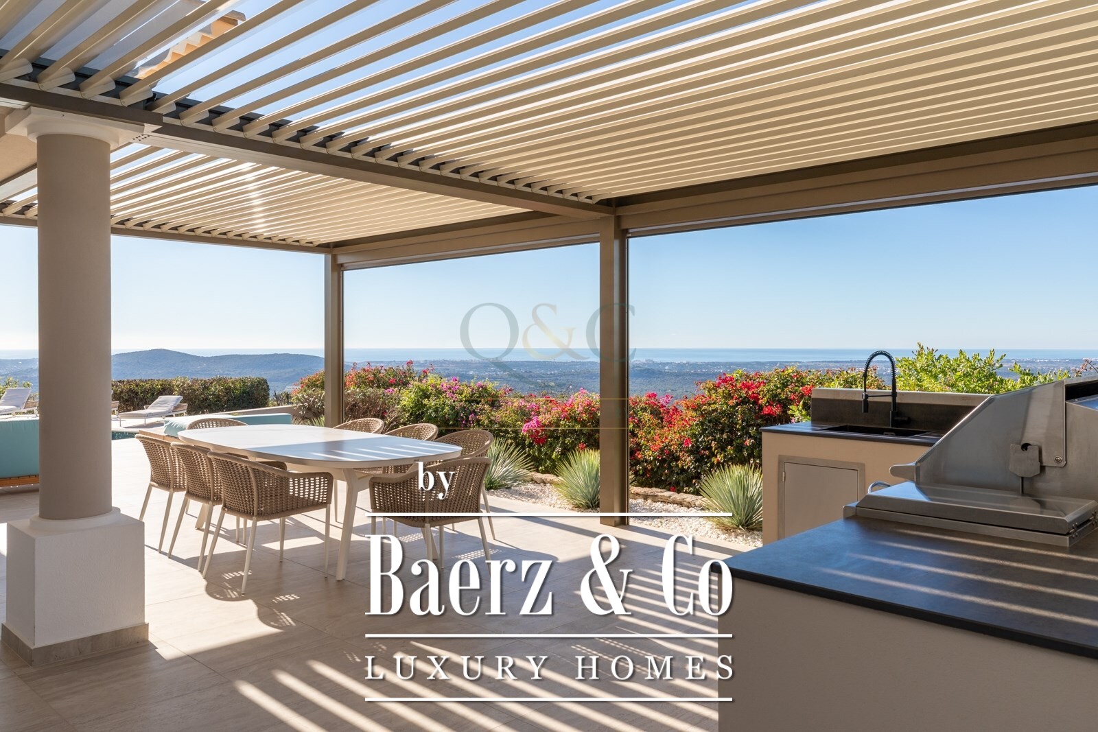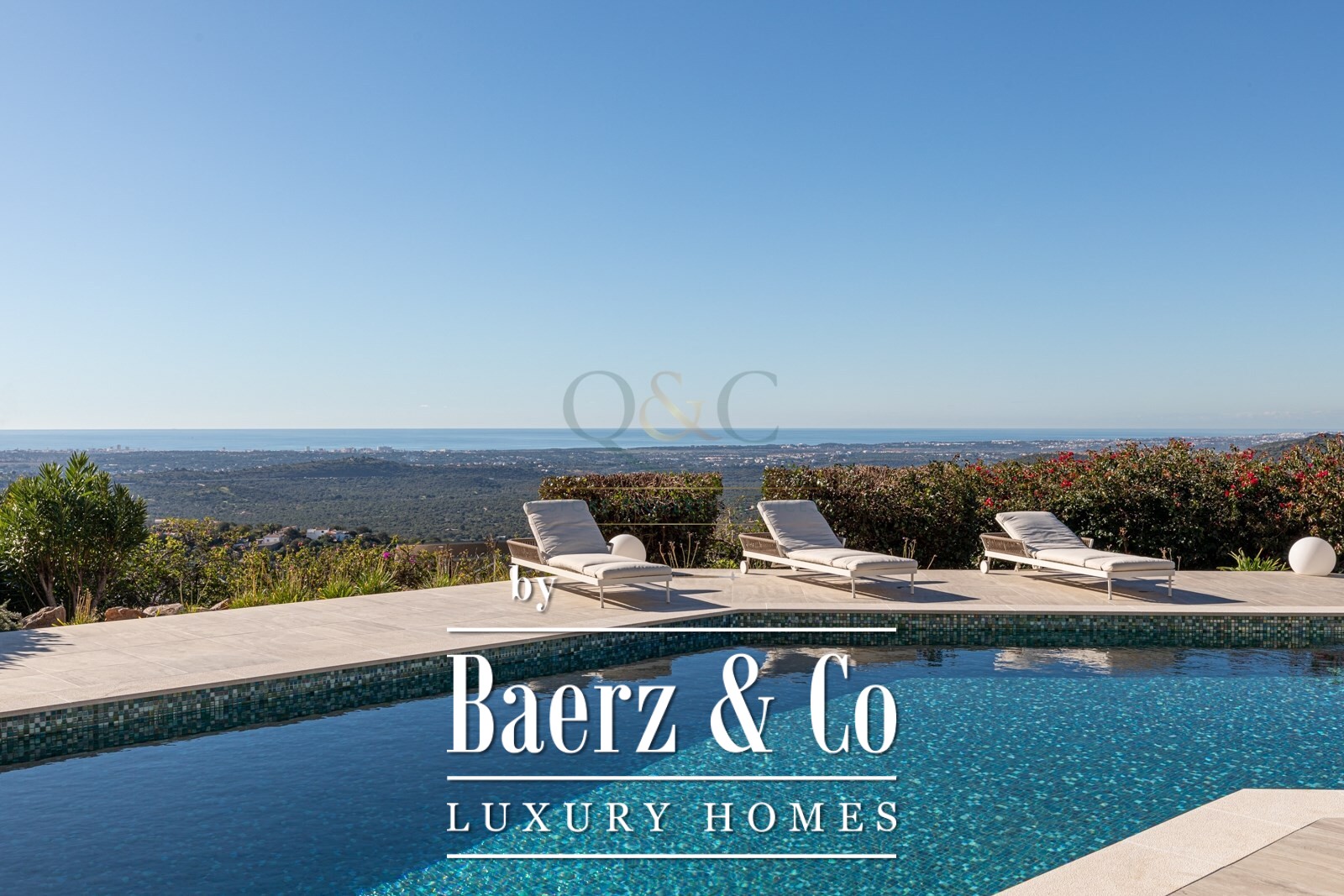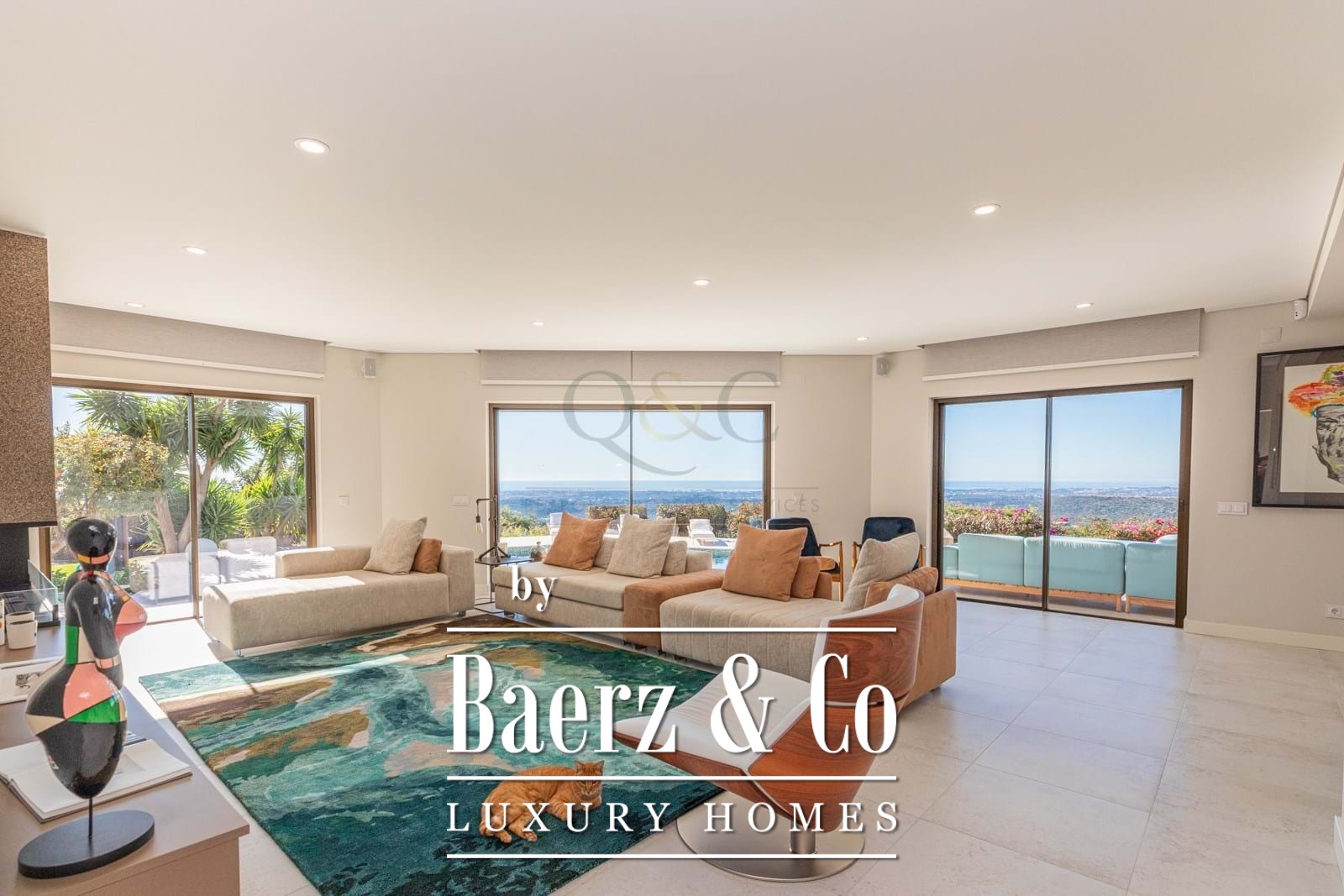 Both levels are encircled by terraces offering sweeping views of the countryside and the sea, with stunning vistas visible from nearly every corner of the home.