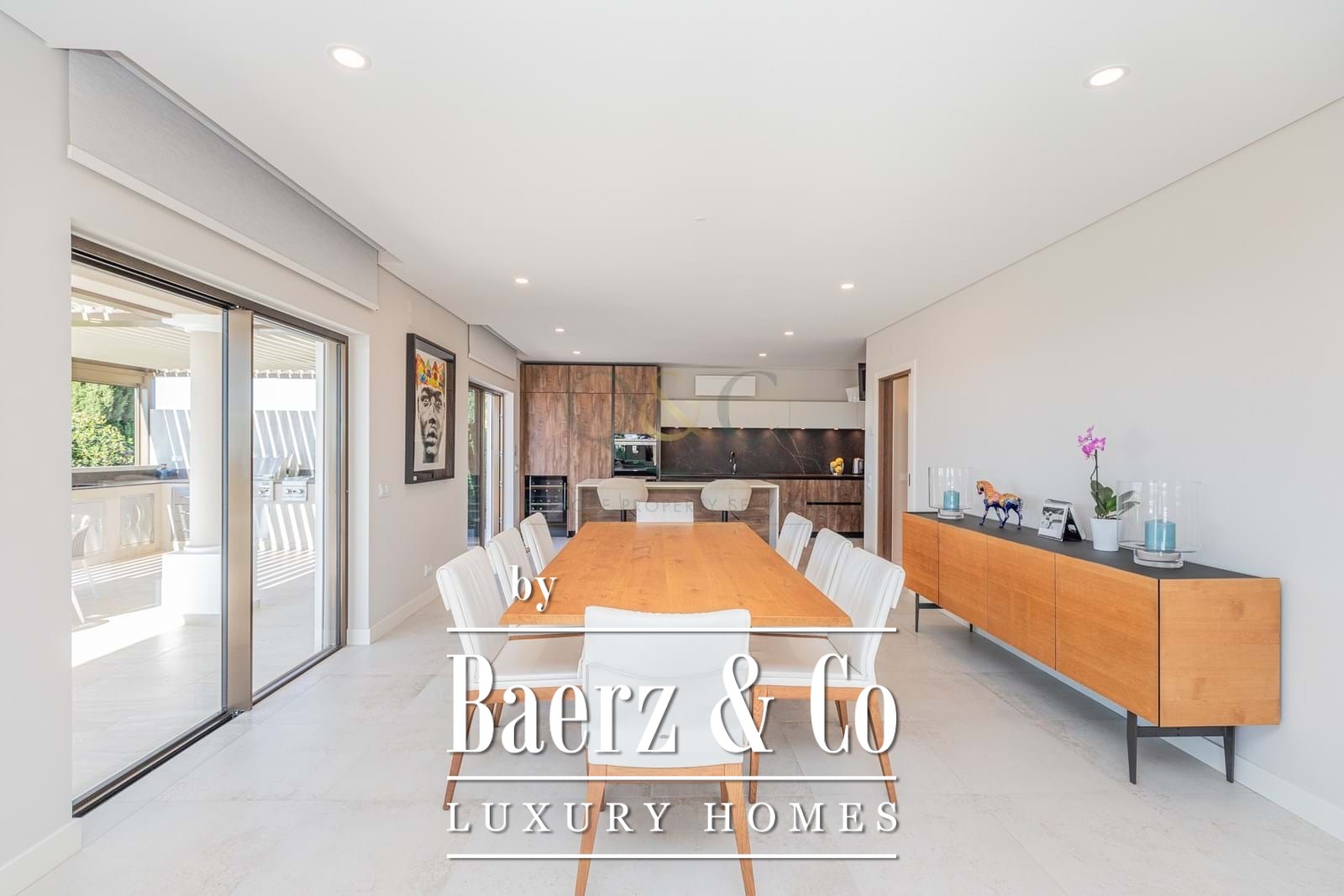 On the ground floor, you'll find a spacious open-plan living and dining area with expansive sliding doors leading to the terraces, a modern fully-fitted kitchen with an island (featuring a BORA hob with integrated extractor), a bedroom currently used as an office, a guest toilet, a storage room, and a covered BBQ terrace ideal for al fresco dining. Additionally, there's a large garage that can easily be converted into an independent studio, gym, or playroom.