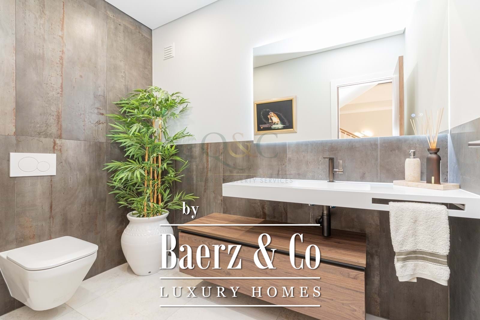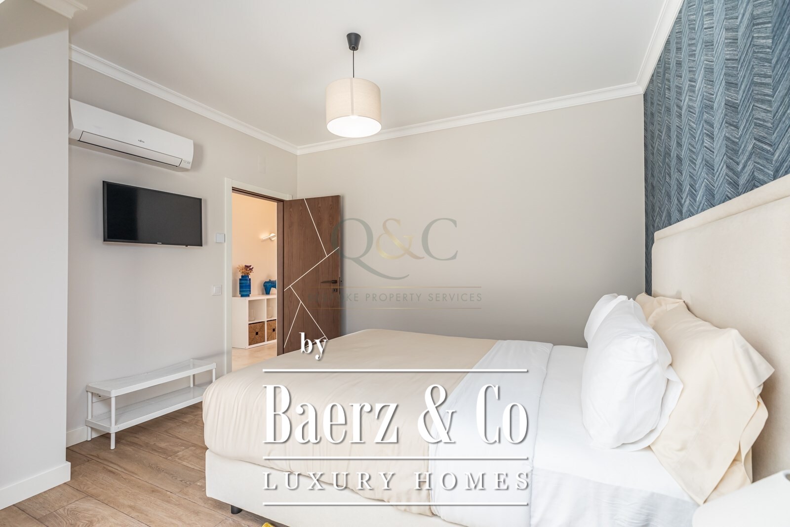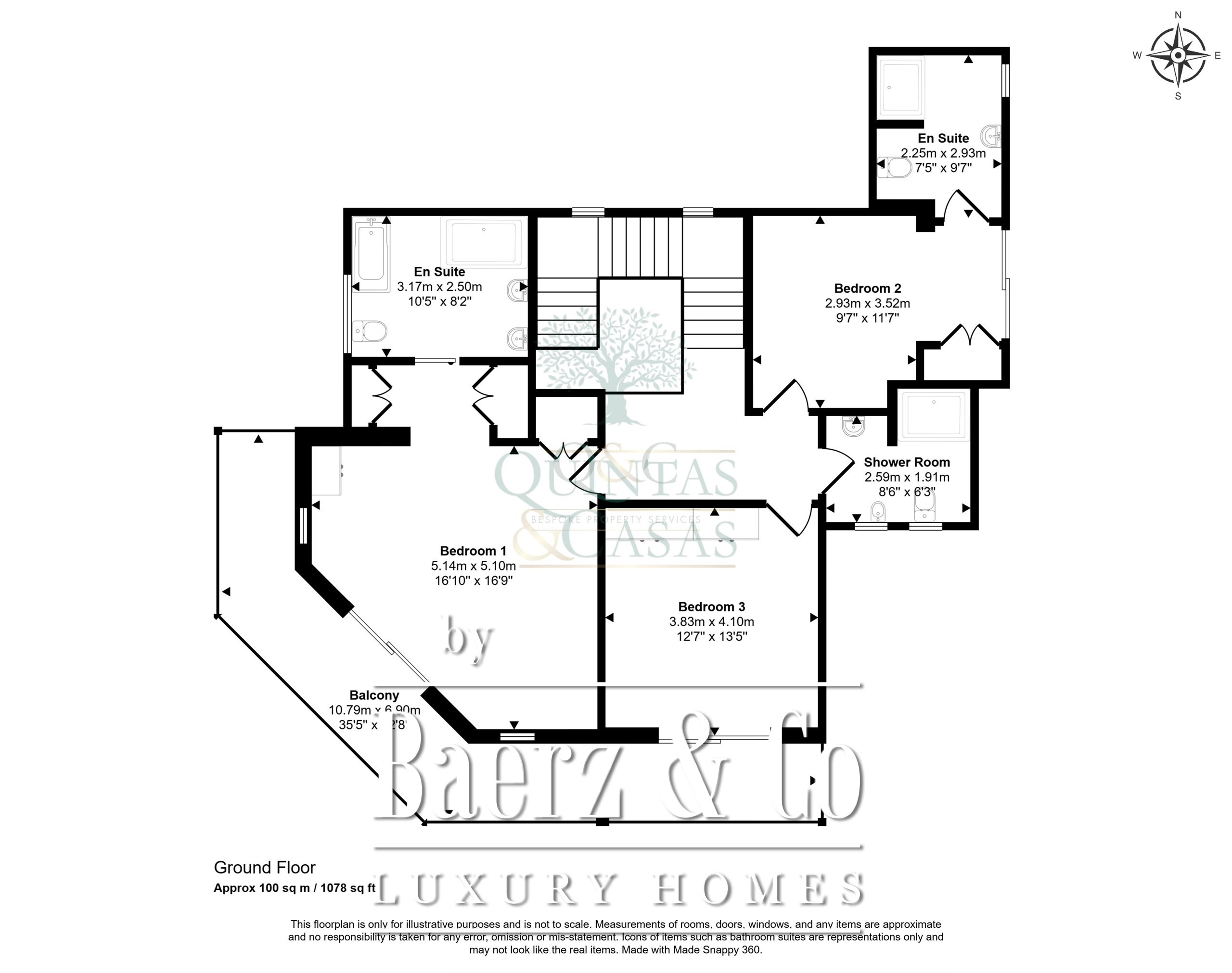 Upstairs, the first floor hosts the luxurious master suite, complete with a walk-in closet and an en-suite bathroom, alongside two additional bedrooms, each with its own en-suite.