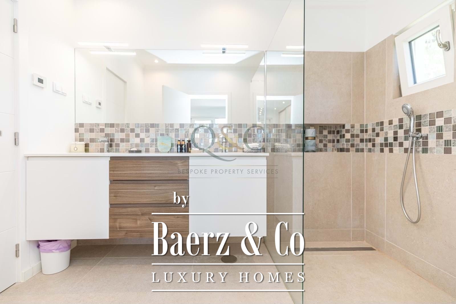 Upon entering the villa you are greeted by a wonderful open plan kitchen and living area with direct access to the outside terrace and pool. Due to the large terrace doors the property is filled with lots of natural light and boasts fantastic sea views across the landscaped garden and pool. Also on the ground floor are a large ensuite bedroom and a second bedroom which is currently being used as a TV room, adjacent to the family bathroom.