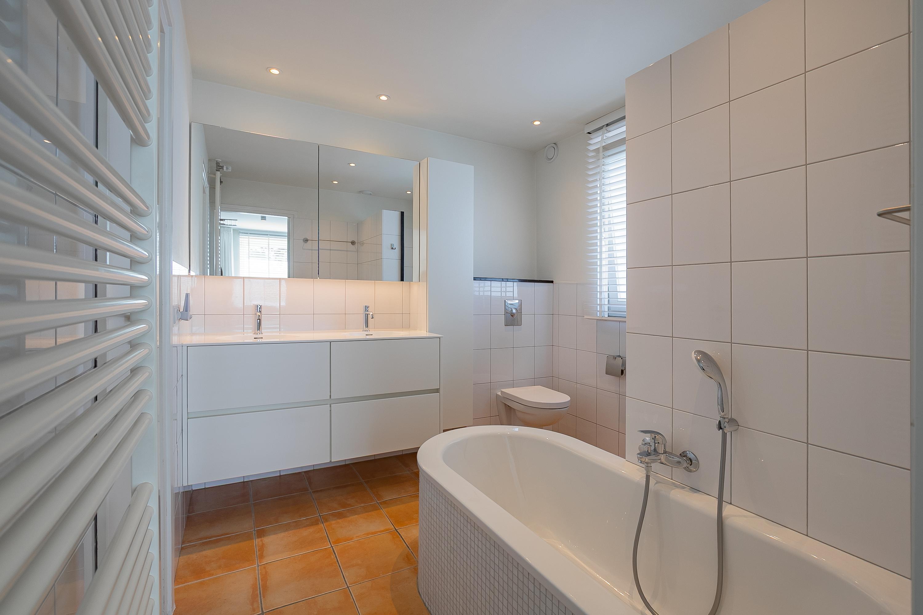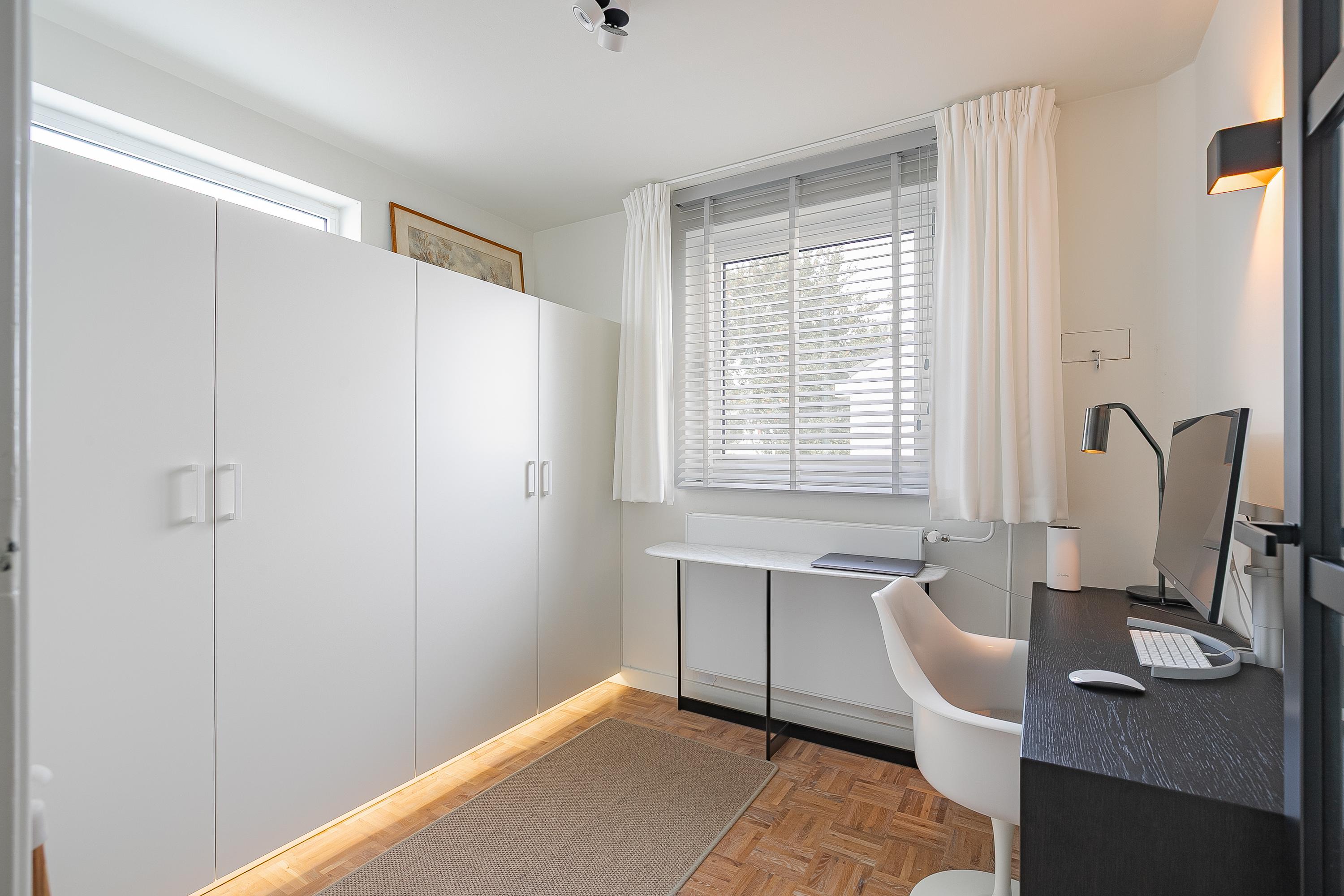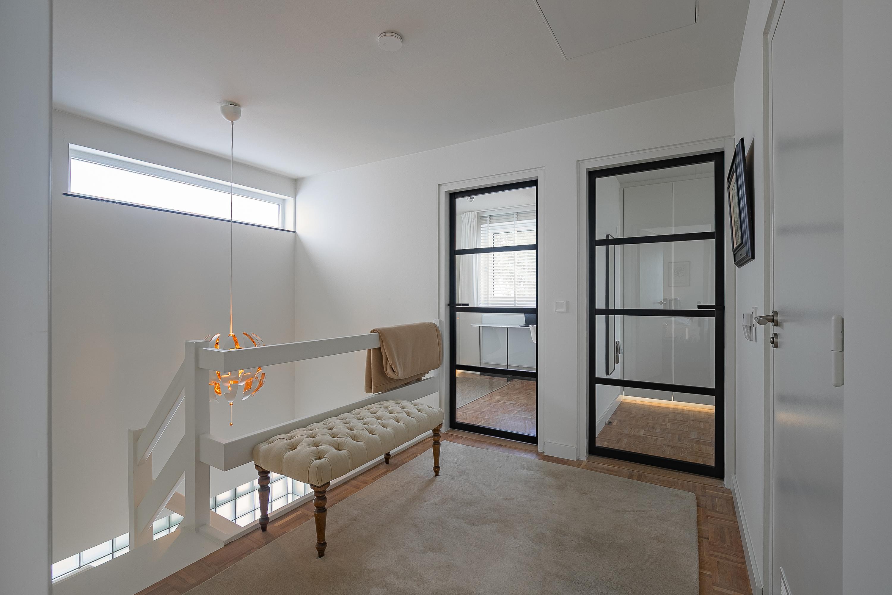 The spacious passage leads to four comfortable bedrooms (approx. 6.7, 8.5, 11.5 and 14.5 m²). The walk-in closet room and the office are equipped with custom-made, stylish built-in cupboards from Slangen Interieurbouw. The other rooms are also practically furnished. The bathroom features mechanical ventilation and is equipped with a bathtub, a walk-in shower, a double sink, and a wall-mounted toilet. All rooms have aluminium window frames with HR++ glazing and are stylishly fitted with mosaic parquet flooring.