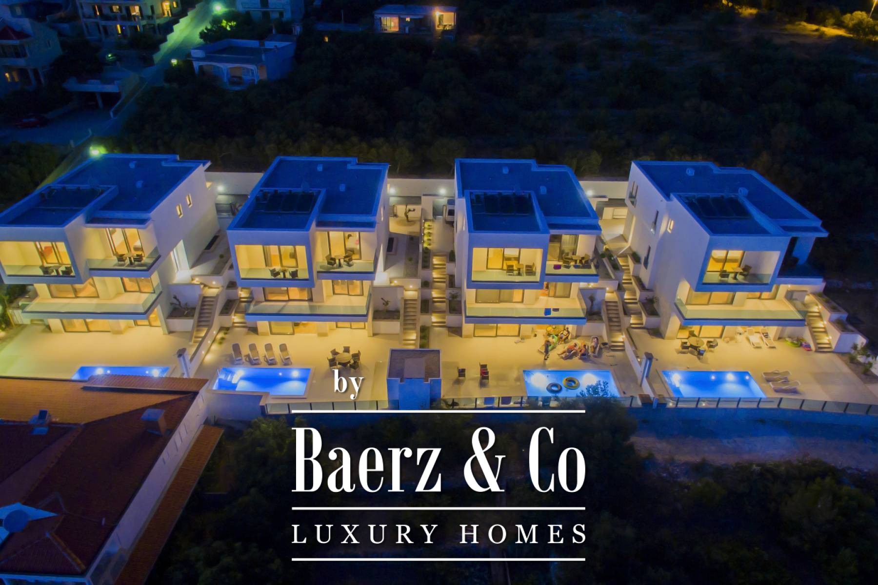 Villa 4 of about 350m2 (basement, ground floor and first floor), and the area of the plot is about 420m2.The villa has an open view of the sea and islands on one side and the mountain Biokovo on the other.The whole complex is carefully designed and fully equipped with all the facilities and equipment needed for housing and many additional benefits.So, the villa has an aesthetically pleasing landscaped garden with its own pool and outdoor fireplace.In the basement there is a large living room with kitchen equipped with all appliances and utensils, bathroom with washing machine, sauna with bathroom, gym, two smaller storage rooms and a boiler room for heating and cooling.A staircase lined with stone leads to the ground floor where the main entrance to the villa and an automated garage for two vehicles.The ground floor of the villa also consists of another, equally large, decorated living room and kitchen with terrace and open views of the sea and islands and