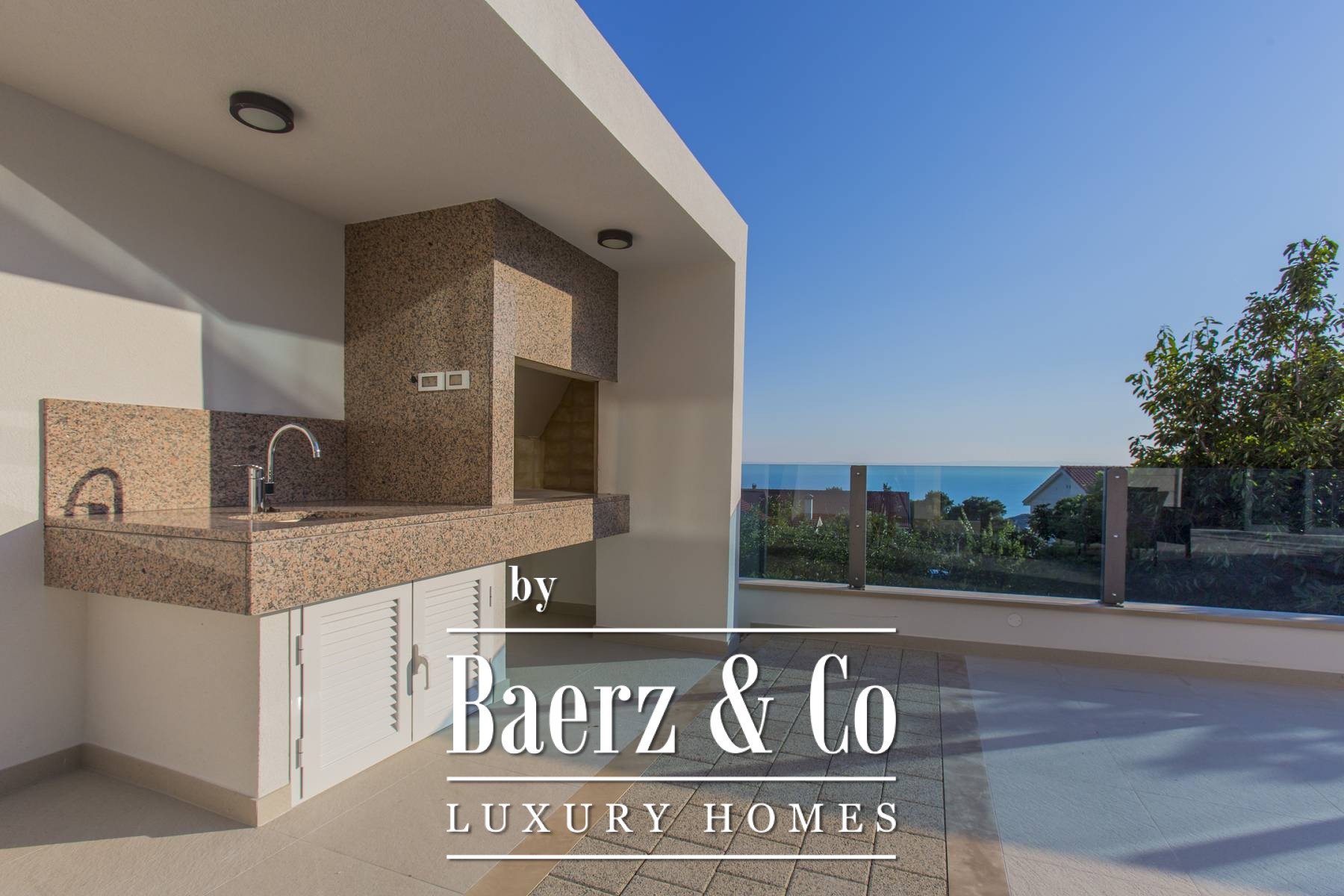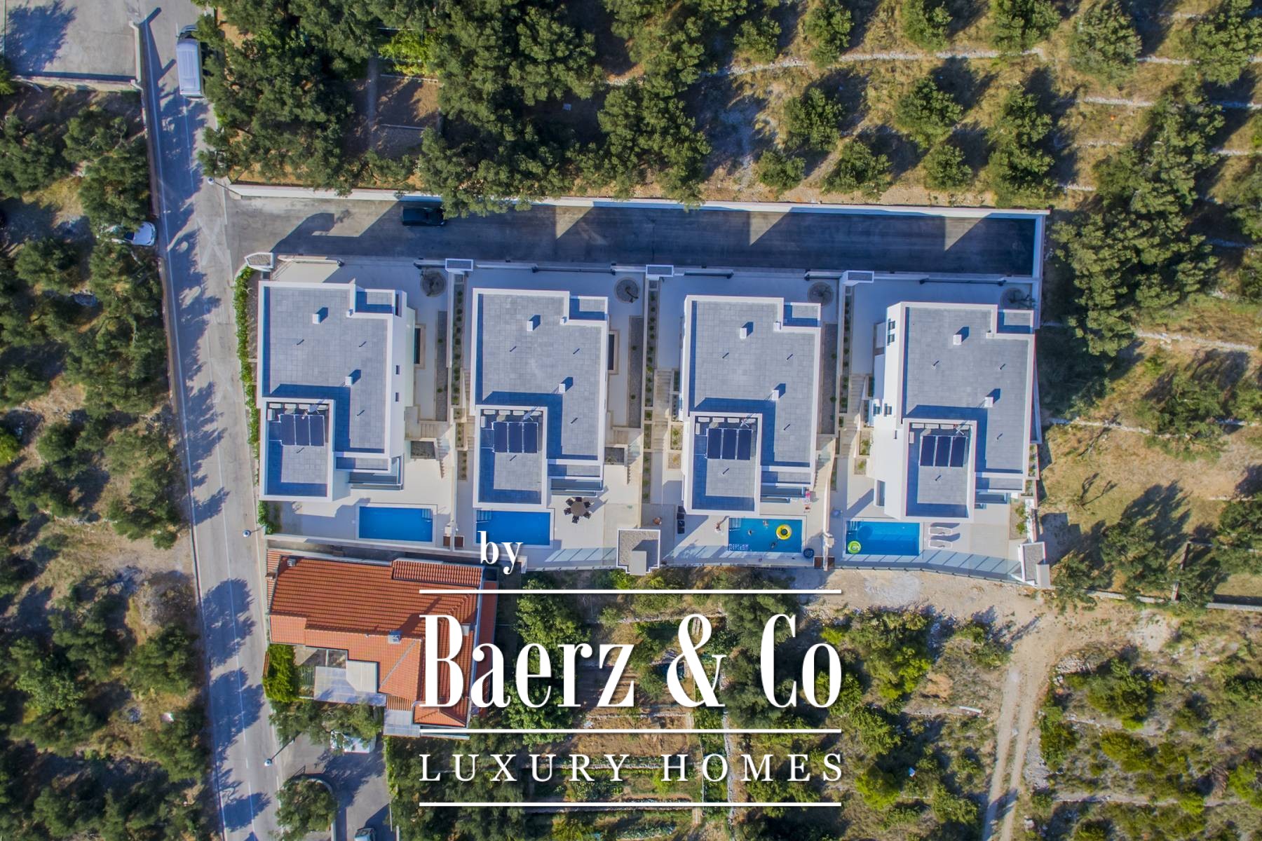 Villa 1 of about 350m2 (basement, ground floor and first floor), and the area of the plot is about 420m2.The villa has an open view of the sea and islands on one side and the mountain Biokovo on the other.The whole complex is carefully designed and fully equipped with all the facilities and equipment needed for housing and many additional benefits.So, the villa has an aesthetically pleasing landscaped garden with its own pool and outdoor fireplace.In the basement there is a large living room with kitchen equipped with all appliances and utensils, bathroom with washing machine, sauna with bathroom, gym, two smaller storage rooms and a boiler room for heating and cooling.A staircase lined with stone leads to the ground floor where the main entrance to the villa and an automated garage for two vehicles.The ground floor of the villa also consists of another, equally large, decorated living room and kitchen with terrace and open views of the sea and islands and