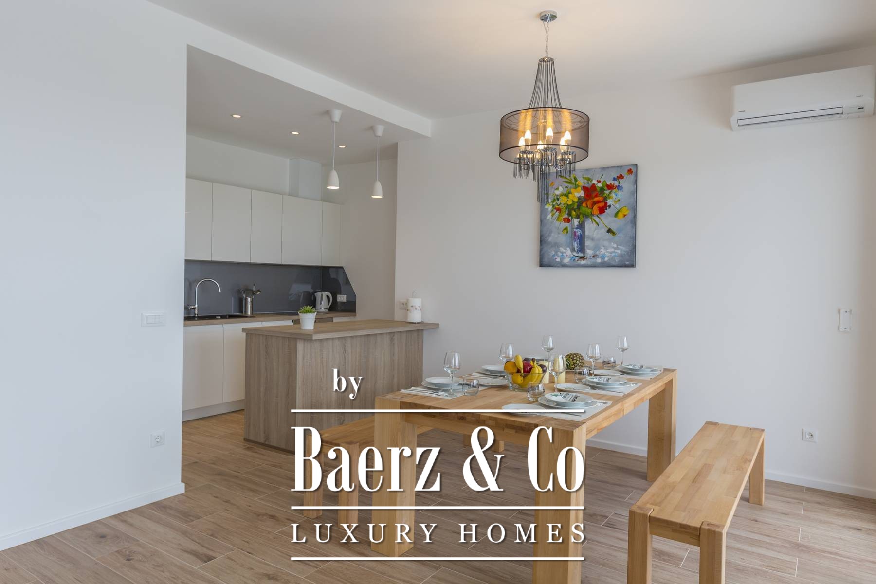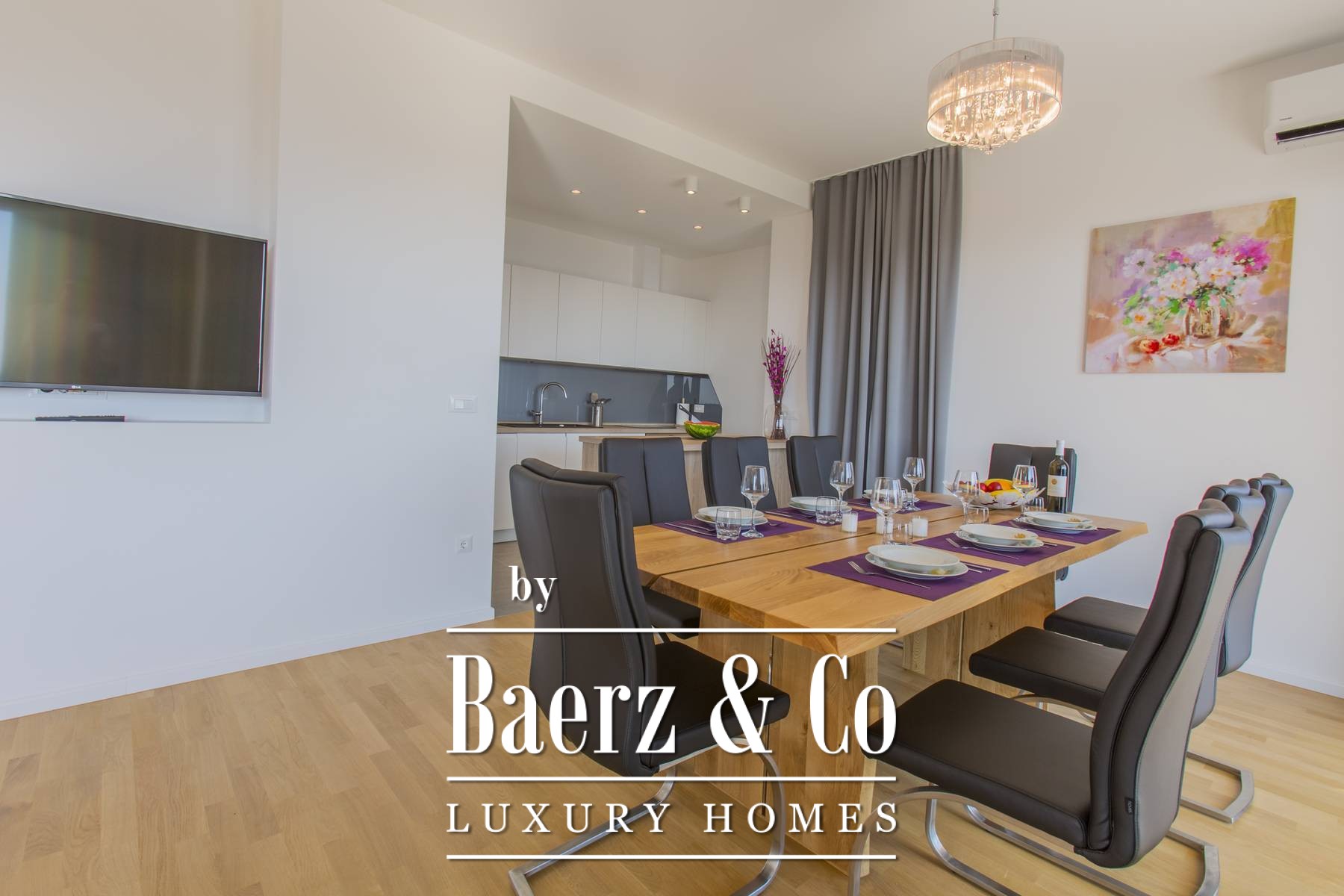 a bathroom with shower.Four bedrooms are located on the first floor of the villa and each has its own bathroom and is equipped with the highest quality double beds and mattresses.Three bedrooms have a terrace with a beautiful view.It is important to note that the air conditioning system covers the entire interior of the building, and the bathrooms have underfloor heating.The rooms and living room on the ground floor have oak parquet floors, and the living room and kitchen in the basement have tiled floors.Sunlight reaches the interior throughout the day due to the large glass walls that are installed on the openings of the villa, and if necessary it is possible to darken the room with "sunblock" curtains.The villa is lined with an 8-10 cm thick layer of glass wool under the outer facade for better insulation.The villa has wireless internet access and cable channels on seven TVs (in the living rooms, bedrooms and gym).For all other information on request.