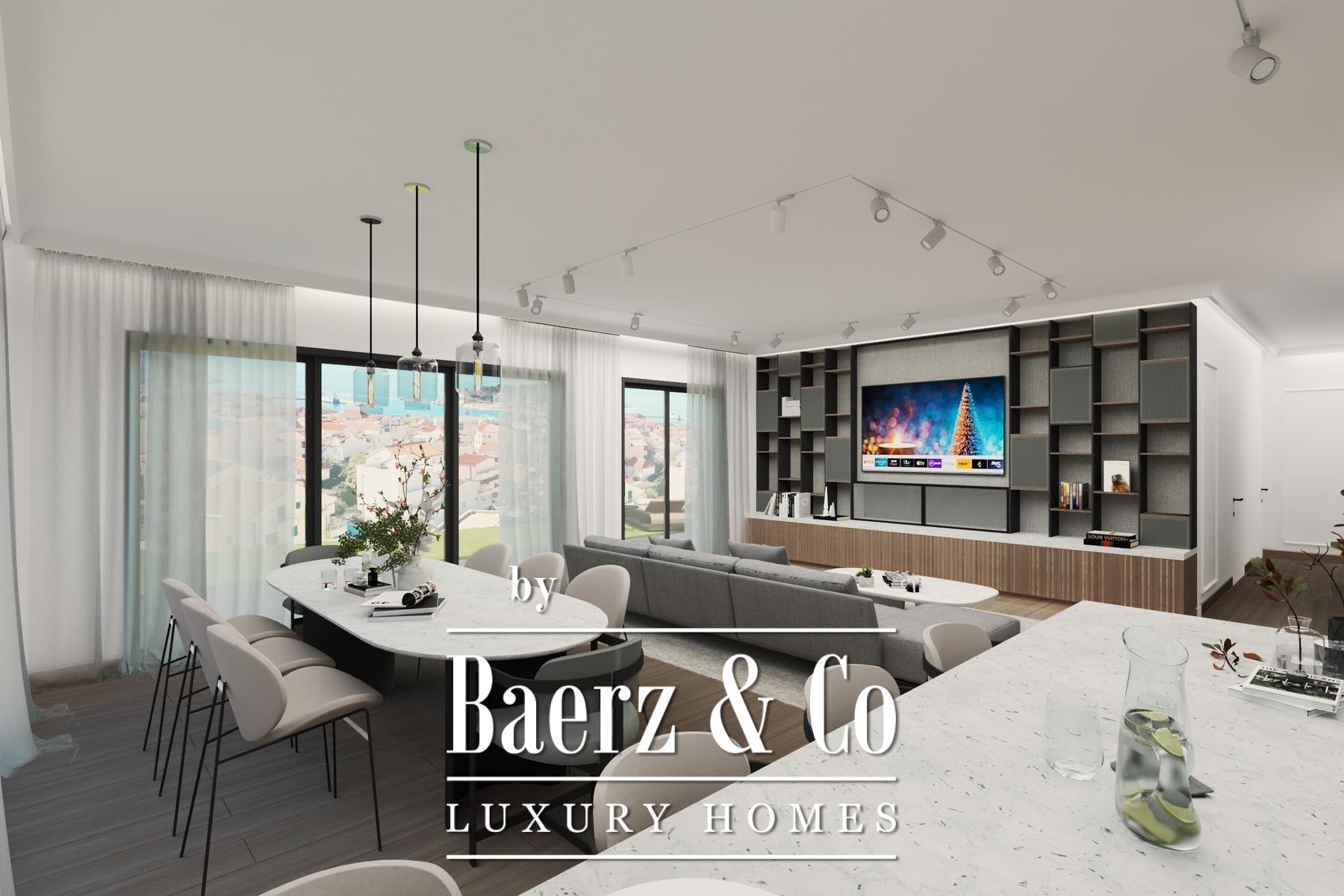 Penthouse apartment Makarska offers an expansive 158 m² of contemporary living in one of Croatia's most sought-after coastal towns. The penthouse commands a unique perspective over the city of Makarska, with light flooding into its large living room, centered around a fireplace—a subtle invitation to both comfort and conviviality.
