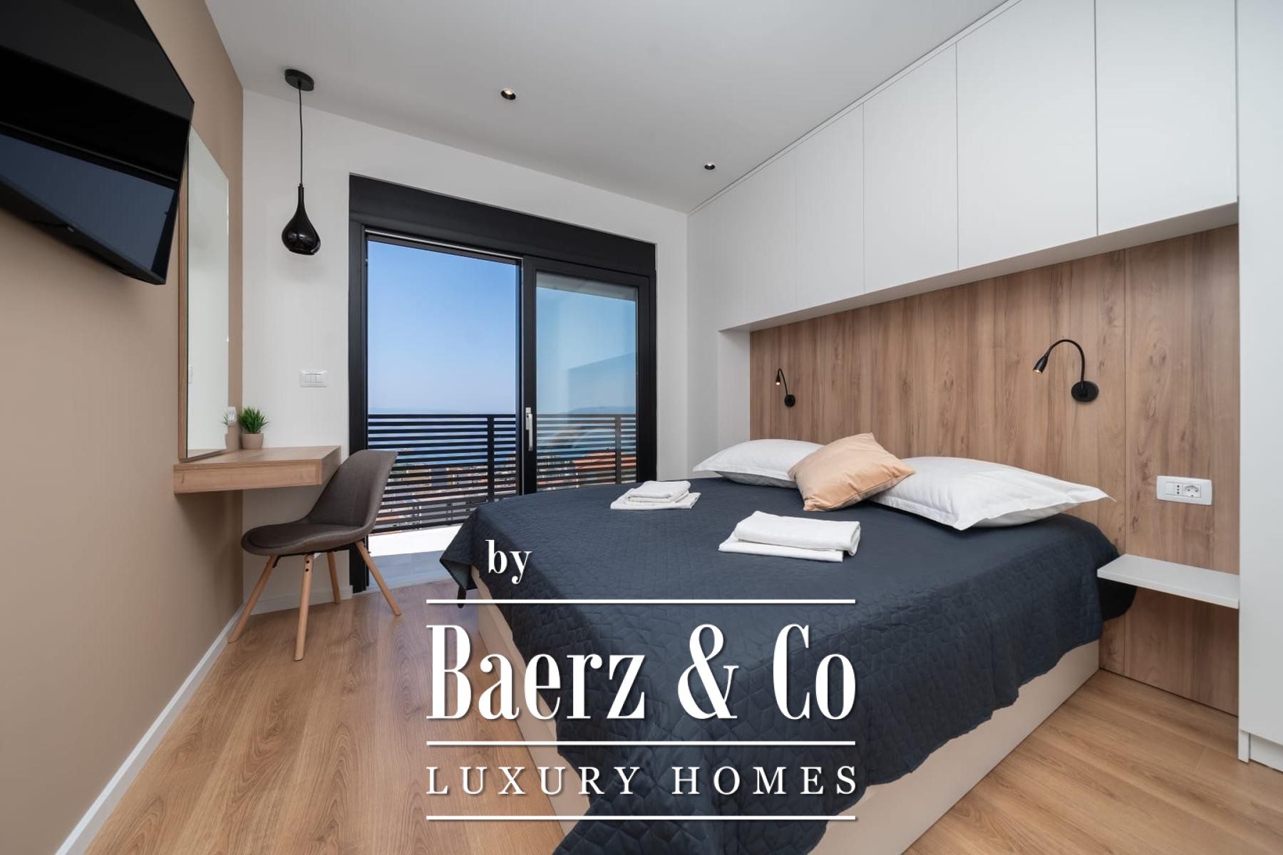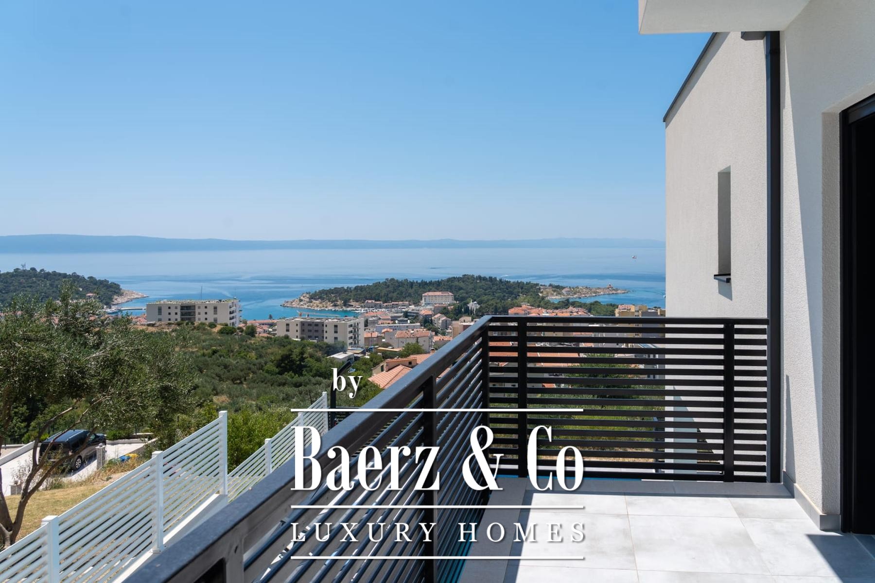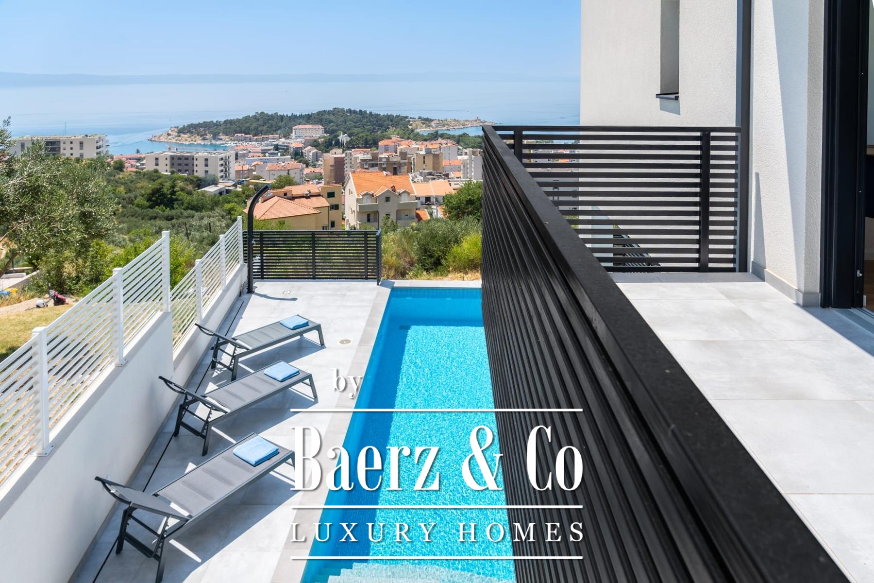 For sale, a two-story apartment with a swimming pool located in the central part of Makarska, about 900 meters from the sea as the crow flies. The apartment is located in a quiet location with an unobstructed view of the city, the sea and the islands.The apartment will consist of a basement where there will be a garage for two cars, a laundry room and an auxiliary room, a ground floor where there will be a living room, a kitchen with a dining room and a toilet, while the living room will have access to a spacious terrace with a 24m2 pool. There will be three