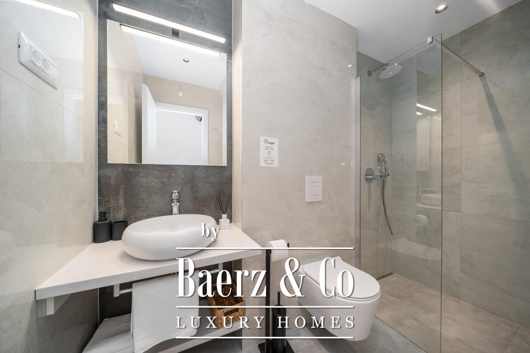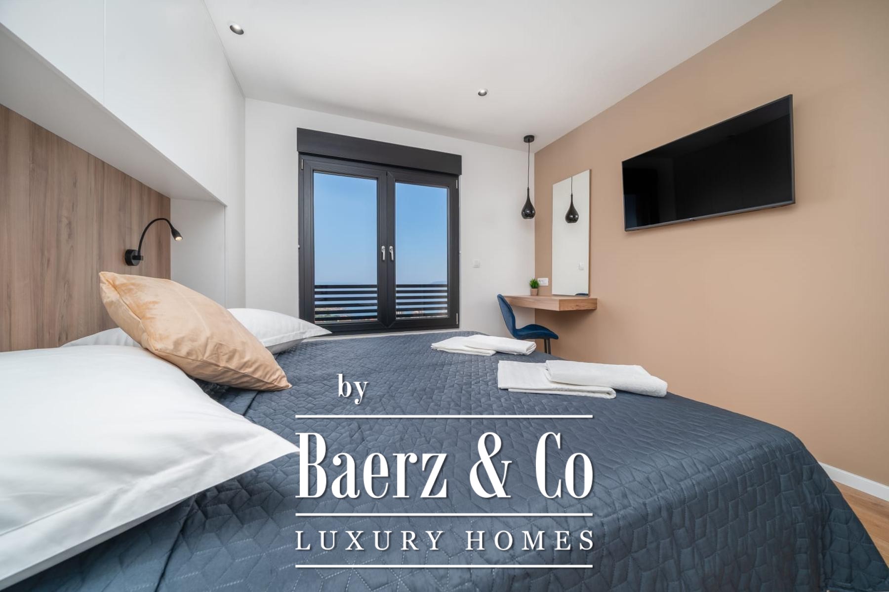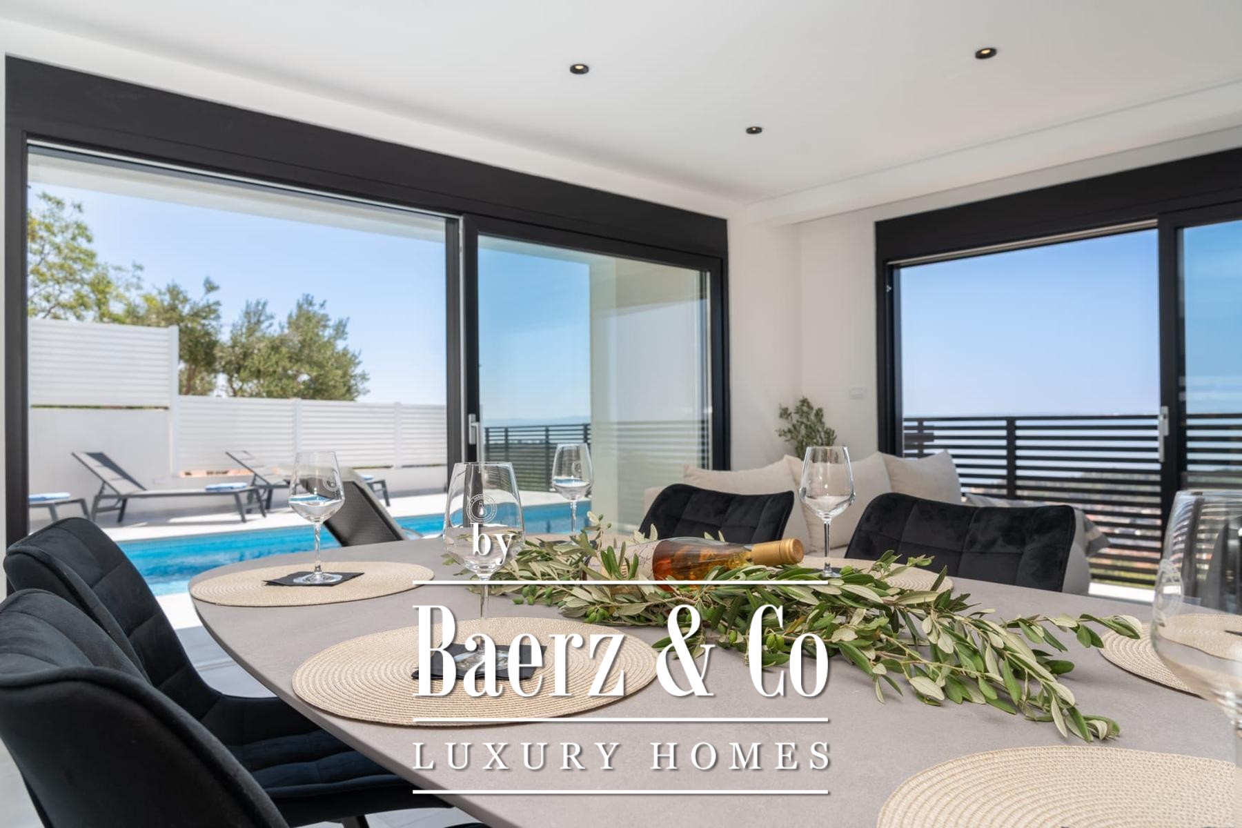 For sale, a two-story apartment with a swimming pool located in the central part of Makarska, about 900 meters from the sea as the crow flies. The apartment is located in a quiet location with an unobstructed view of the city, the sea and the islands.The apartment will consist of a basement where there will be a garage for two cars, a laundry room and an auxiliary room, a ground floor where there will be a living room, a kitchen with a dining room and a toilet, while the living room will have access to a spacious terrace with a 24m2 pool. There will be three