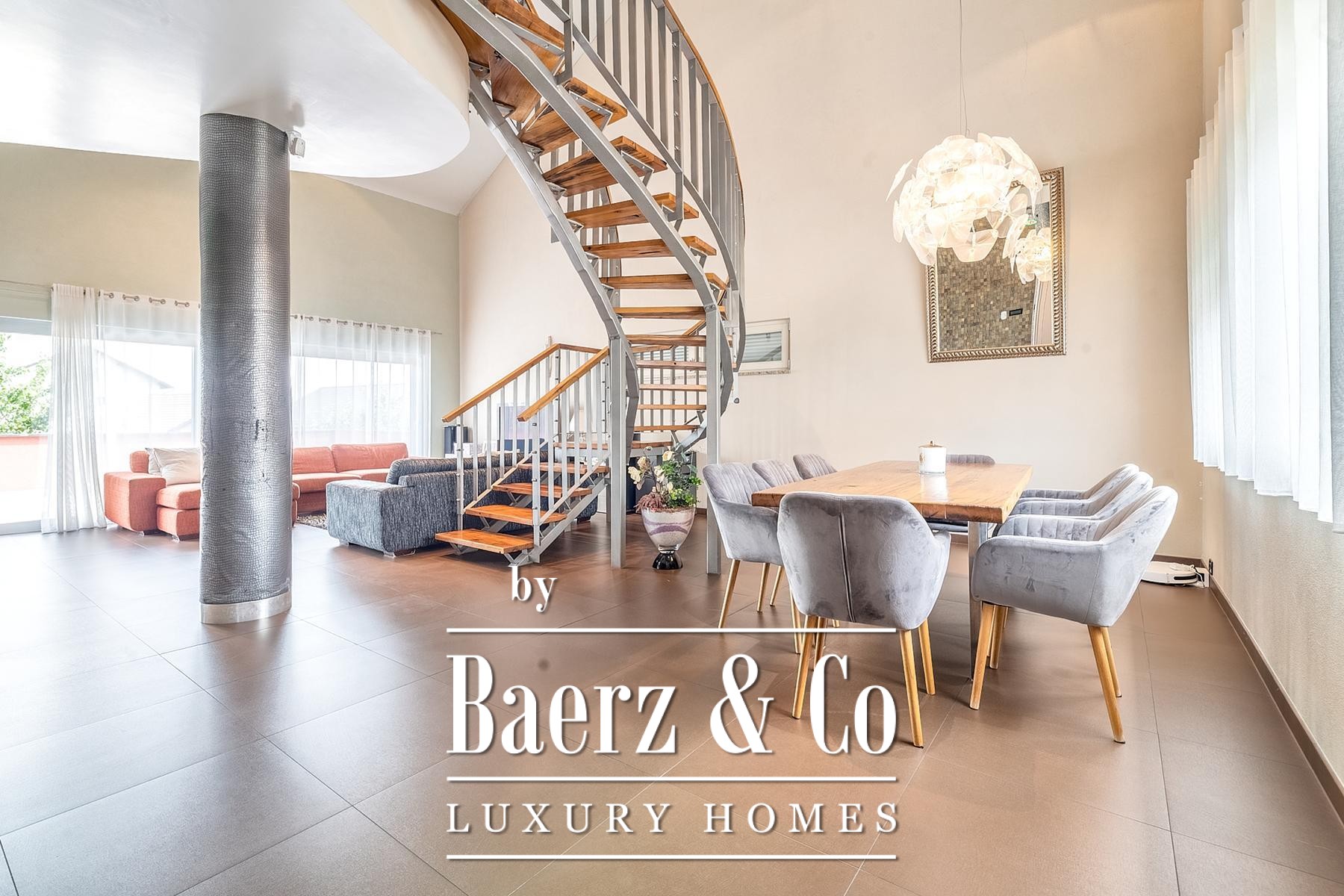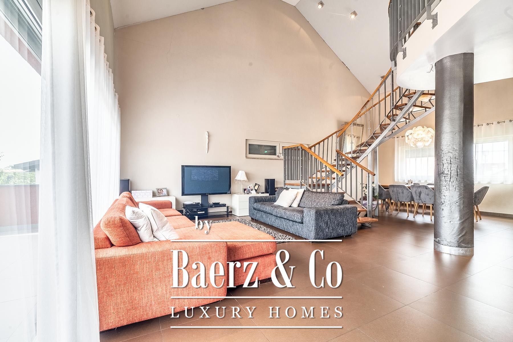 Ascending to the first and second floors, a two-story apartment unfolds with an expansive living area, kitchen, terrace, and a dedicated master suite separated by a large walk-in closet. The top floor features two further bedrooms, a gallery, bathroom, and balcony, each space illuminated by carefully considered glazing.