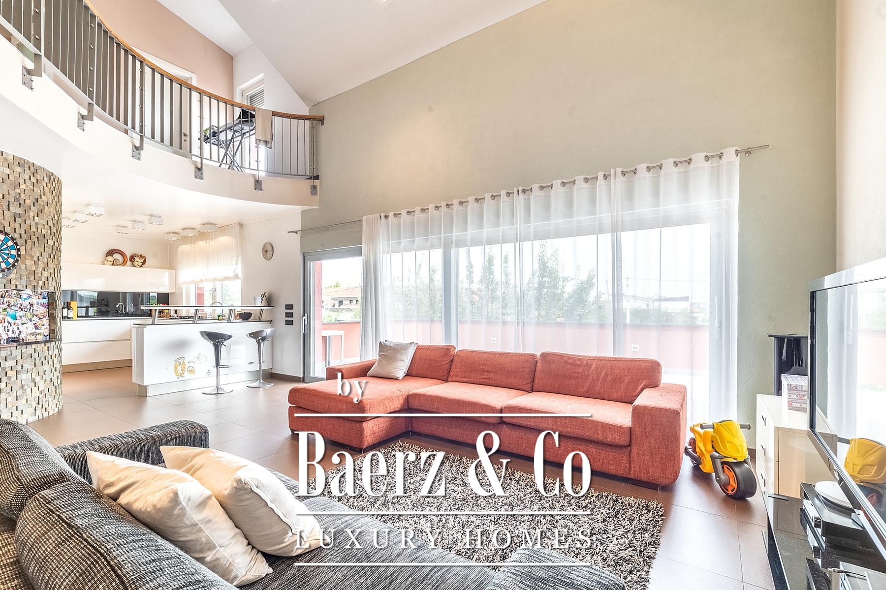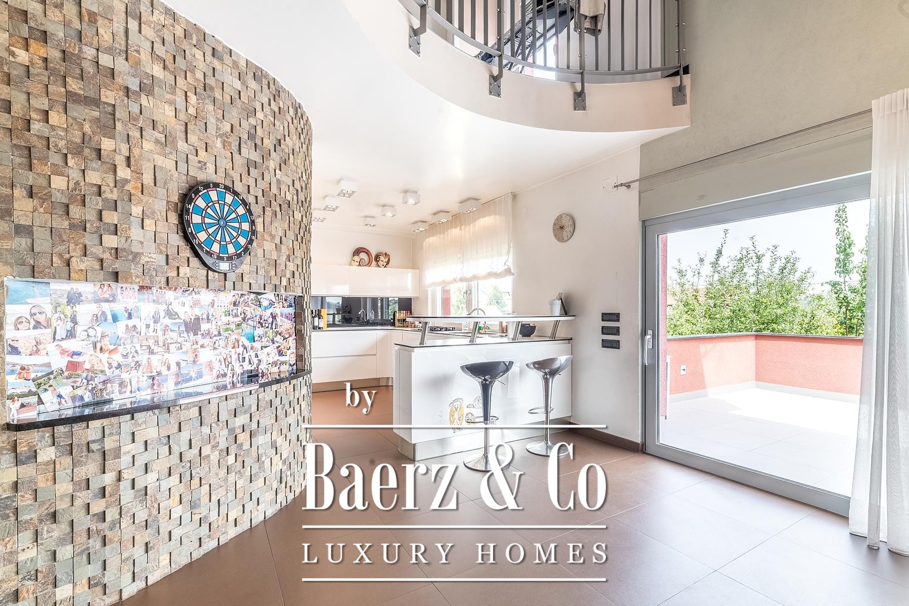 The architectural layout spans four levels, connected by a central staircase that grounds the property in calm, cohesive rhythm. The basement features a tavern-style kitchen and dining area equipped with a grill and oven, alongside a wine cellar and guest facilities. The ground floor is organized around a three-room apartment with open living, dining, and kitchen, all flowing directly onto a terrace and garden. A heated garage with internal access, storage, and laundry underscore functional sophistication.