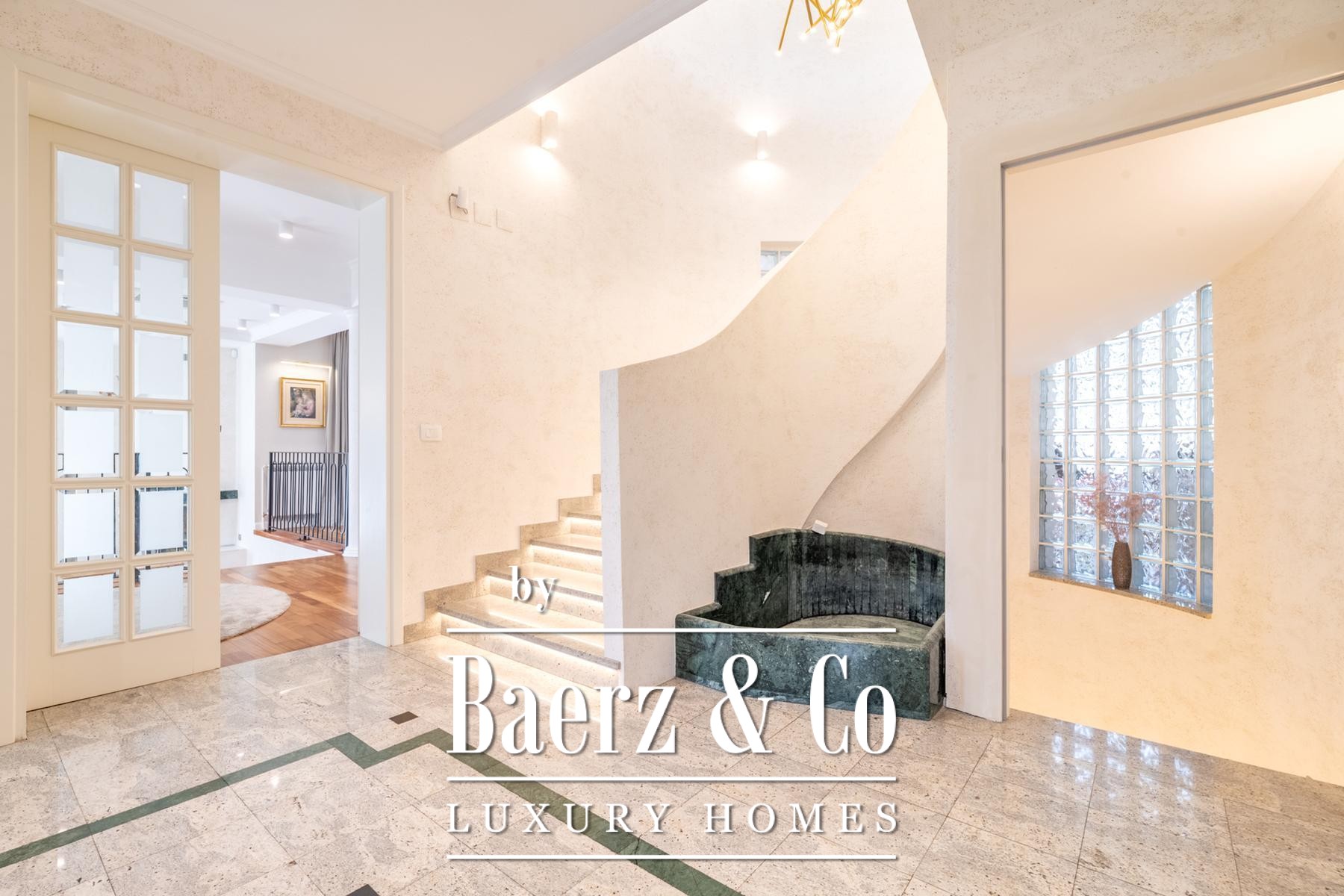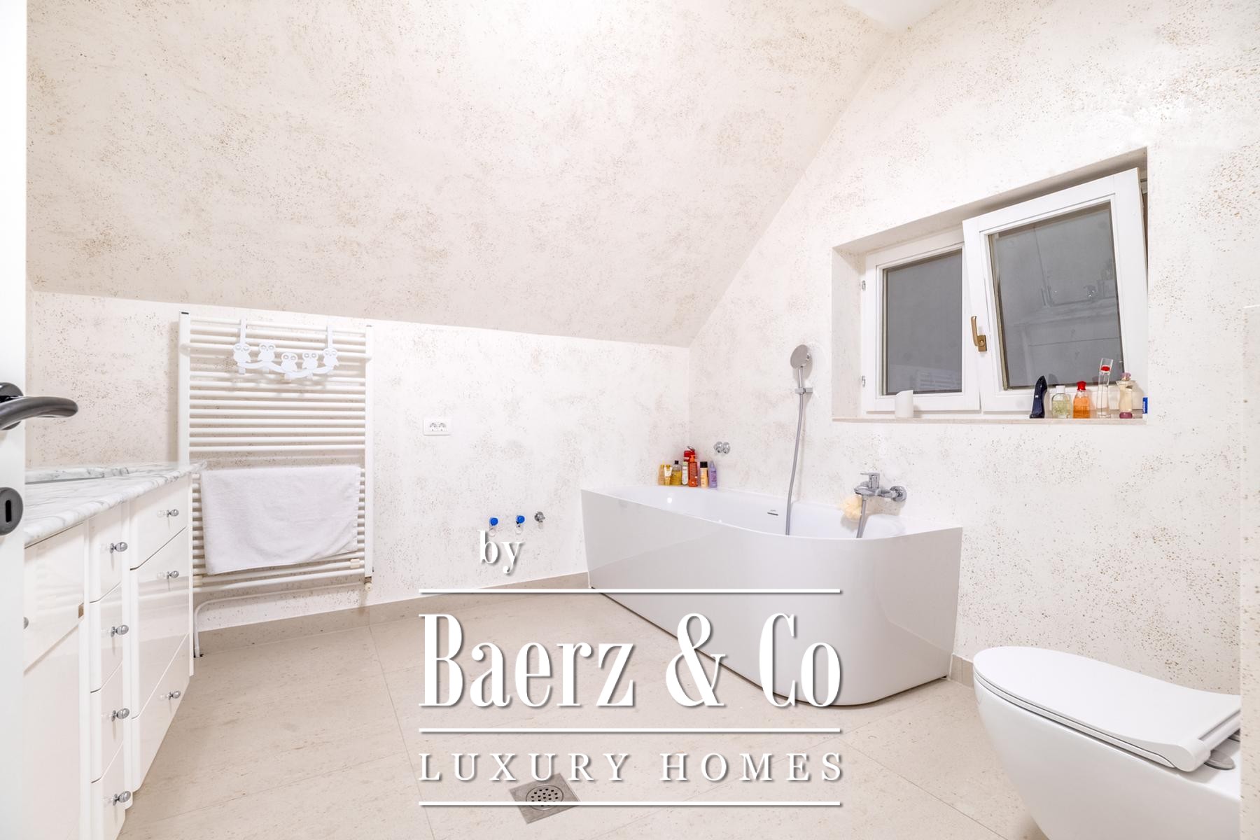 On the main floor there is a spacious entrance hall, guest toilet, one bedroom with private bathroom, living room with fireplace, dining room and kitchen. The living area opens onto a terrace and garden with swimming pool. The garden includes a gazebo and private parking with capacity for 7 to 8 cars. The property is equipped with PVC joinery, an alarm system and video surveillance.