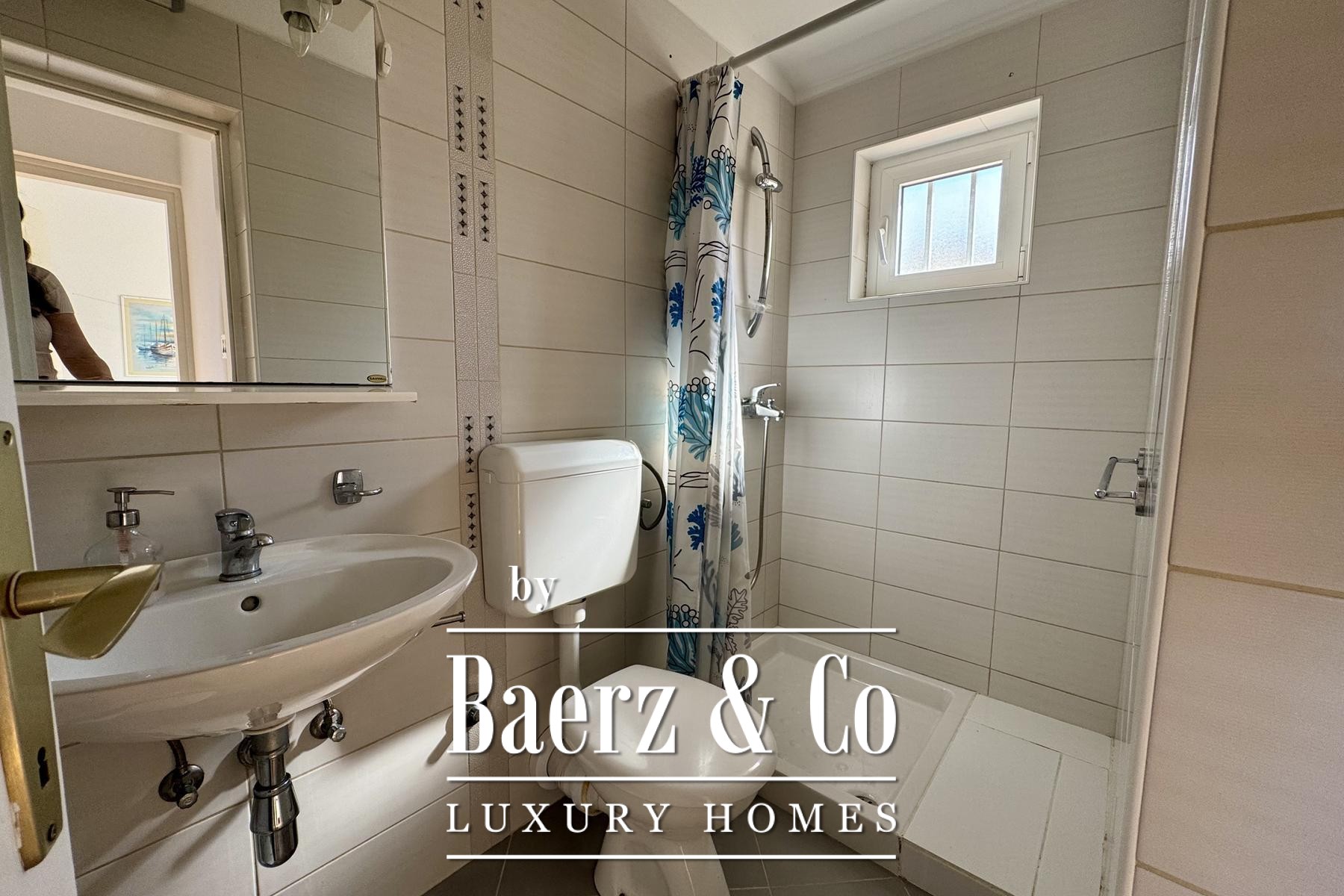 The main two-story apartment features two bedrooms, two bathrooms, a storage room, and a generous open-plan living area. Natural light fills the interior, connecting seamlessly to a covered terrace and two balconies, each framing glimpses of the Adriatic and the ever-changing Mediterranean light.