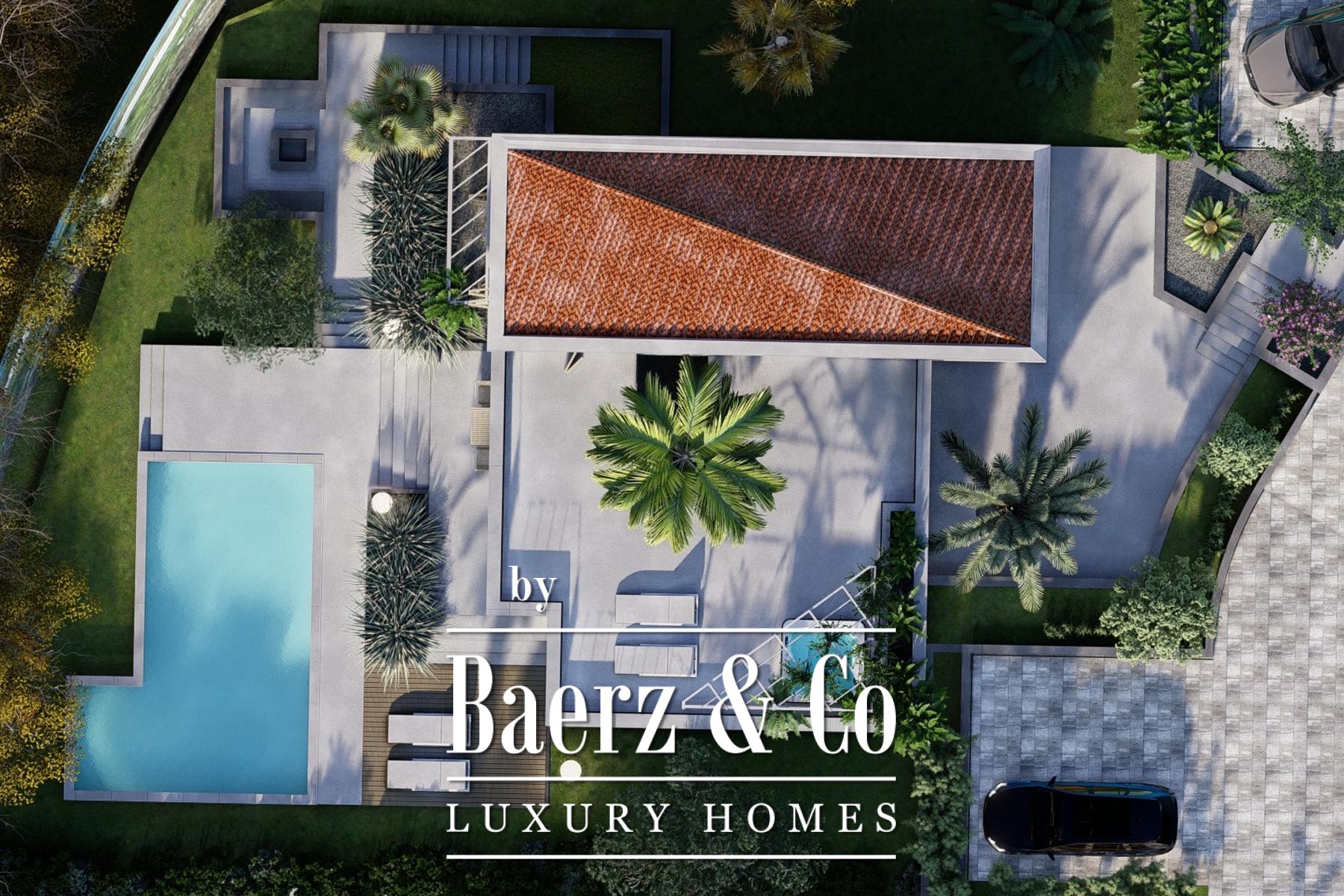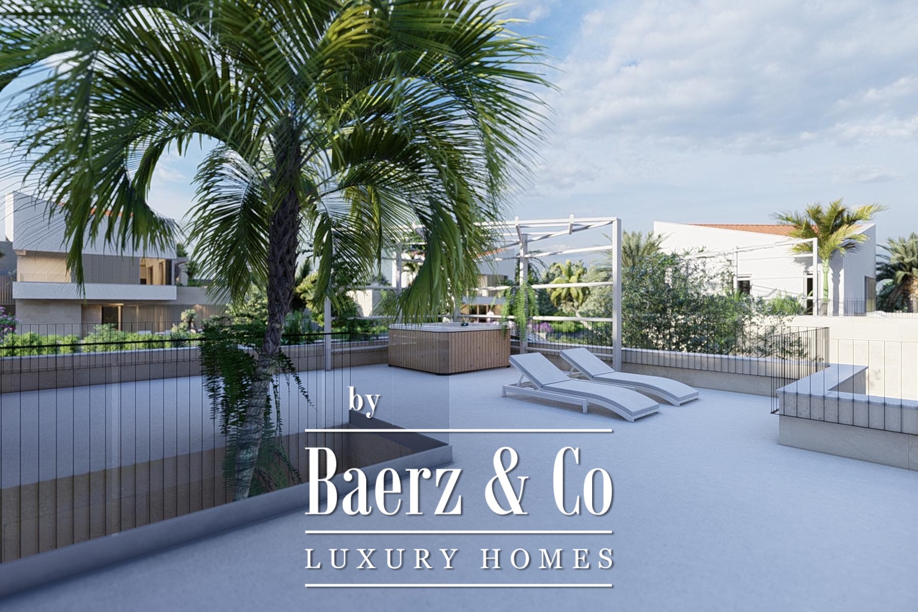 The townhouse spans 278 m² across two levels, set within a 706 m² landscape. Upon entry, the ground floor unfolds with two master bedrooms, each with private bathrooms and direct access to a garden terrace. Spaces for socializing extend to a gym, children's playroom, spa area with Finnish sauna, and a serene corner for quiet moments. Practicality is evident in the external toilet, an additional bathroom, and laundry facilities.