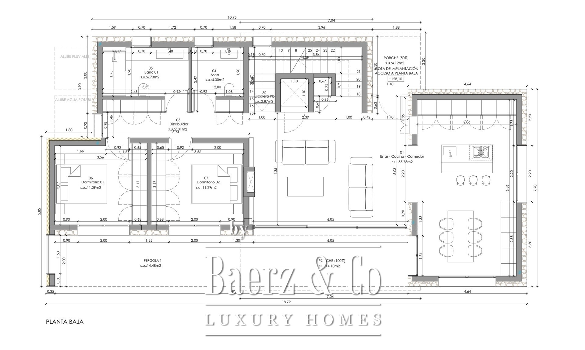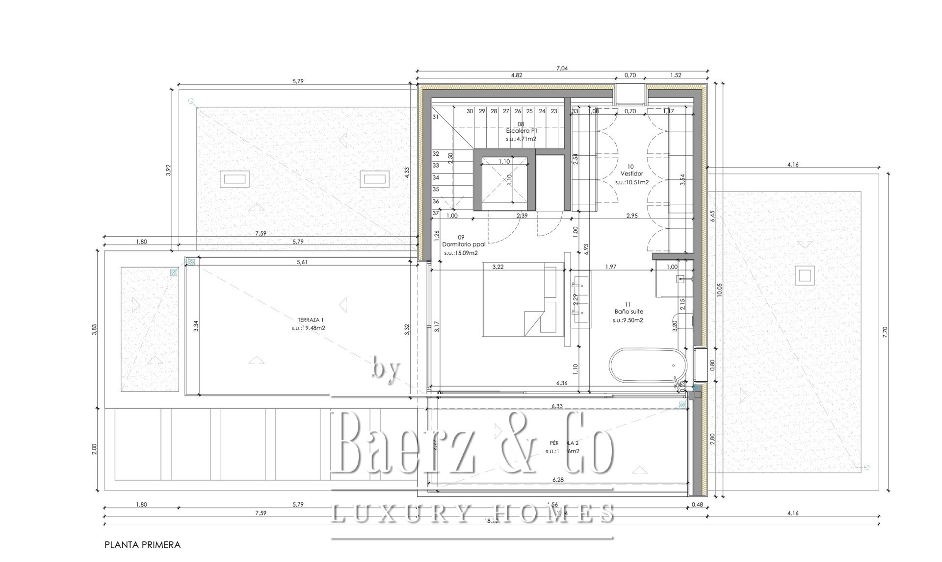 On the ground floor, a 152 m² expanse forms the social heart of the home. The open-plan kitchen, fully equipped for modern requirements, flows into a dining area and a spacious living room anchored by a fireplace. Two bedrooms and two bathrooms offer privacy for family and guests. The first floor is dedicated to the 56 m² master suite, featuring a modern bathroom and a generous walk-in wardrobe, with direct access to terraces that expand the sense of light and space.