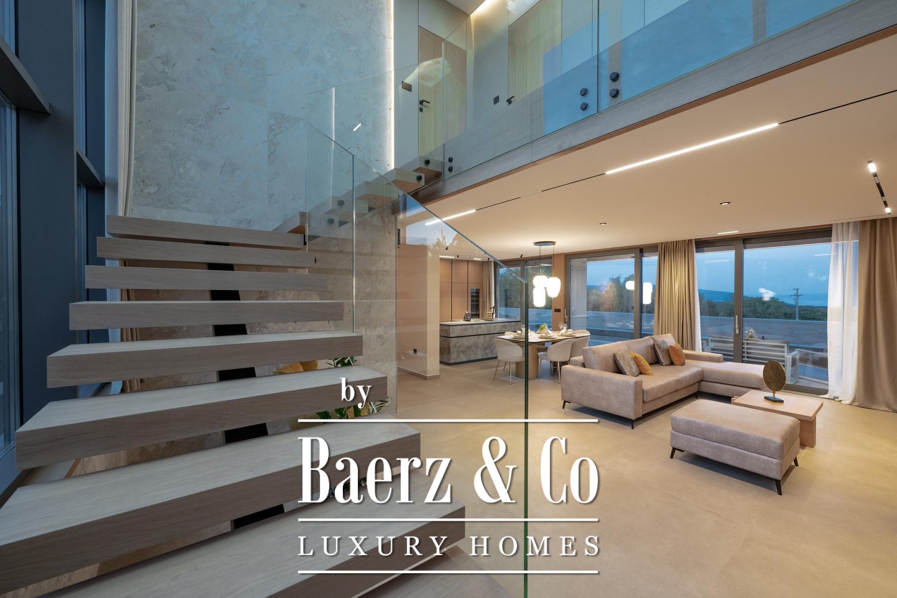 The ground floor unfolds through a covered entrance, past a guest cloakroom and a fluid living area that integrates kitchen, dining, and lounge zones. Each element connects gracefully to the 133m² terrace and heated pool of 60m², capturing sweeping views across the Adriatic and its islands. The layout includes a laundry, technical storage, and a tavern for relaxed hospitality, as well as covered parking equipped with an electric vehicle charger.