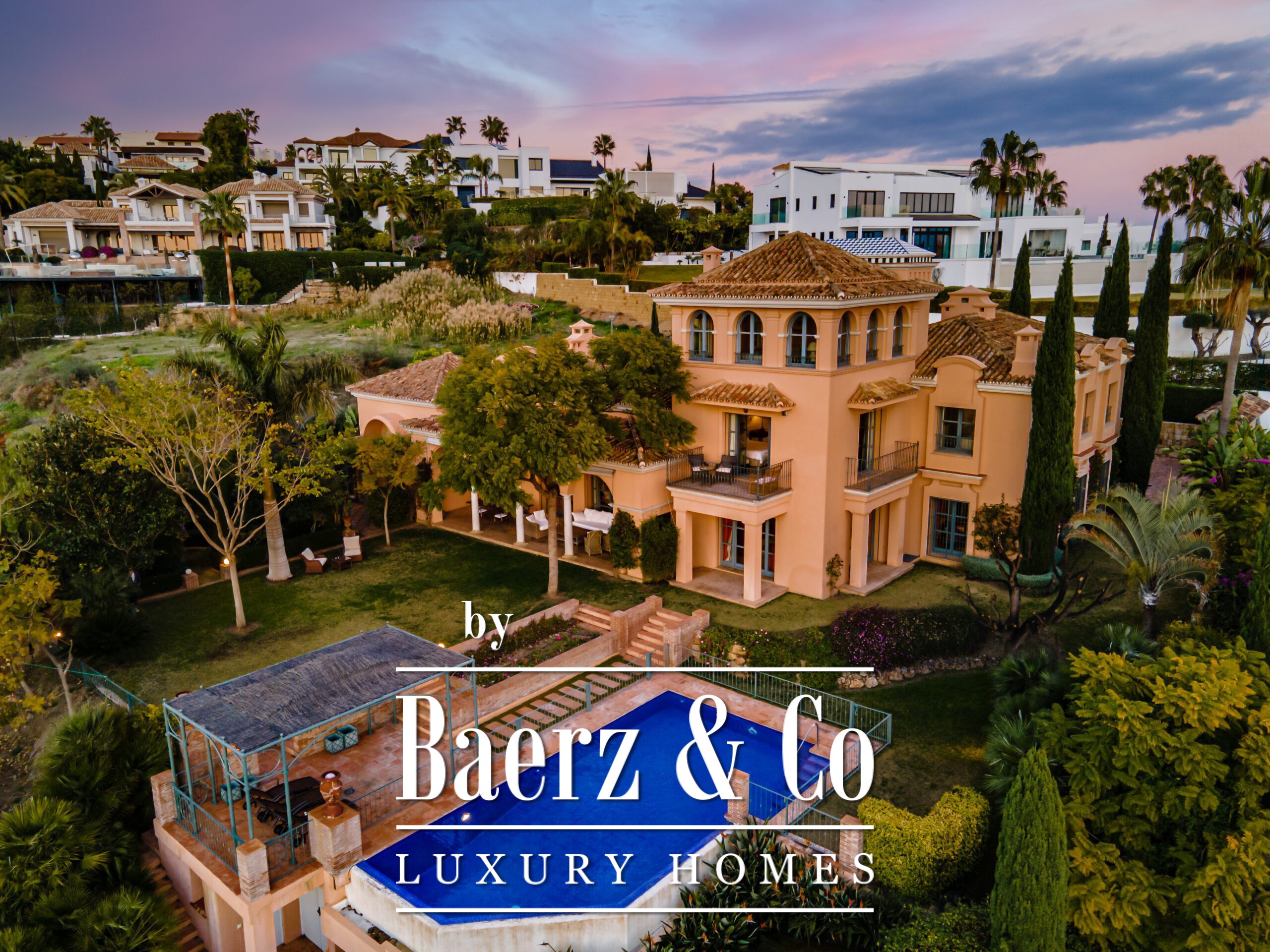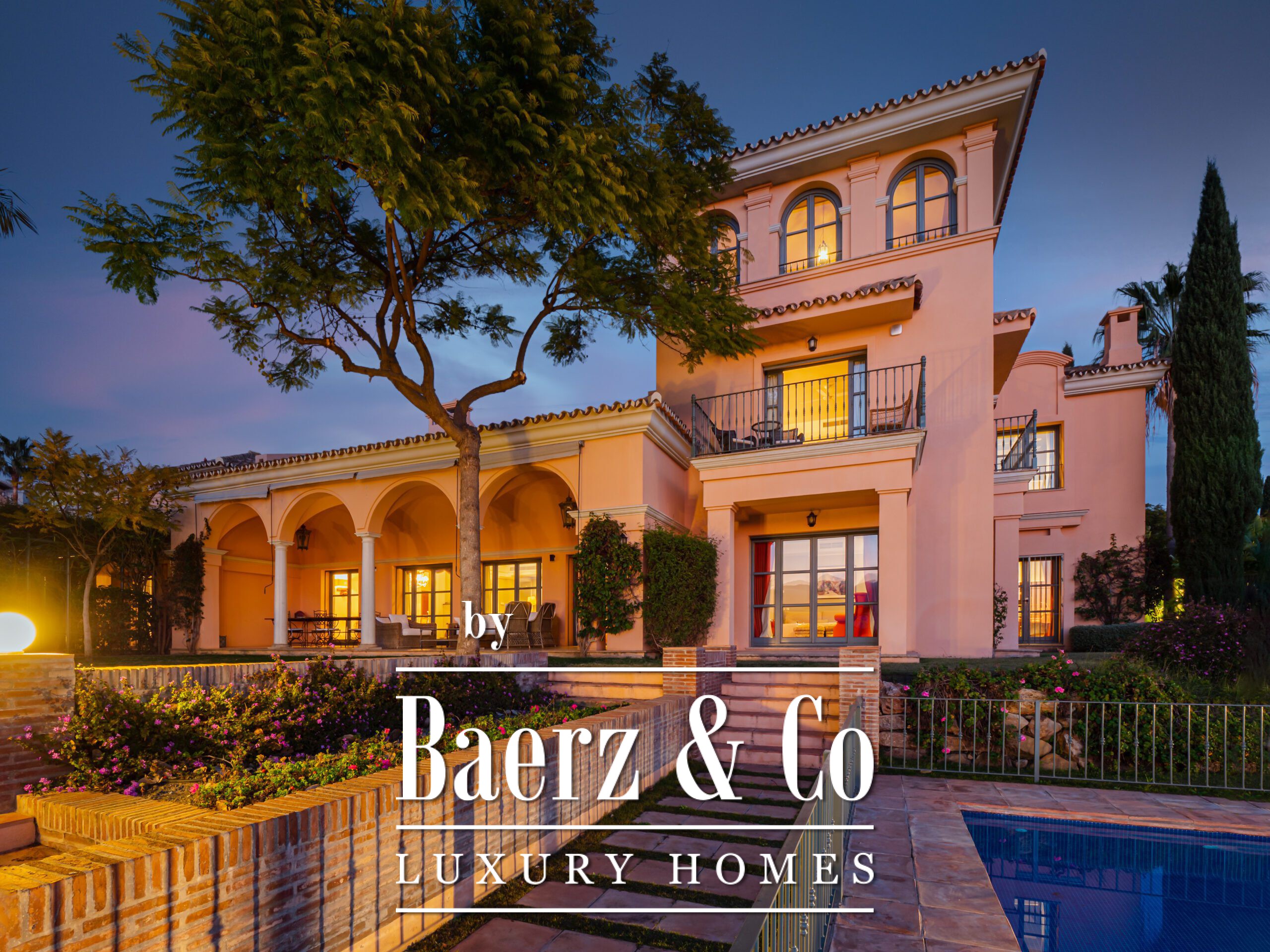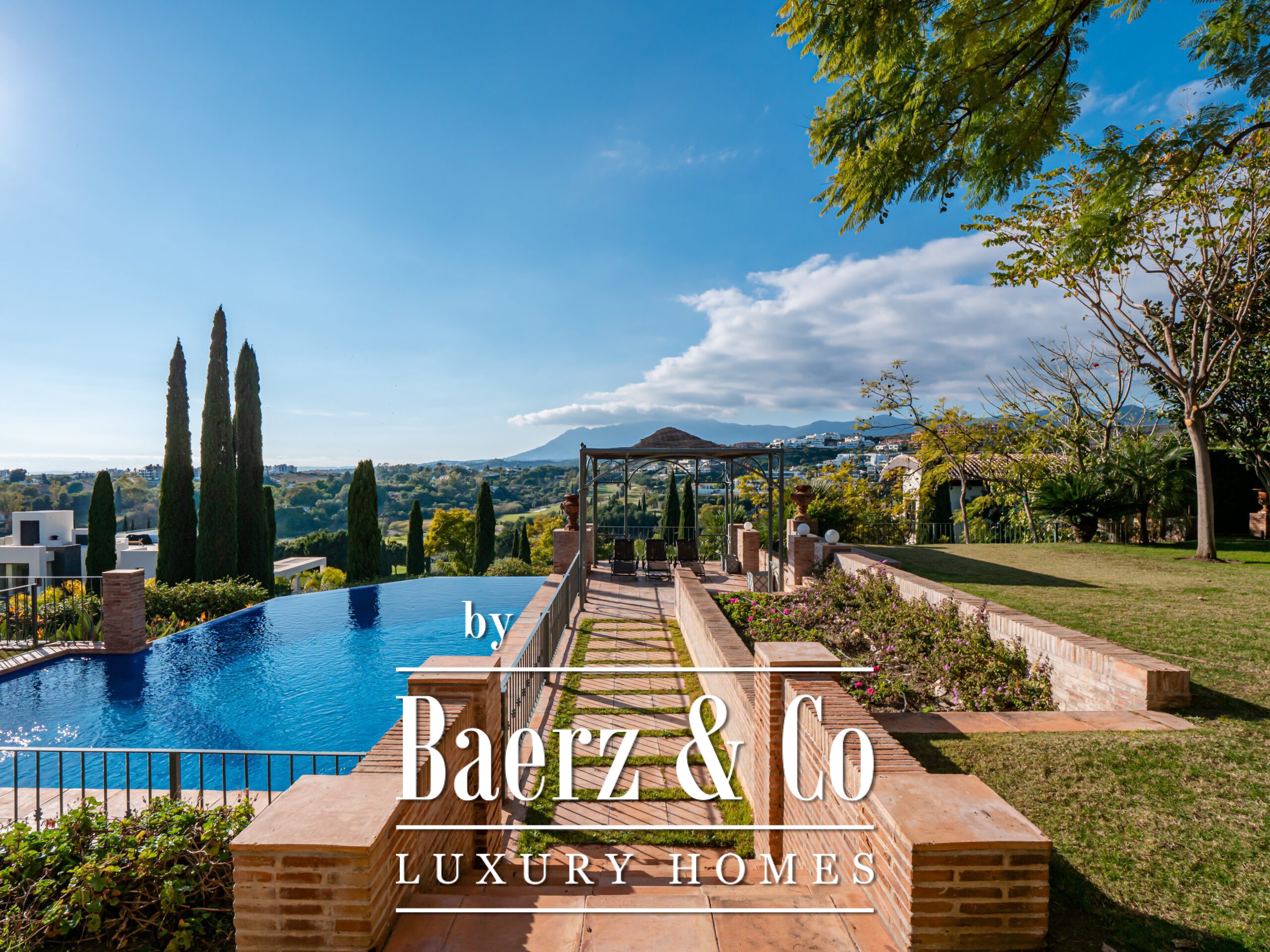 This beautiful Mediterranean-style luxury property for sale is situated in a prestigious area of the Costa del Sol, within exclusive Los Flamingos Golf Resort, Benahavis. It is located close to all facilities and amenities of the New Golden Mile, San Pedro and fabulous Puerto Banus, golf clubs, restaurants and beaches. Its location, amazing views, exquisite design and high-quality specifications make it an ideal home to enjoy the glorious Mediterranean lifestyle. Surrounded with Andalusian nature and similar high-end properties of Los Flamingos, the 4-level house of 1.017 m² is set on a large picturesque plot of 2,253 m². It is facing west and enjoys picture-perfect views to the subtropical gardens, beautifully landscaped greenery, hills and mountains, golf course, and Mediterranean Sea.