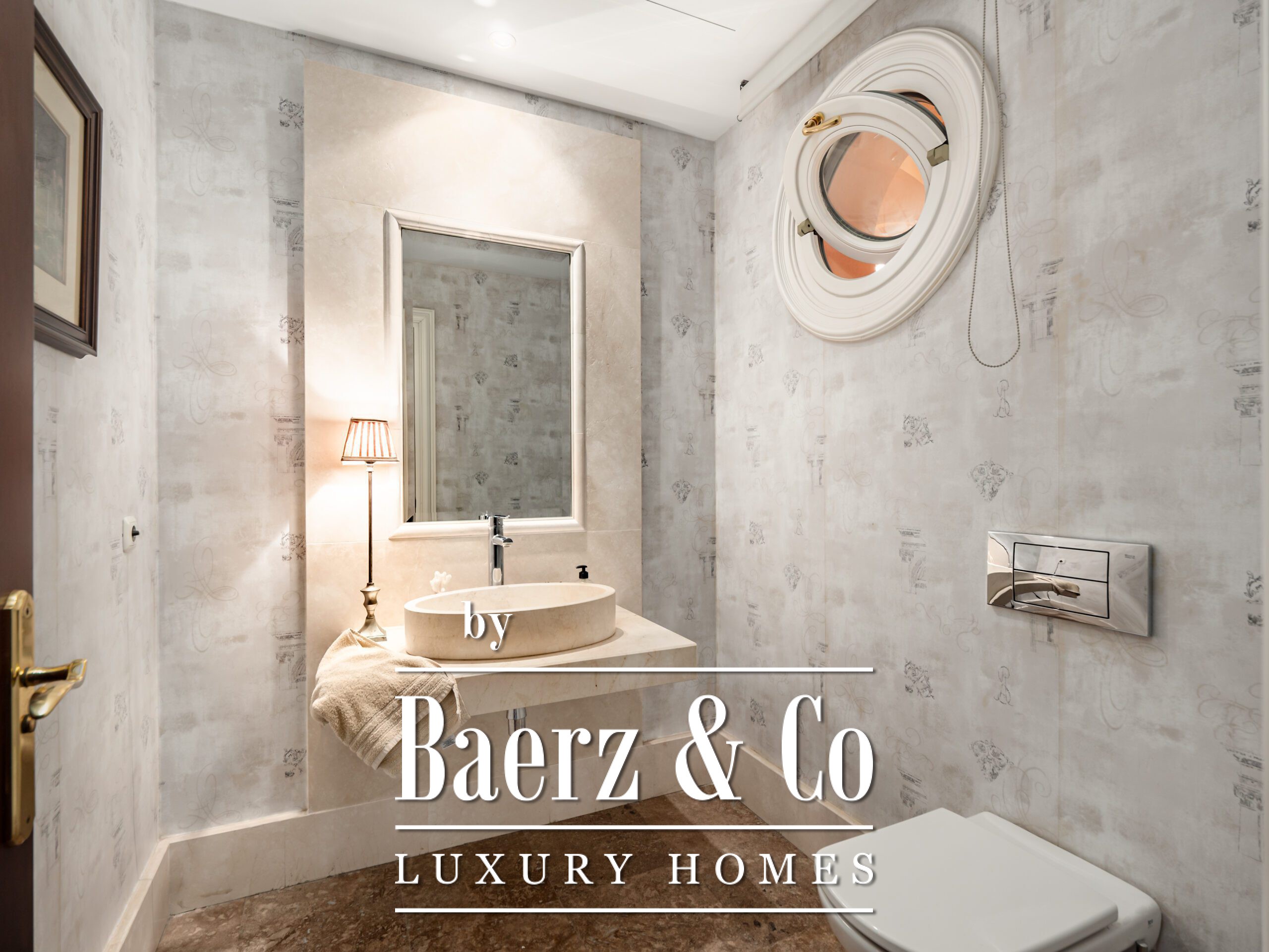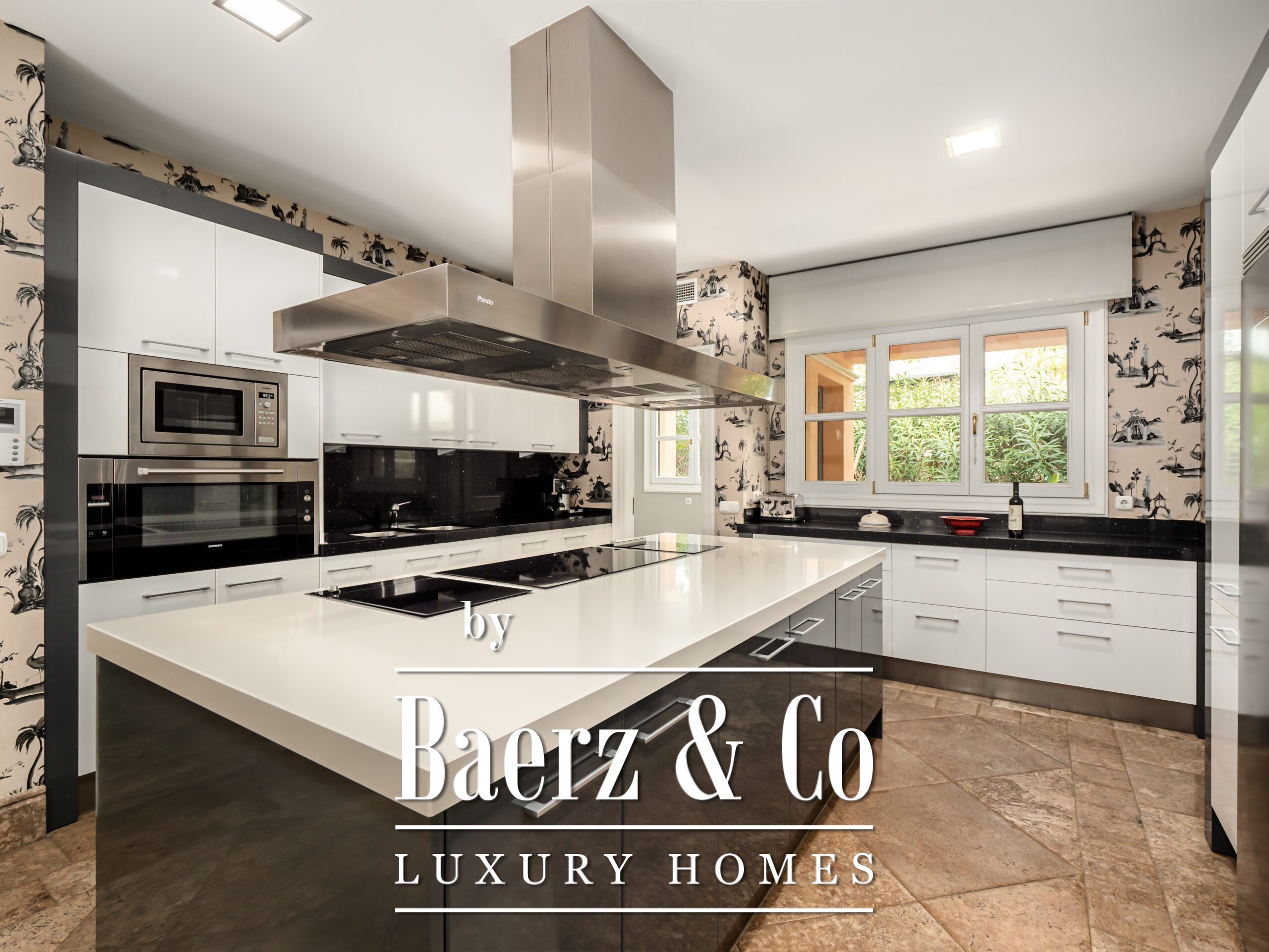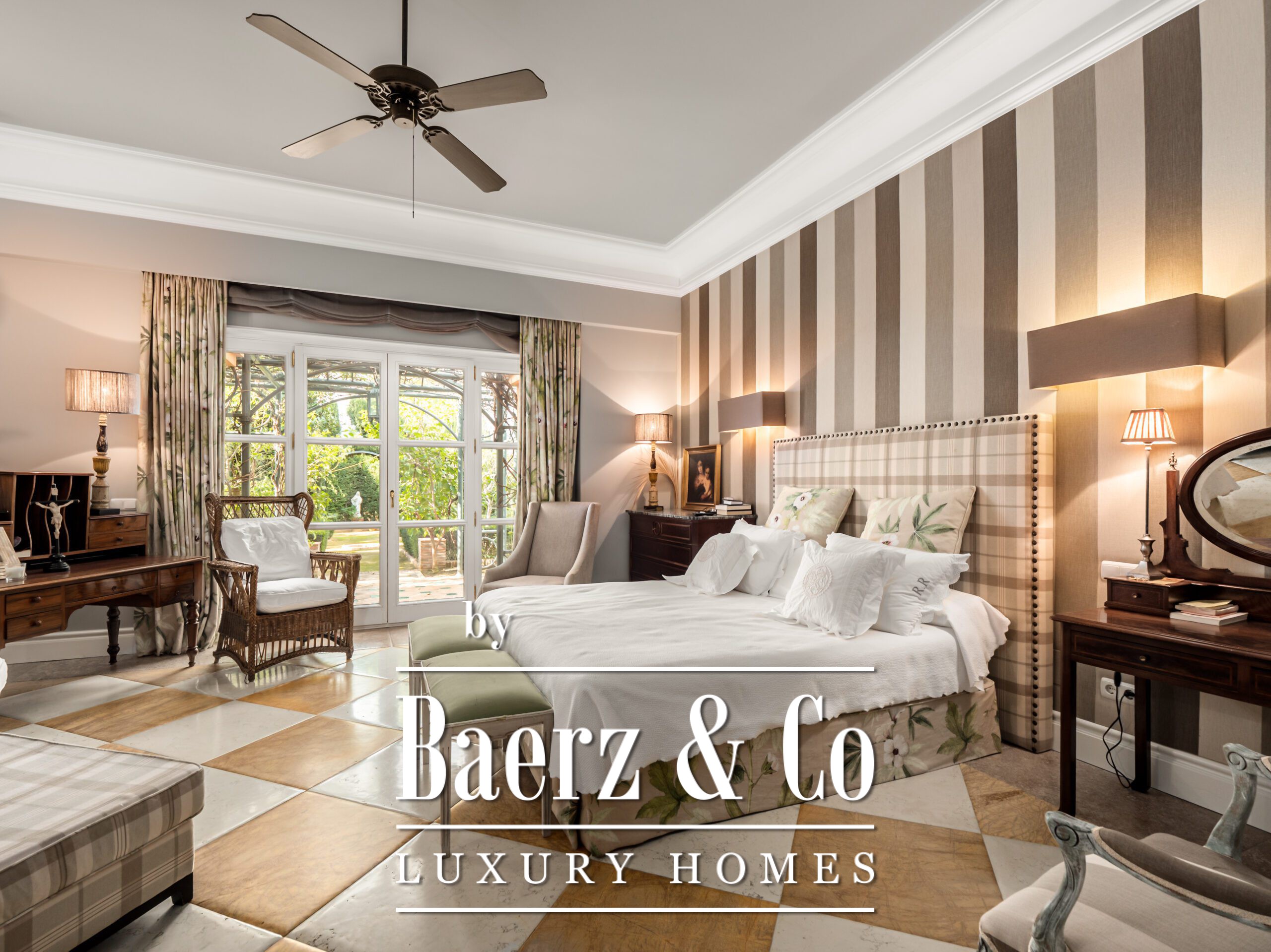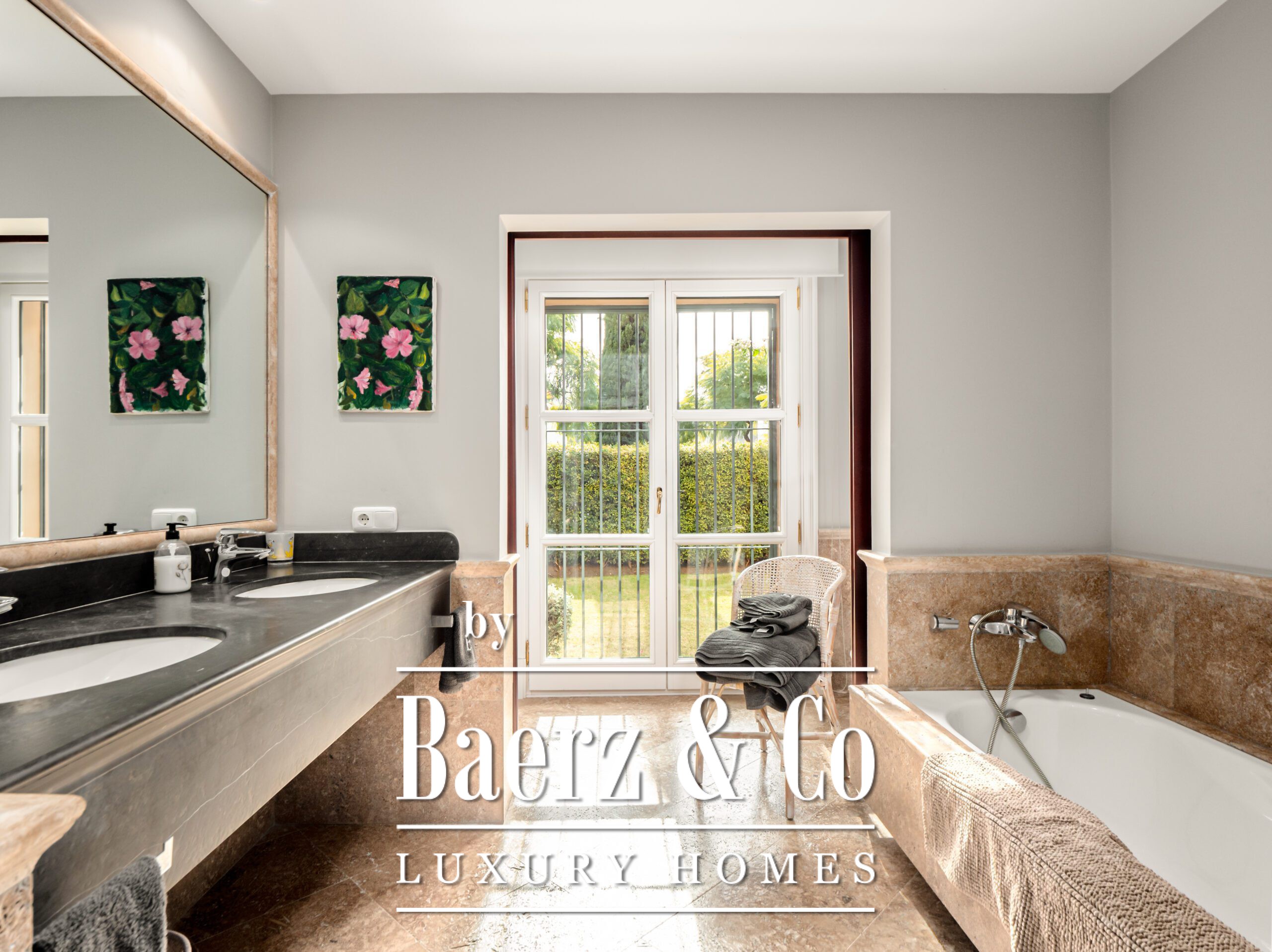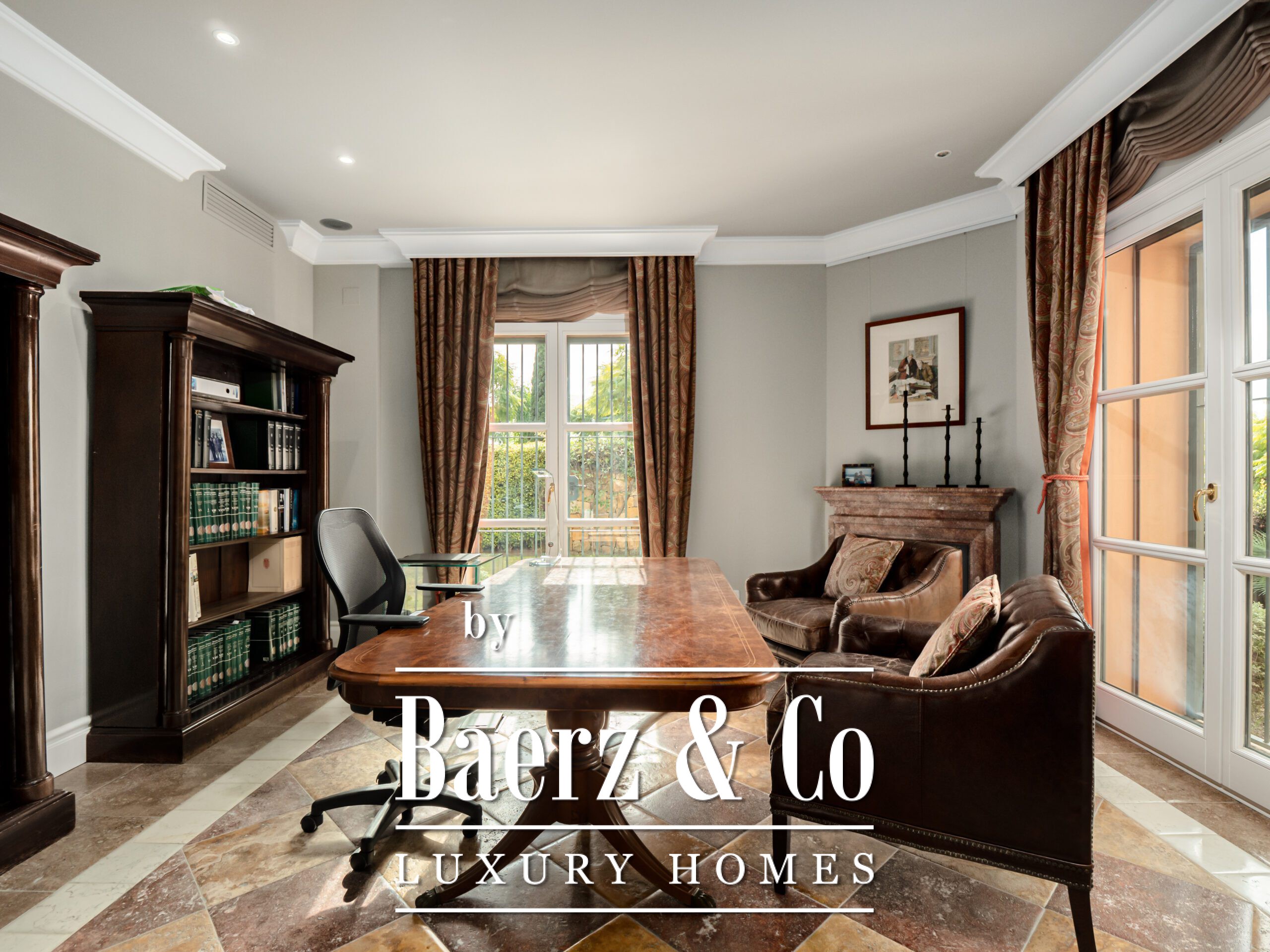 The spectacular mansion features an entrance hall, a timelessly elegant living room with a fireplace and a separate dining room, a fully fitted modern-style, black and white kitchen with a breakfast area, a pantry and laundry area, an office / library with another classic fireplace, a family room, 8 serene bedrooms (7 with en-suite bathrooms), 8 luxurious bathrooms and 1 guest toilet. The living areas of the house lead to the private balconies and wonderful terraces of 174 m² where you have enough space to relax, have BBQ and dine al fresco. At night, outdoor and landscape lighting makes the mansion and its territory look like a fairy-tale setting.