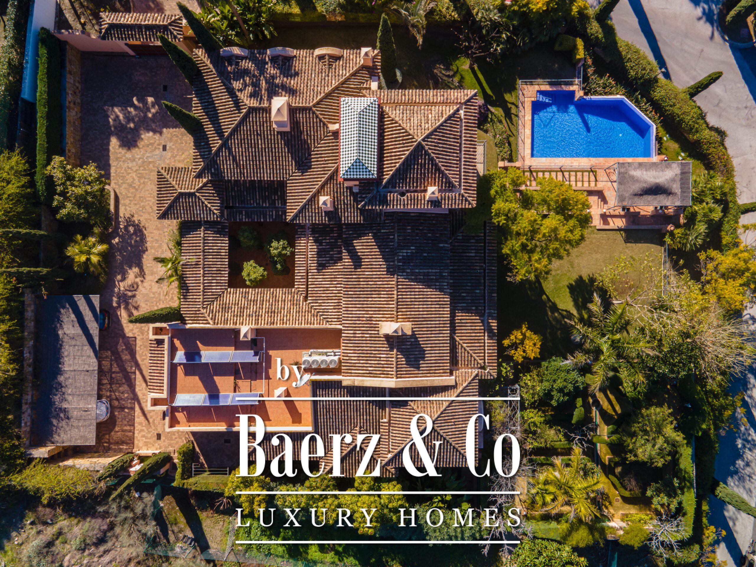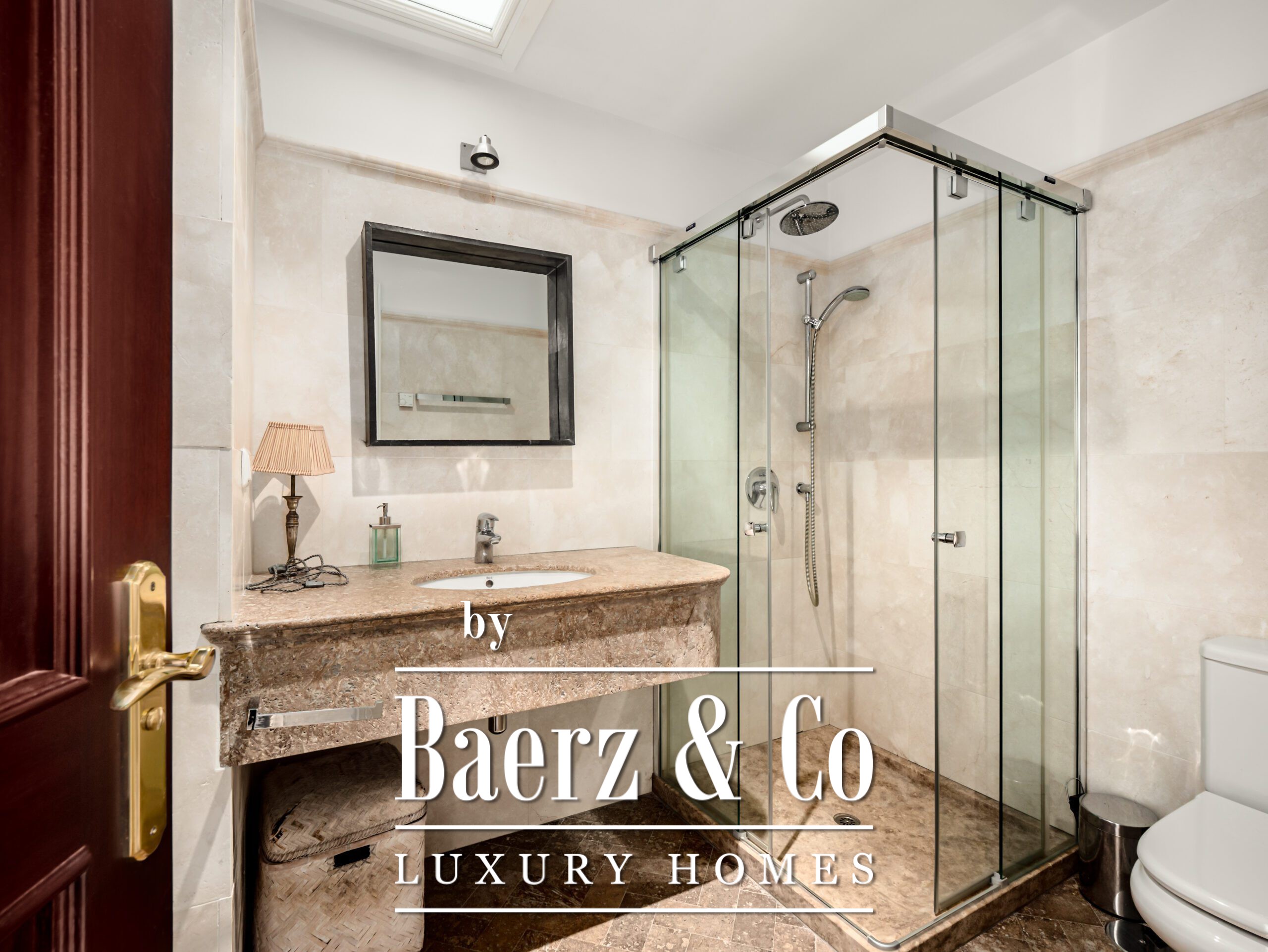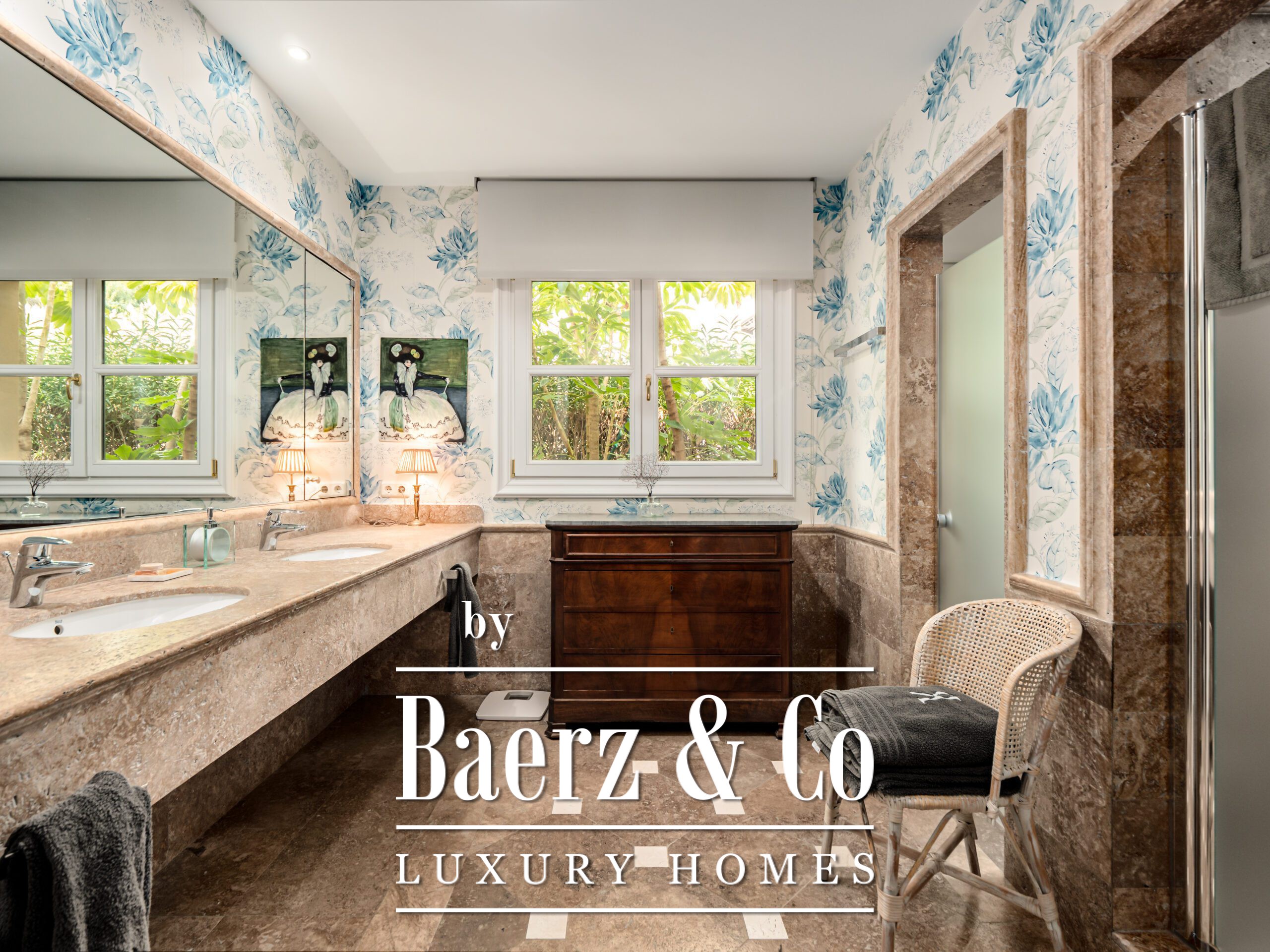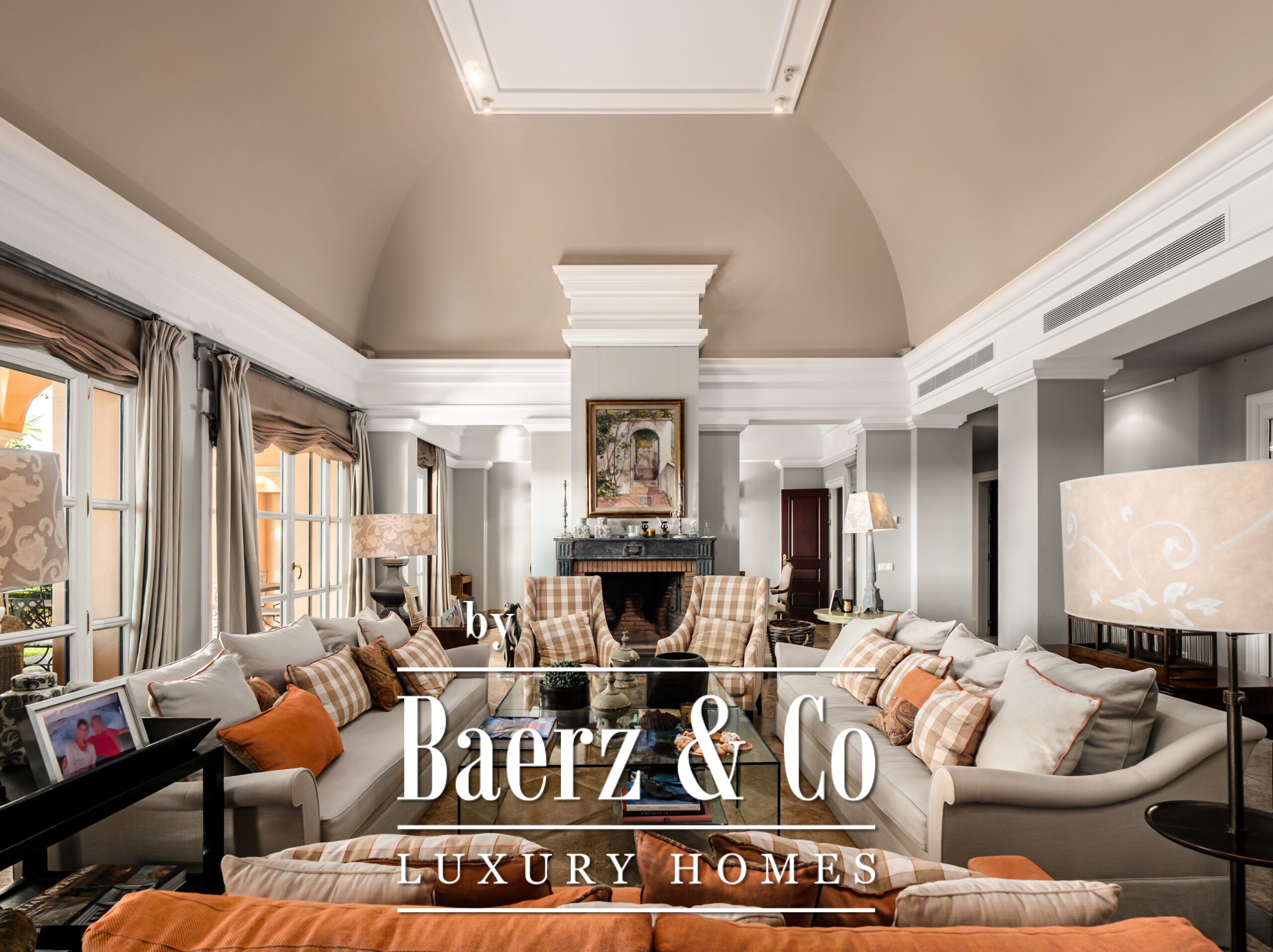 The spectacular mansion features an entrance hall, a timelessly elegant living room with a fireplace and a separate dining room, a fully fitted modern-style, black and white kitchen with a breakfast area, a pantry and laundry area, an office / library with another classic fireplace, a family room, 8 serene bedrooms (7 with en-suite bathrooms), 8 luxurious bathrooms and 1 guest toilet. The living areas of the house lead to the private balconies and wonderful terraces of 174 m² where you have enough space to relax, have BBQ and dine al fresco. At night, outdoor and landscape lighting makes the mansion and its territory look like a fairy-tale setting.
