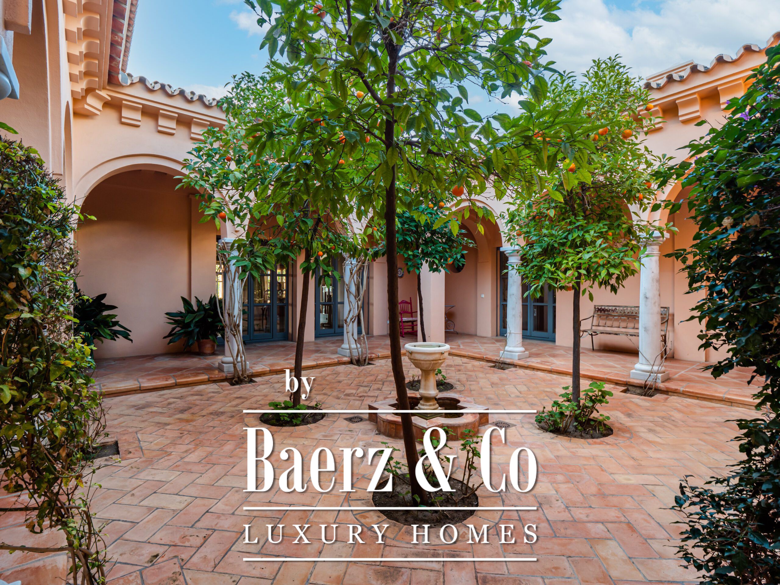The amazing garden is full of southern charm, with its emerald-green lawns, flowerbeds and mature trees, romantic corners, a wall fountain, exposed brick and natural stone. A large zero-edge swimming pool has a security wrought iron fence that provides protection and actually, enhance the beauty; custom-designed, it fits the style and landscaping, and is in full harmony with a pavilion with chill-out and sunbathing areas. A delightful Andalusian patio has a central fountain and orange trees. Significant Mediterranean elements beautify the house inside and outside: a terracotta roof, paved yard, arched windows, columns, metal balustrades and railings of the balconies, hand-made ceramic tiles, accent walls, French doors, classic choice of noble colours dictated by Nature, etc.