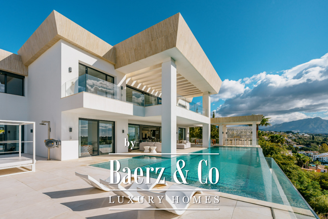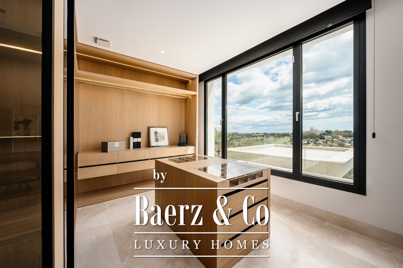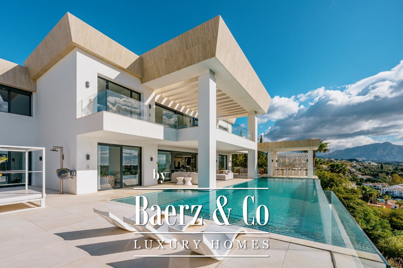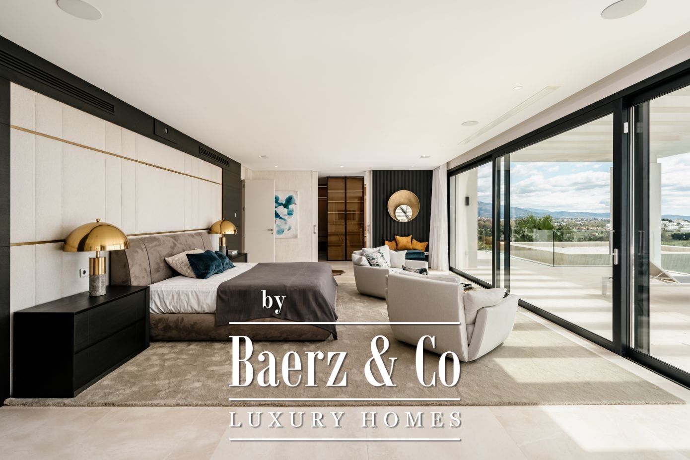 Set on a plot of 2.500m², the spectacular, south-facing mansion of 1.780m² is built to the highest standards and offers contemporary and modern design combined with a beautiful natural setting and breath-taking panoramic views of the Mediterranean Sea, golf course and picture-perfect surroundings. Striking, spacious and eco-friendly, it features an elegant living room with a bio-fireplace and large windows with access to a large porch and the garden and pool area; a fully fitted state-of-art designer kitchen and a dining area; 7 bedrooms with 7 bathrooms en-suite (marble, double sinks, shower cabins, bathtubs, Jacuzzi), 2 guest toilets, cinema and game rooms.