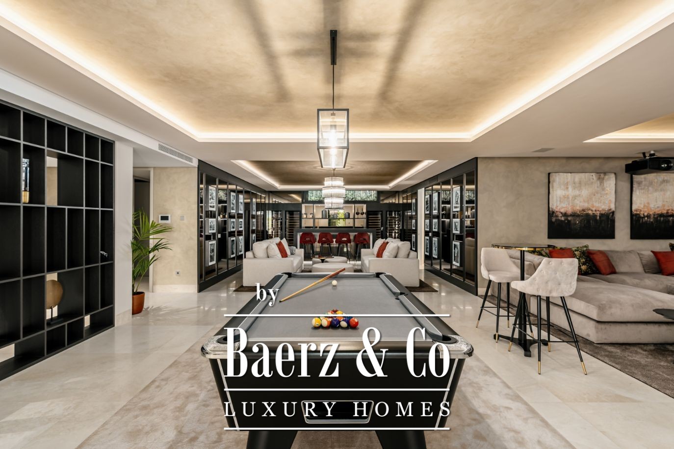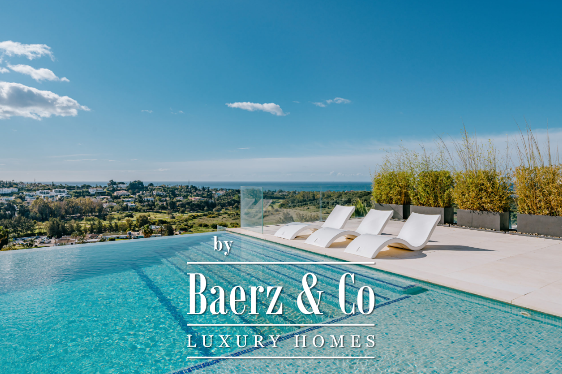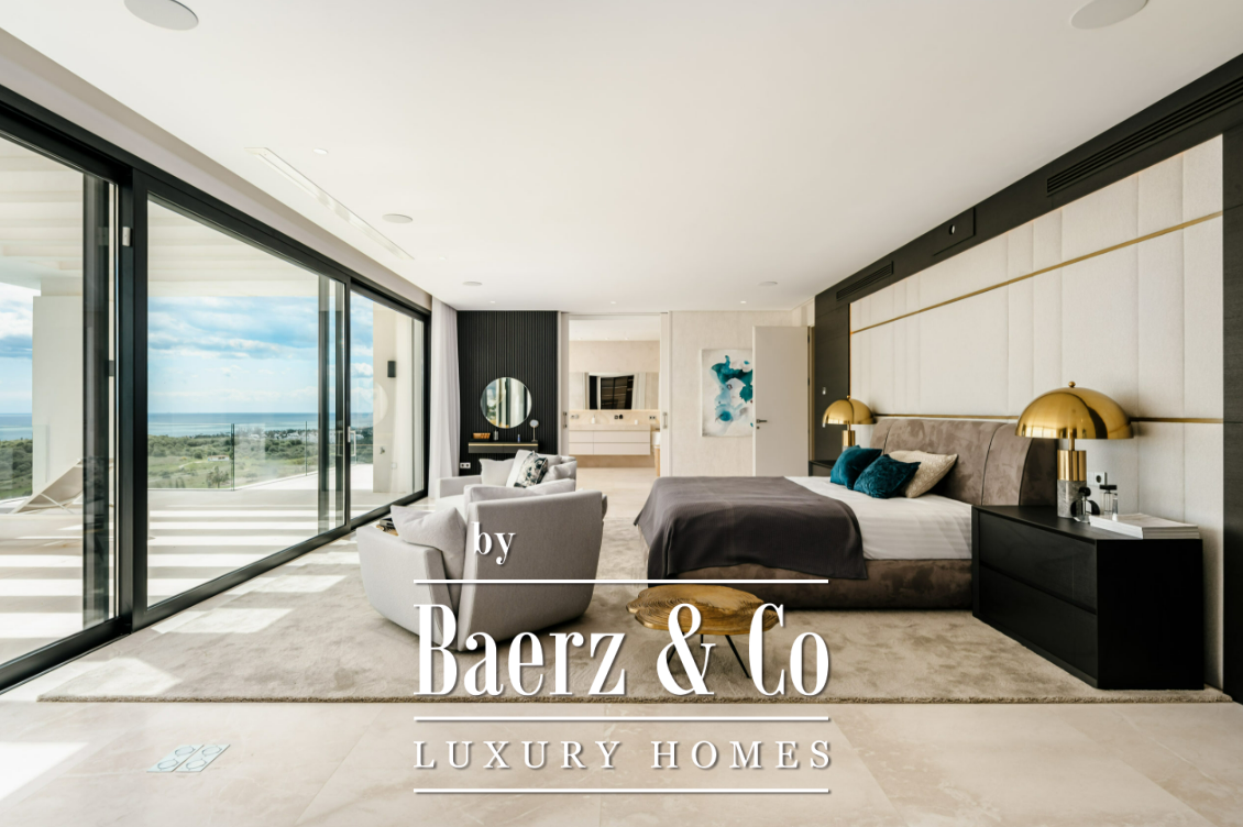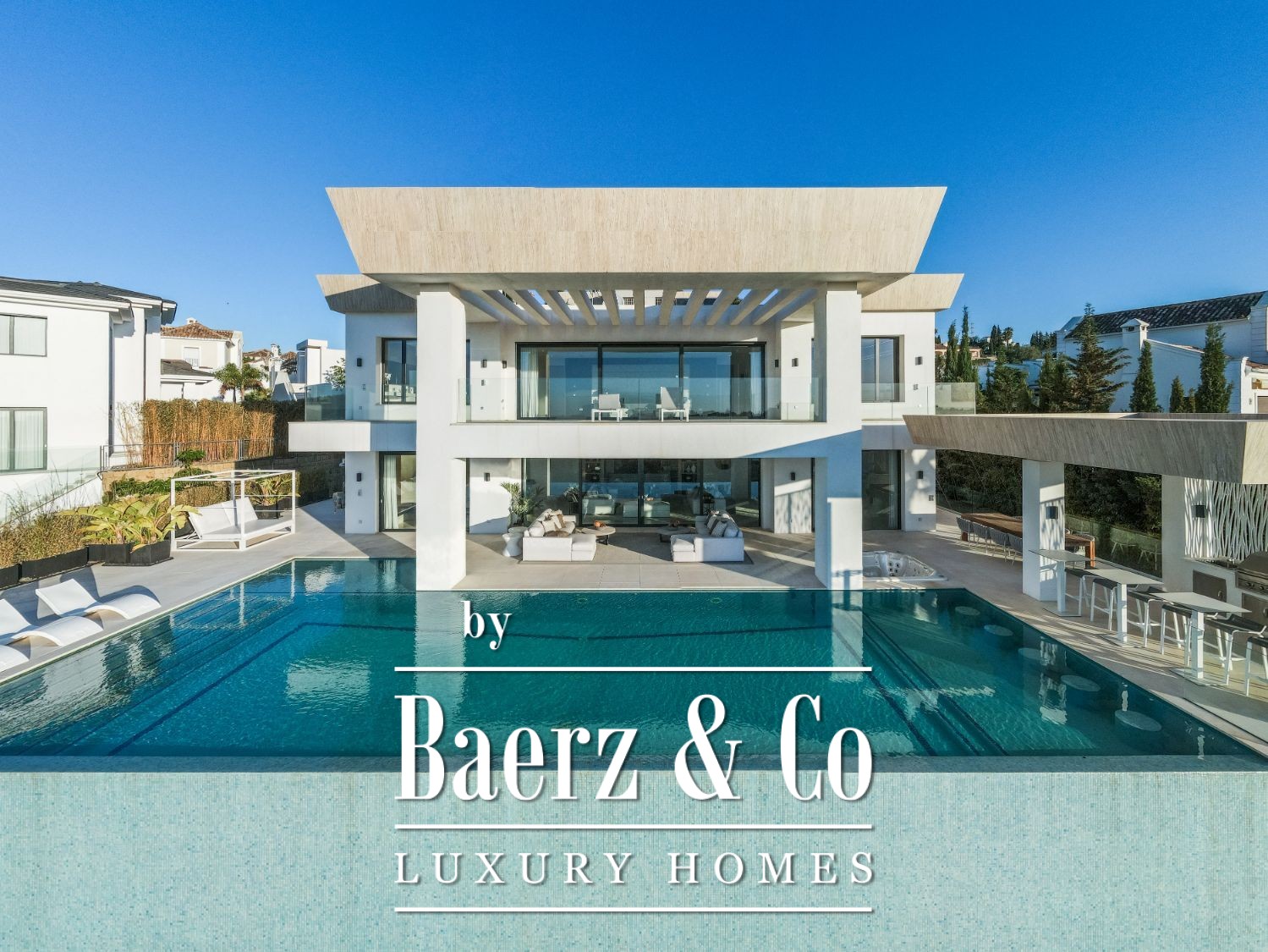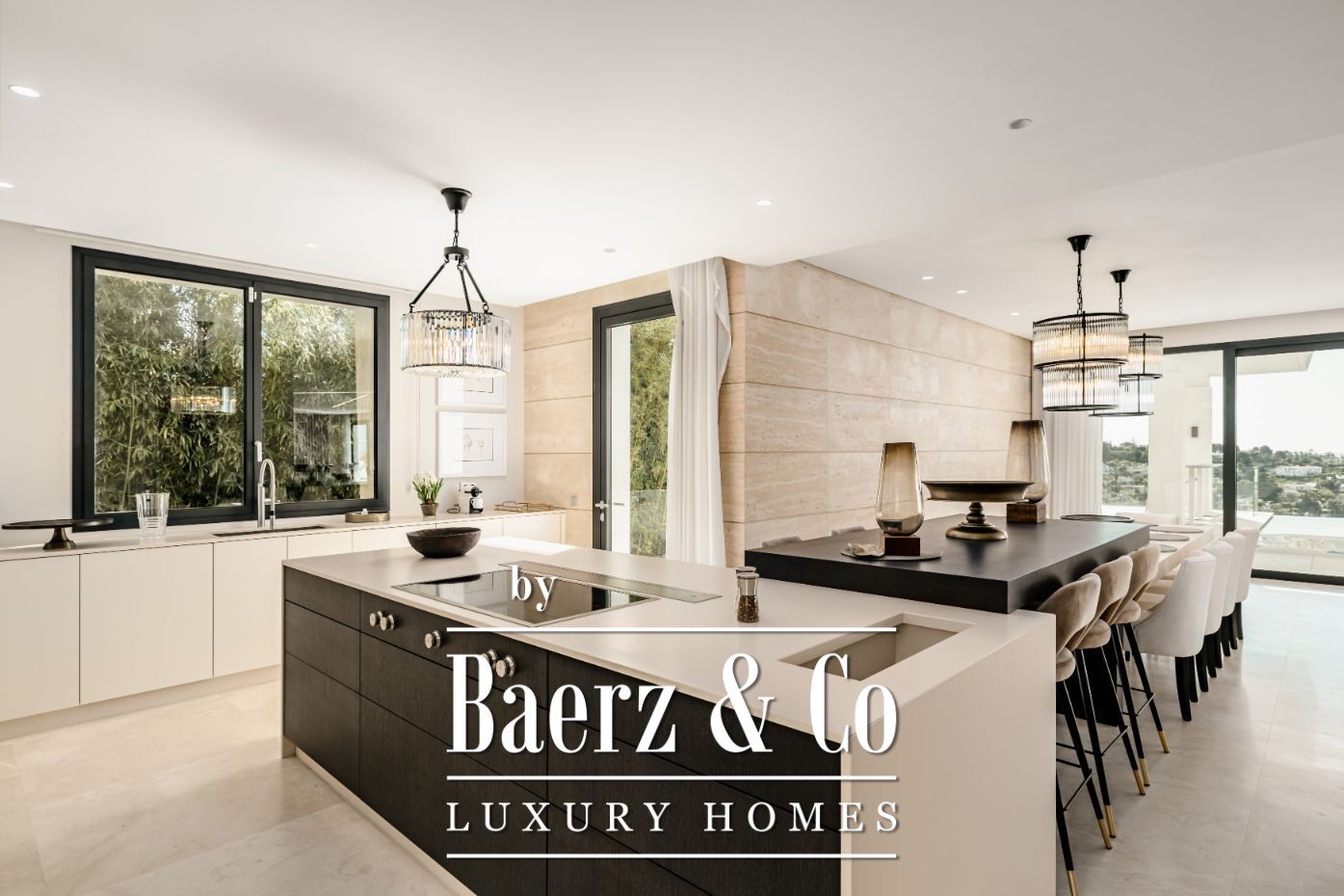 Set on a plot of 2.500m², the spectacular, south-facing mansion of 1.780m² is built to the highest standards and offers contemporary and modern design combined with a beautiful natural setting and breath-taking panoramic views of the Mediterranean Sea, golf course and picture-perfect surroundings. Striking, spacious and eco-friendly, it features an elegant living room with a bio-fireplace and large windows with access to a large porch and the garden and pool area; a fully fitted state-of-art designer kitchen and a dining area; 7 bedrooms with 7 bathrooms en-suite (marble, double sinks, shower cabins, bathtubs, Jacuzzi), 2 guest toilets, cinema and game rooms.