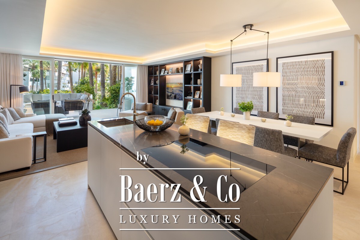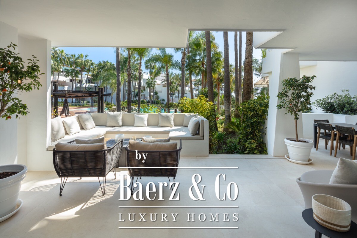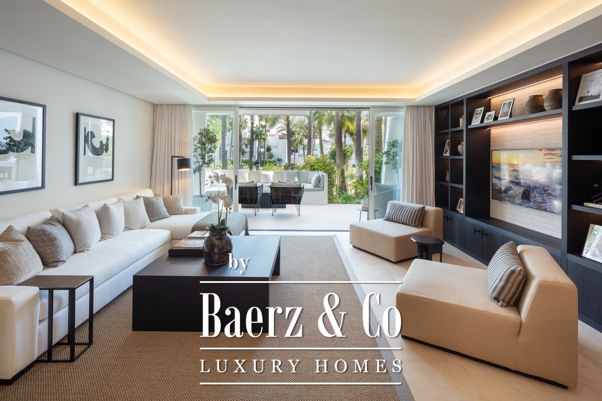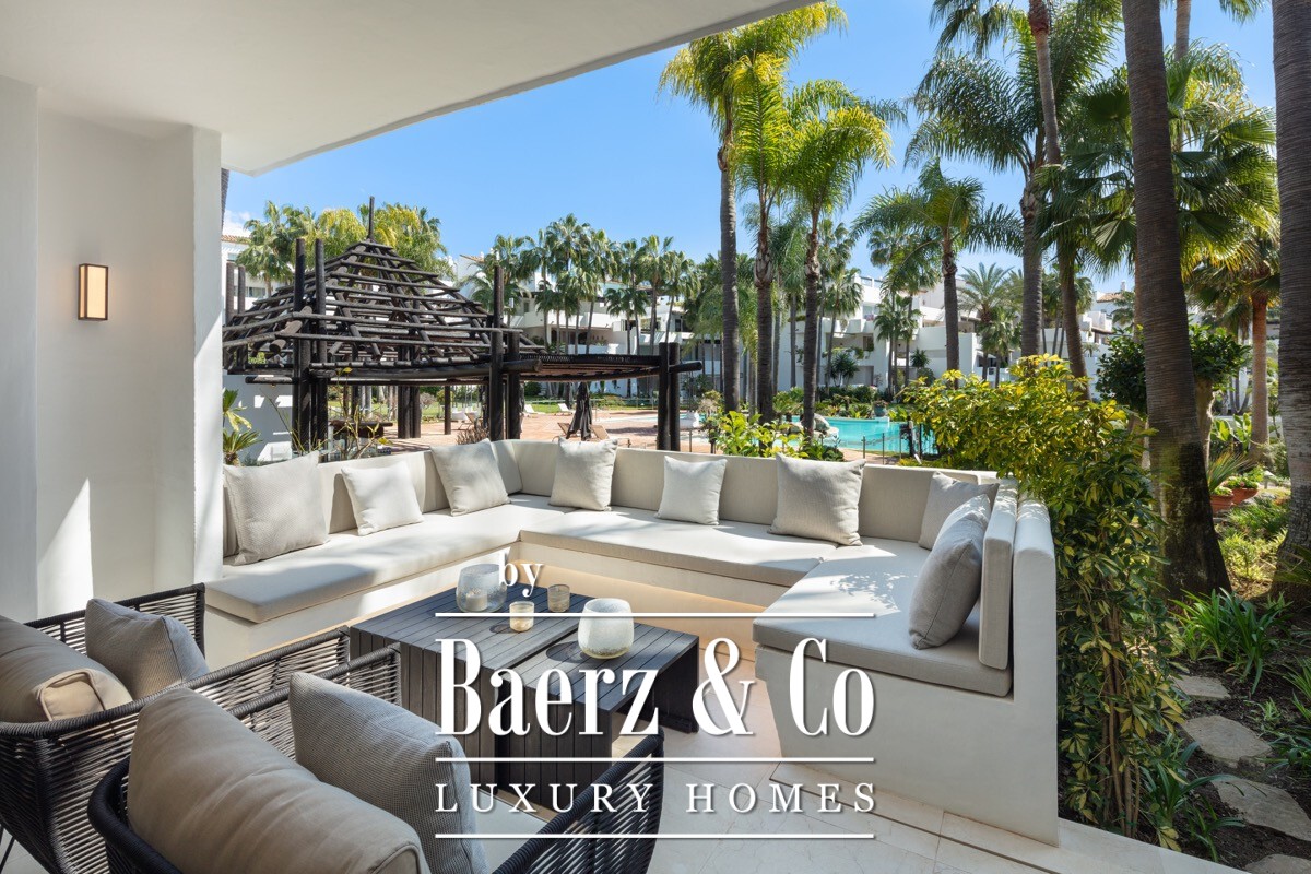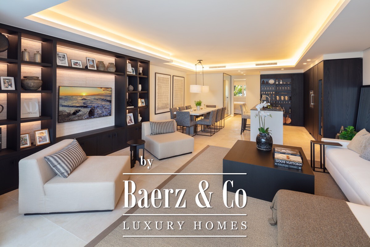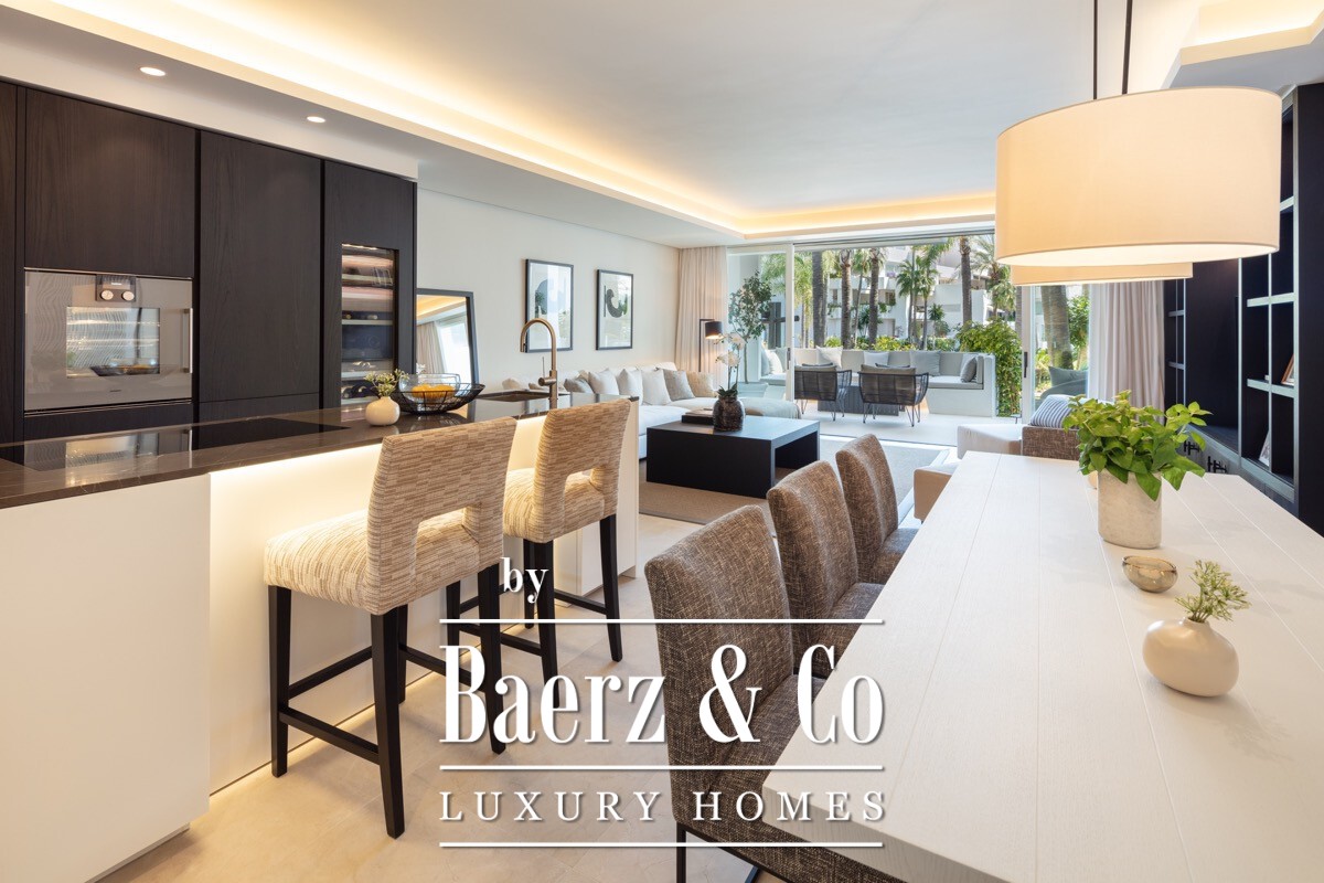 A stunning renovated ground floor apartment within the 5 star resort Puente Romano. Exquisitely finished and decorated and renovated to the highest quality standards. A bright and spacious south facing flat with an open plan layout, a modern custom designed kitchen with oak cabinets and integrated with Gaggenau appliances and living area with access to a beautiful terrace opening on to the communal gardens.