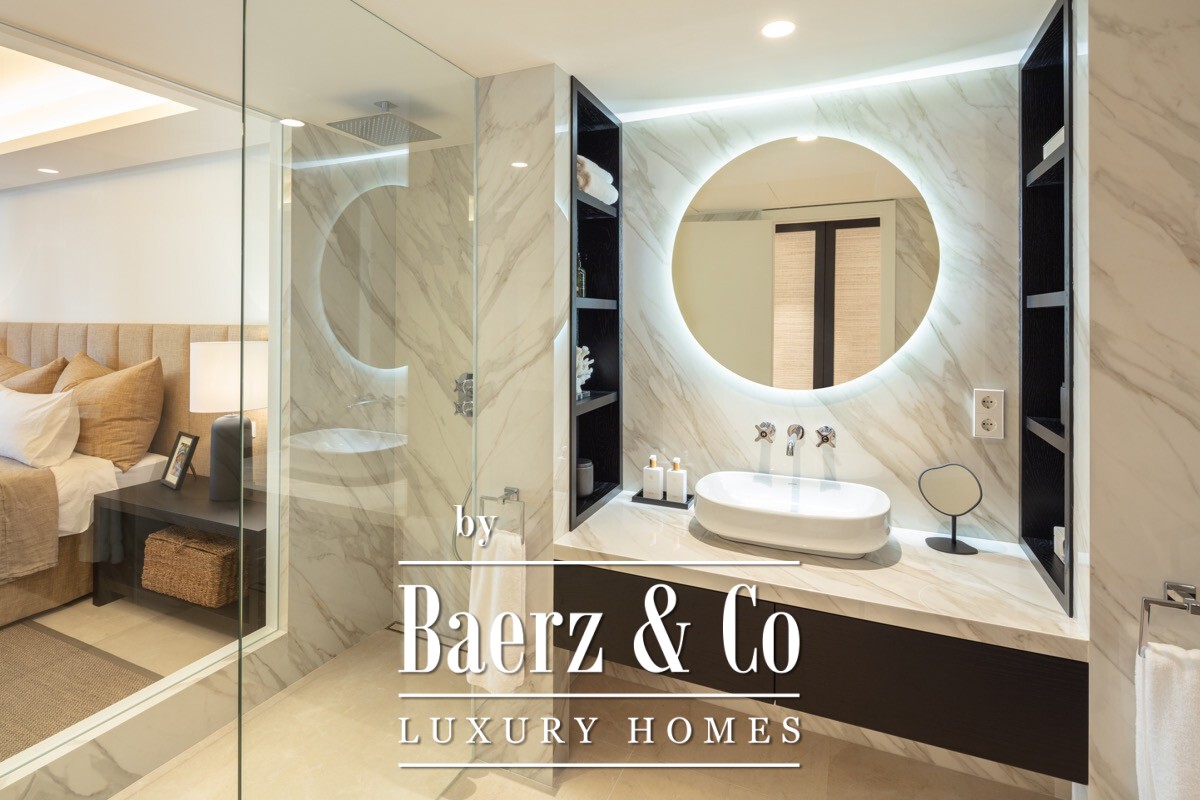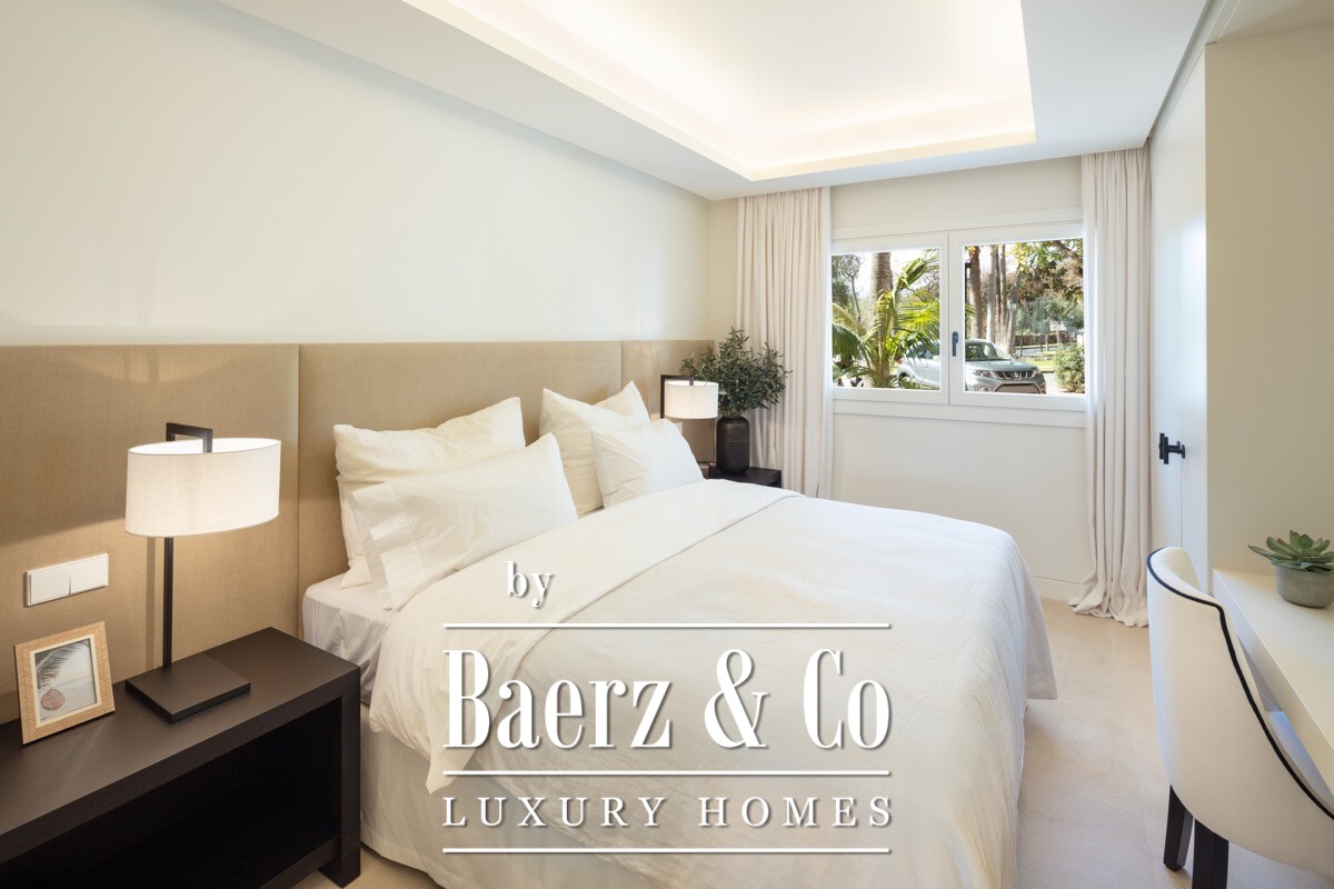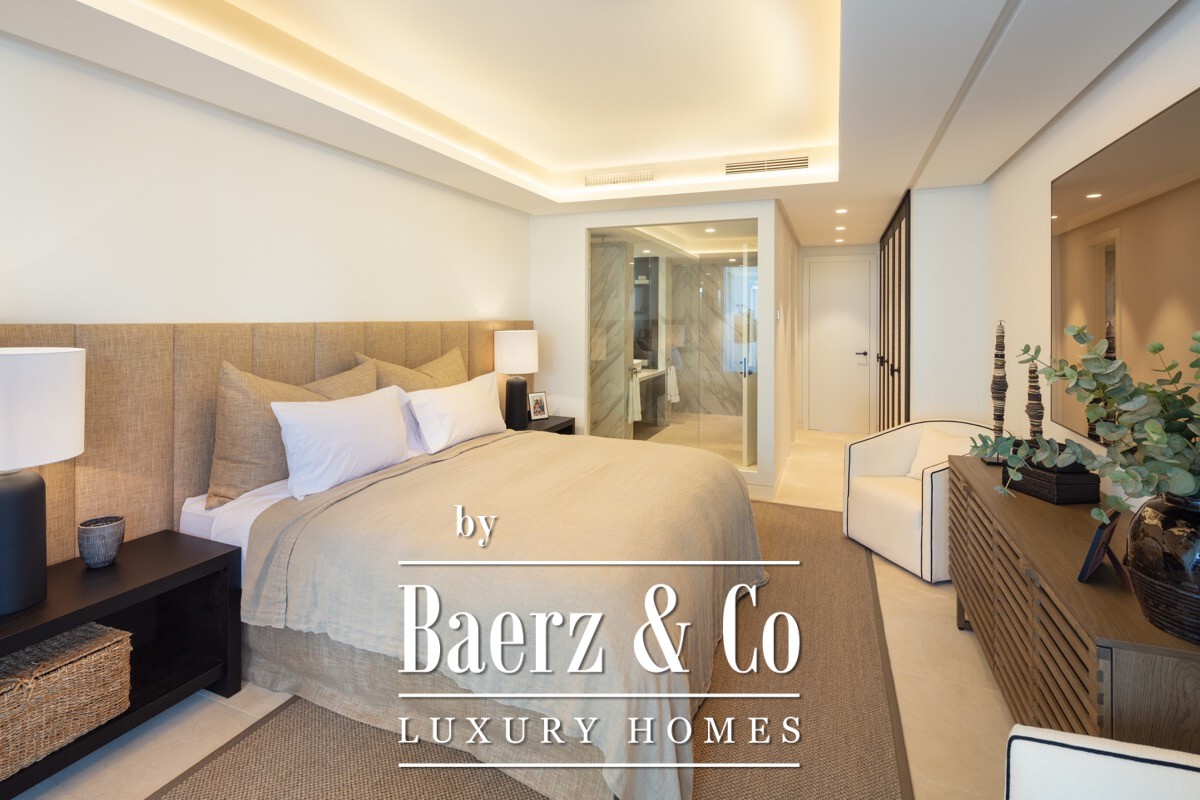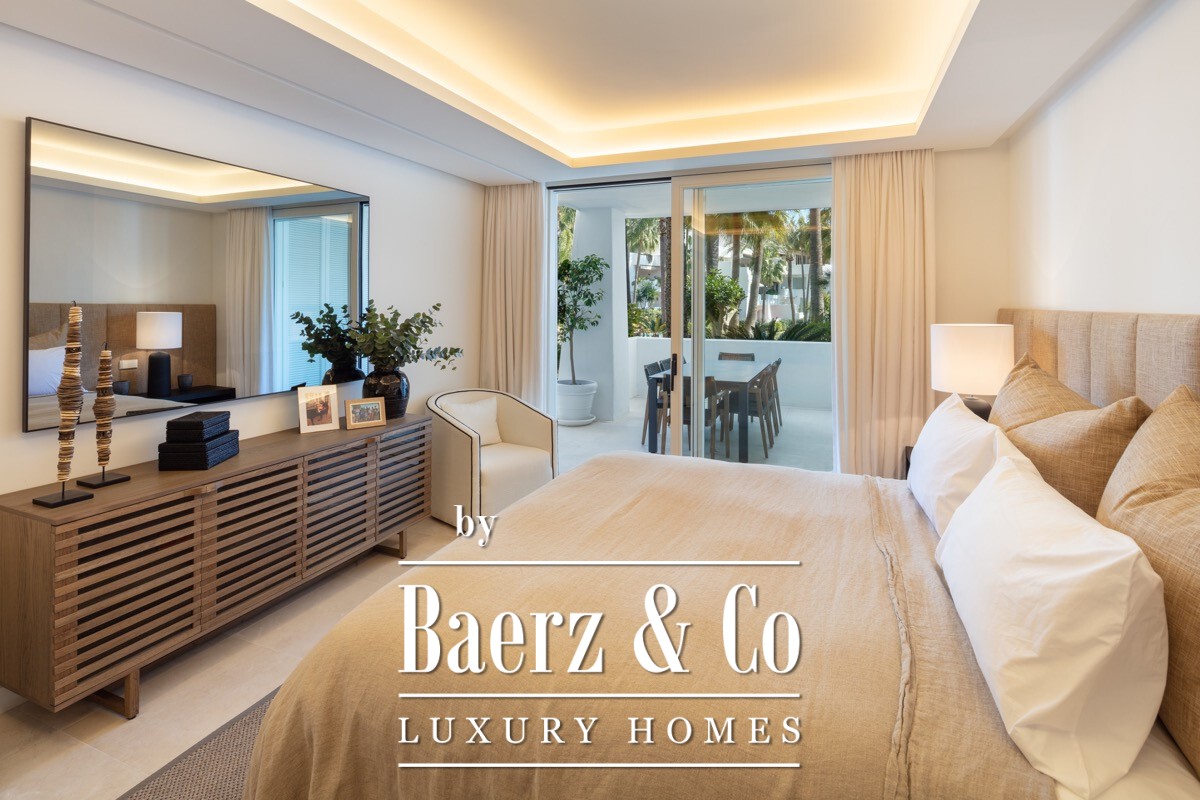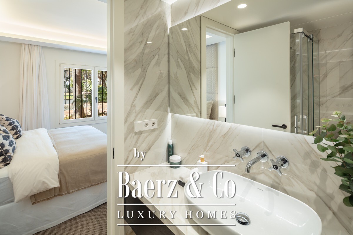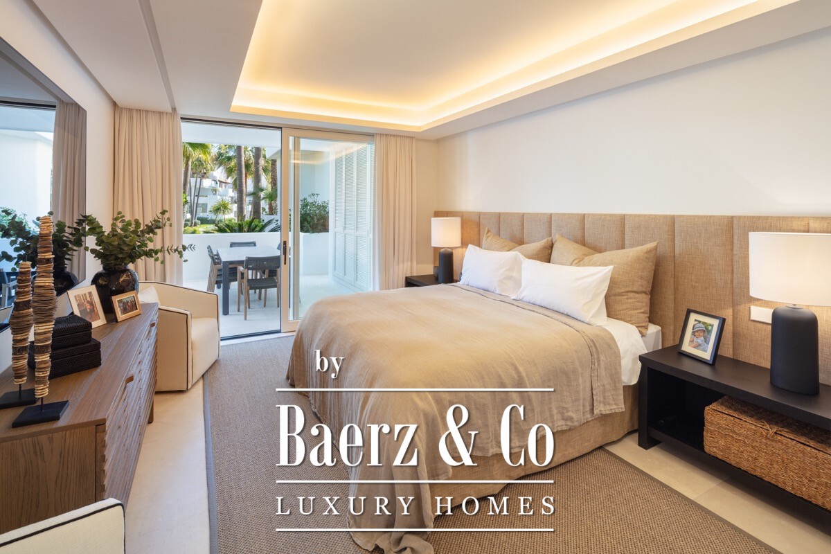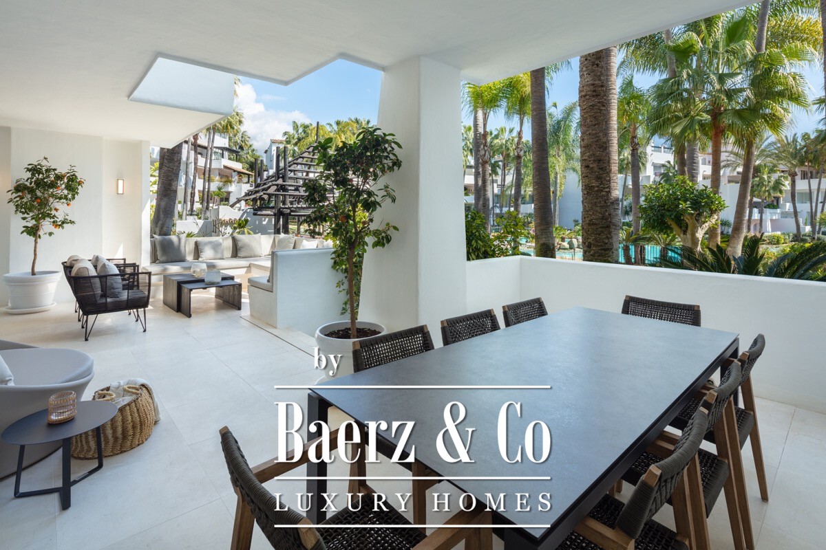 A stunning renovated ground floor apartment within the 5 star resort Puente Romano. Exquisitely finished and decorated and renovated to the highest quality standards. A bright and spacious south facing flat with an open plan layout, a modern custom designed kitchen with oak cabinets and integrated with Gaggenau appliances and living area with access to a beautiful terrace opening on to the communal gardens.