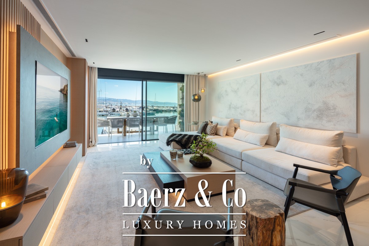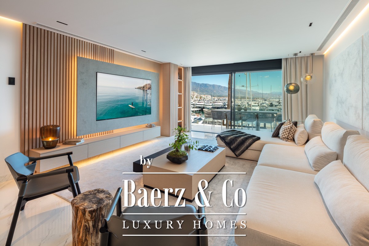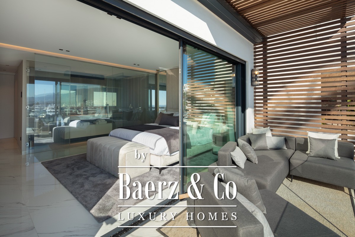 Throughout the property discover top-of-the-line features such as an open plan living with almond wood panelling incorporated LED lighting, leading directly to the exterior terrace with frontline views towards the port, a sleek fitted kitchen complete with top-level Gaggenau appliances and 3 opulent bedrooms, each with their own en-suite bathrooms. Discover a lavish apartment with all the best Marbella has to offer at your fingertips.