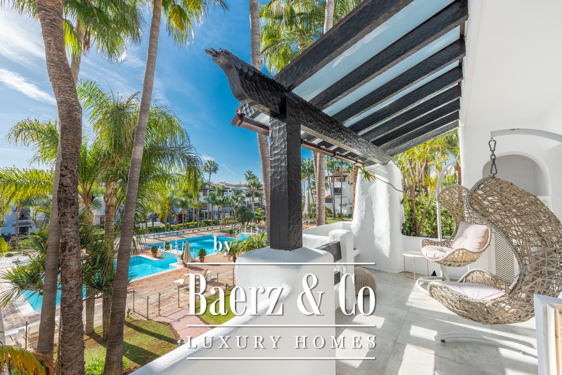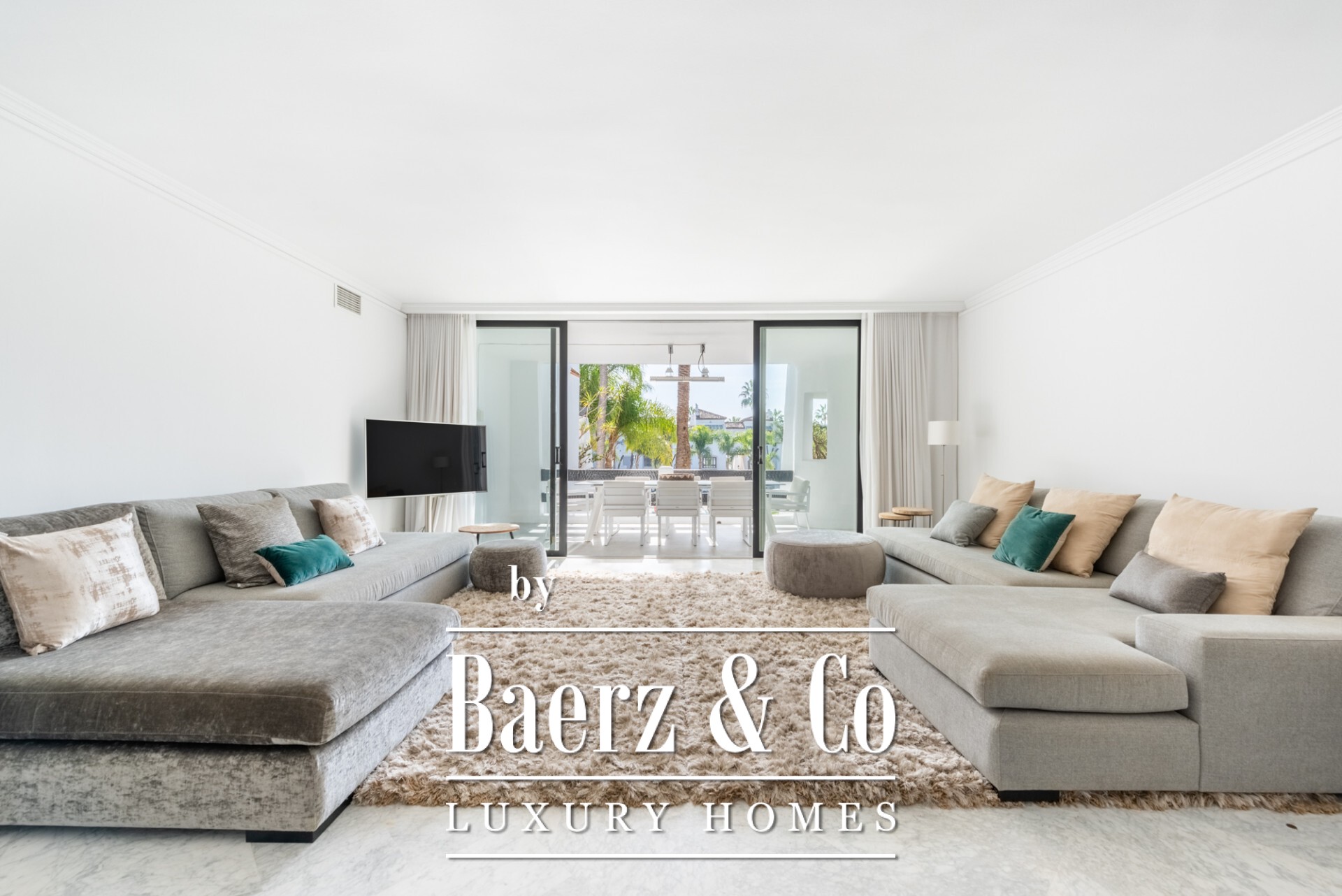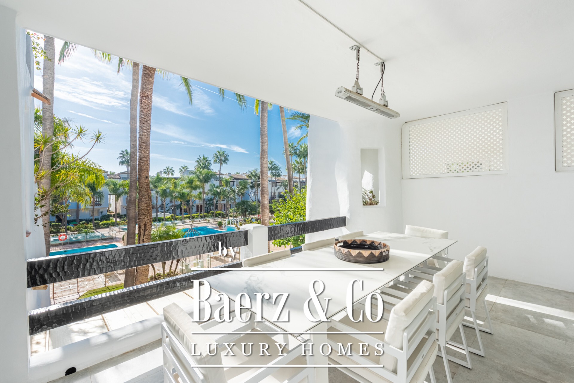 Beachside apartment in the sought-after beachfront complex Jardín Persa, in Marina Puente Romano at the Puente Romano Beach Resort and Spa, with all of its amenities at hand. The apartment has been partly reformed in 2016, is offered fully furnished and features: modern-styled kitchen on the Tennis club side, with fantastic panoramic views towards the tennis club and the La Concha mountain, 3 bedrooms and 2 bathrooms, and two terraces