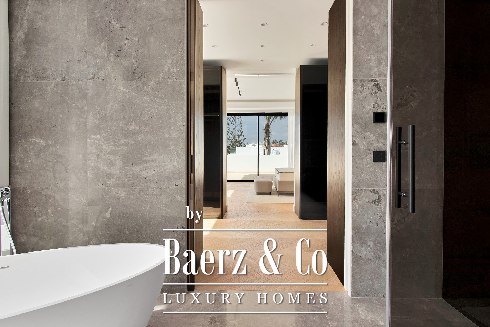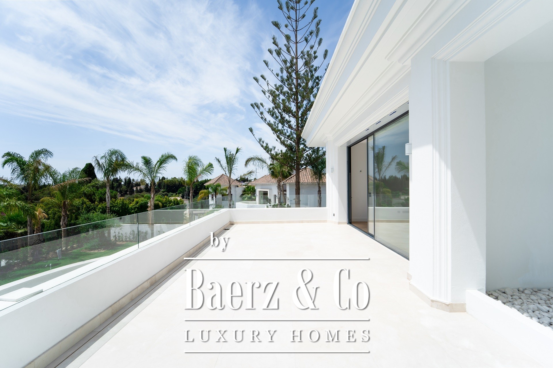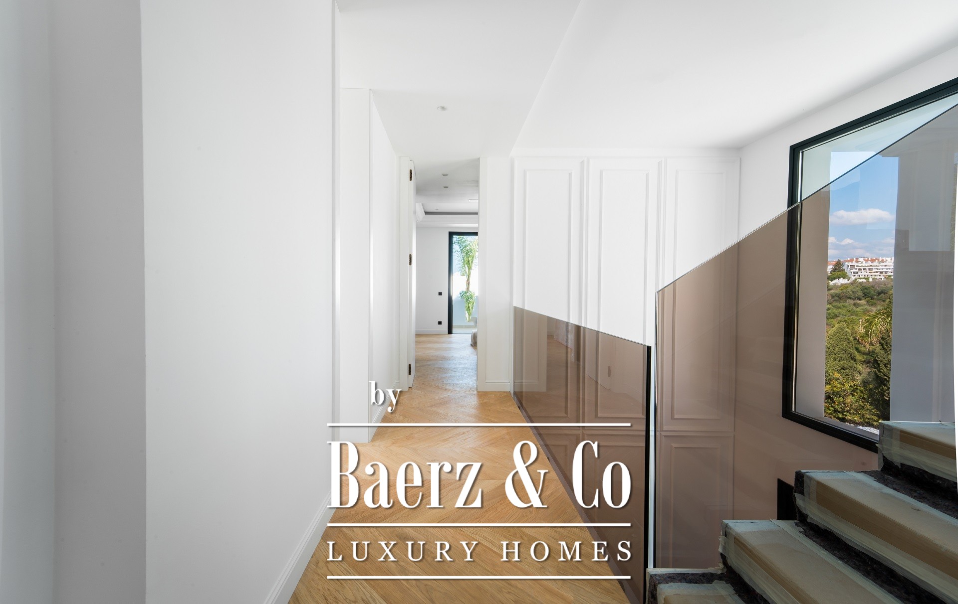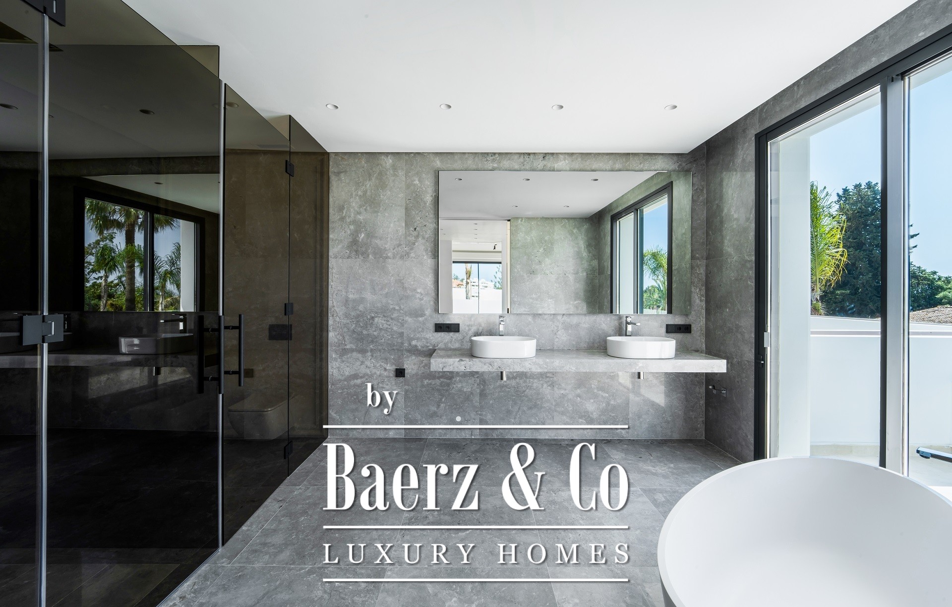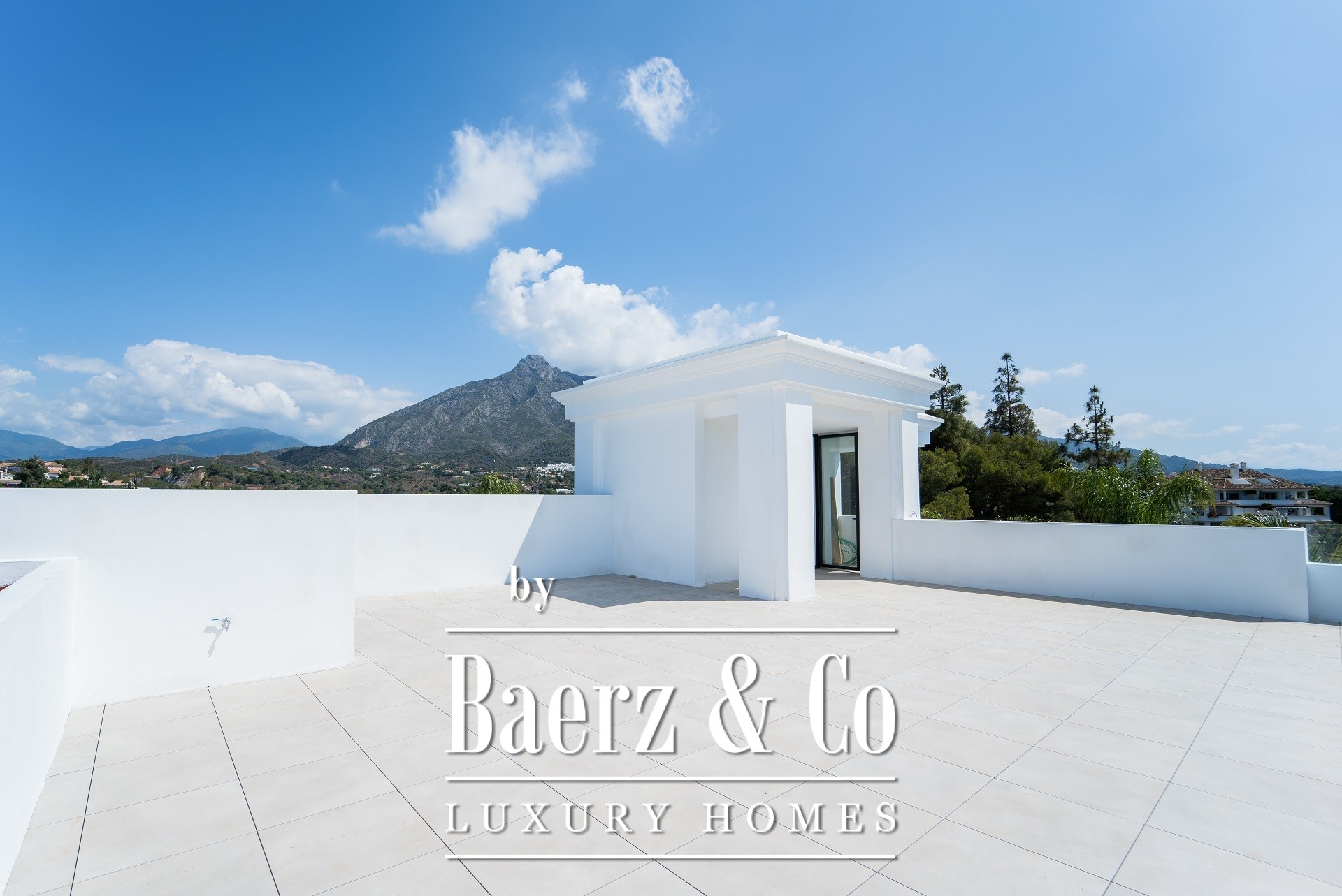 The heated saltwater pool has both a covered and uncovered terrace and a stylish hammock area that invites you to enjoy the good weather of Marbella with family and friends and also the privacy of the plot. Every villa has a garden that surrounds her, with green areas and decorated with a variety of floral plants and palm trees that give color and movement. Entering the villa, there is a very spacious outdoor parking decorated with a water fountain that gives an elegant touch and character to the entrance.