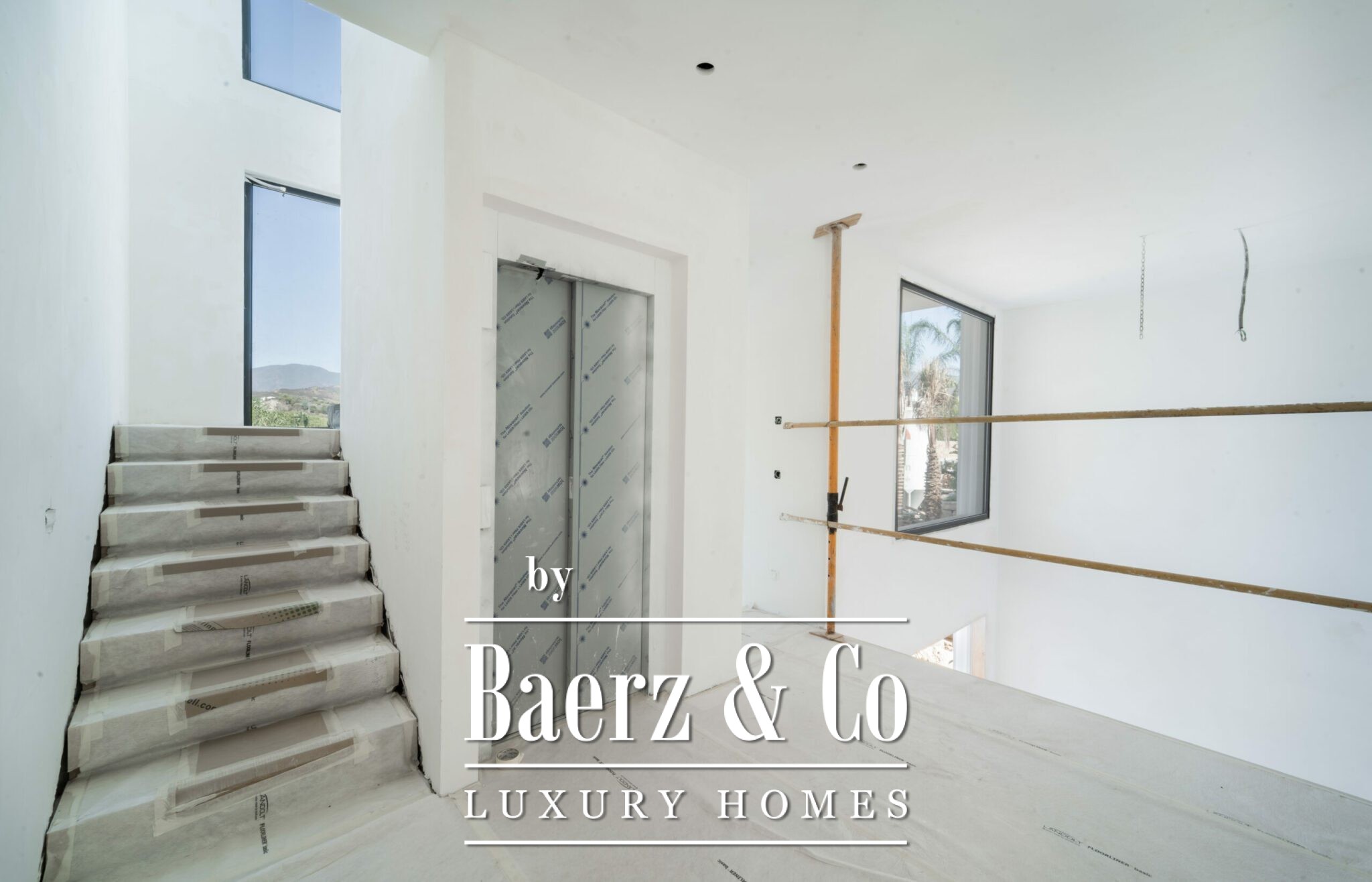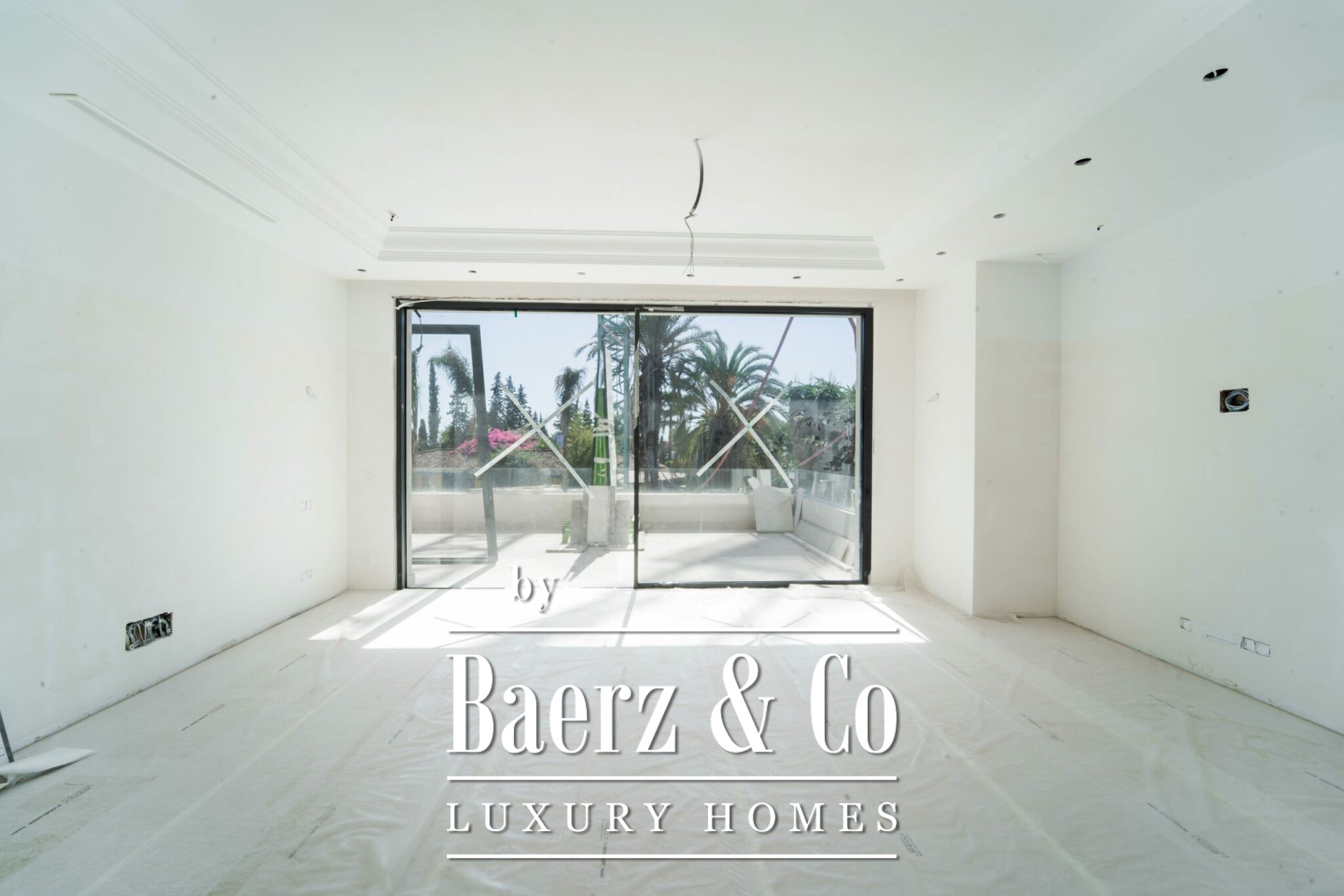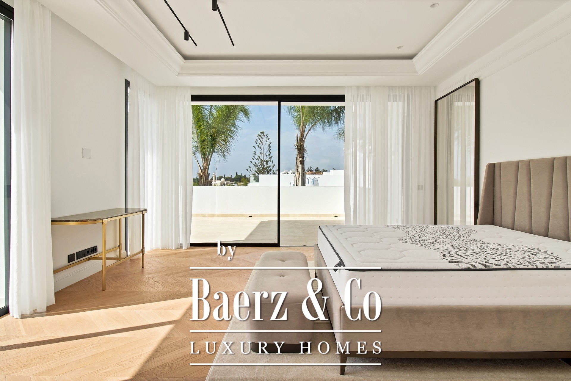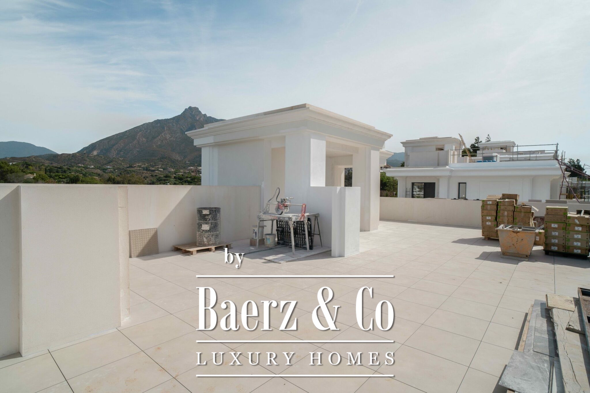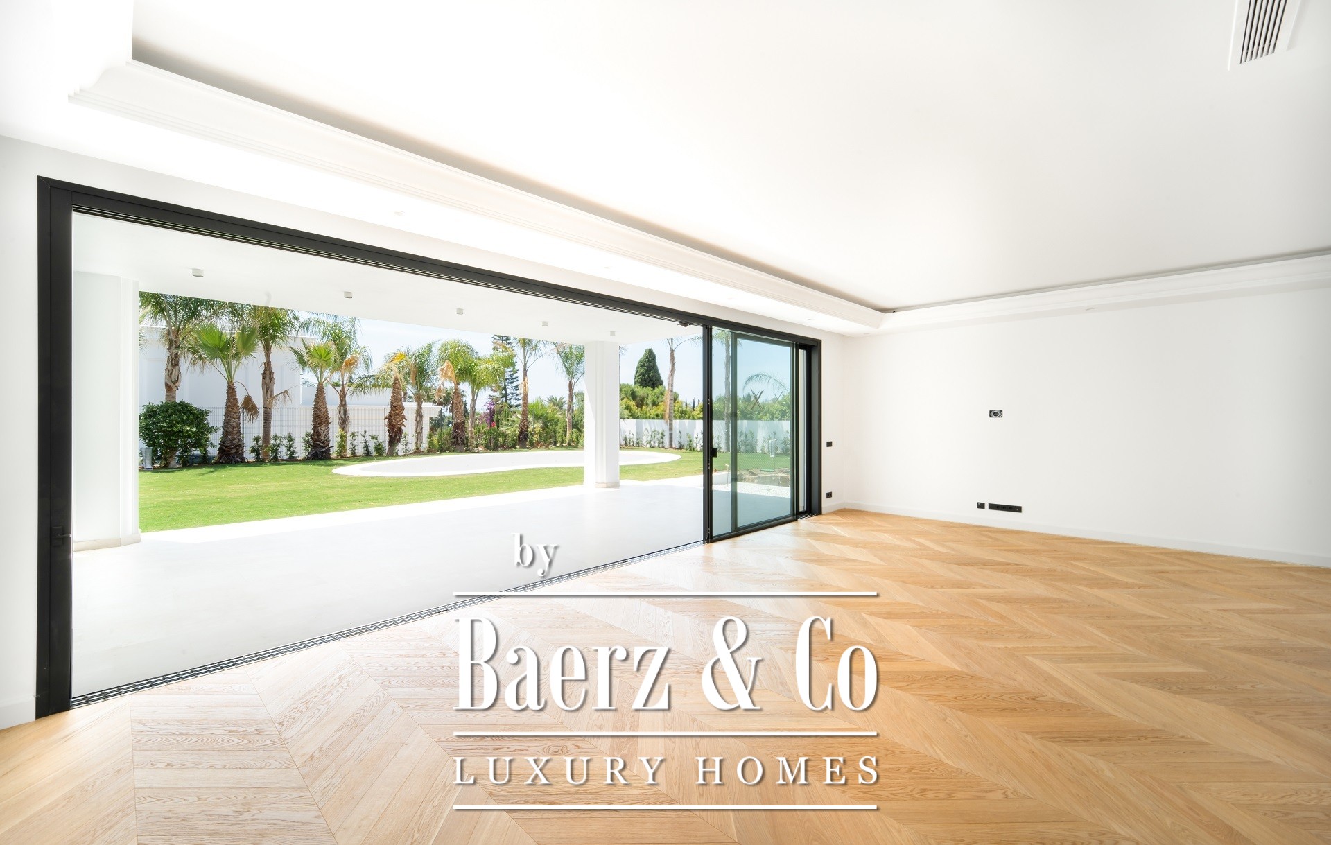 The heated saltwater pool has both a covered and uncovered terrace and a stylish hammock area that invites you to enjoy the good weather of Marbella with family and friends and also the privacy of the plot. Every villa has a garden that surrounds her, with green areas and decorated with a variety of floral plants and palm trees that give color and movement. Entering the villa, there is a very spacious outdoor parking decorated with a water fountain that gives an elegant touch and character to the entrance.