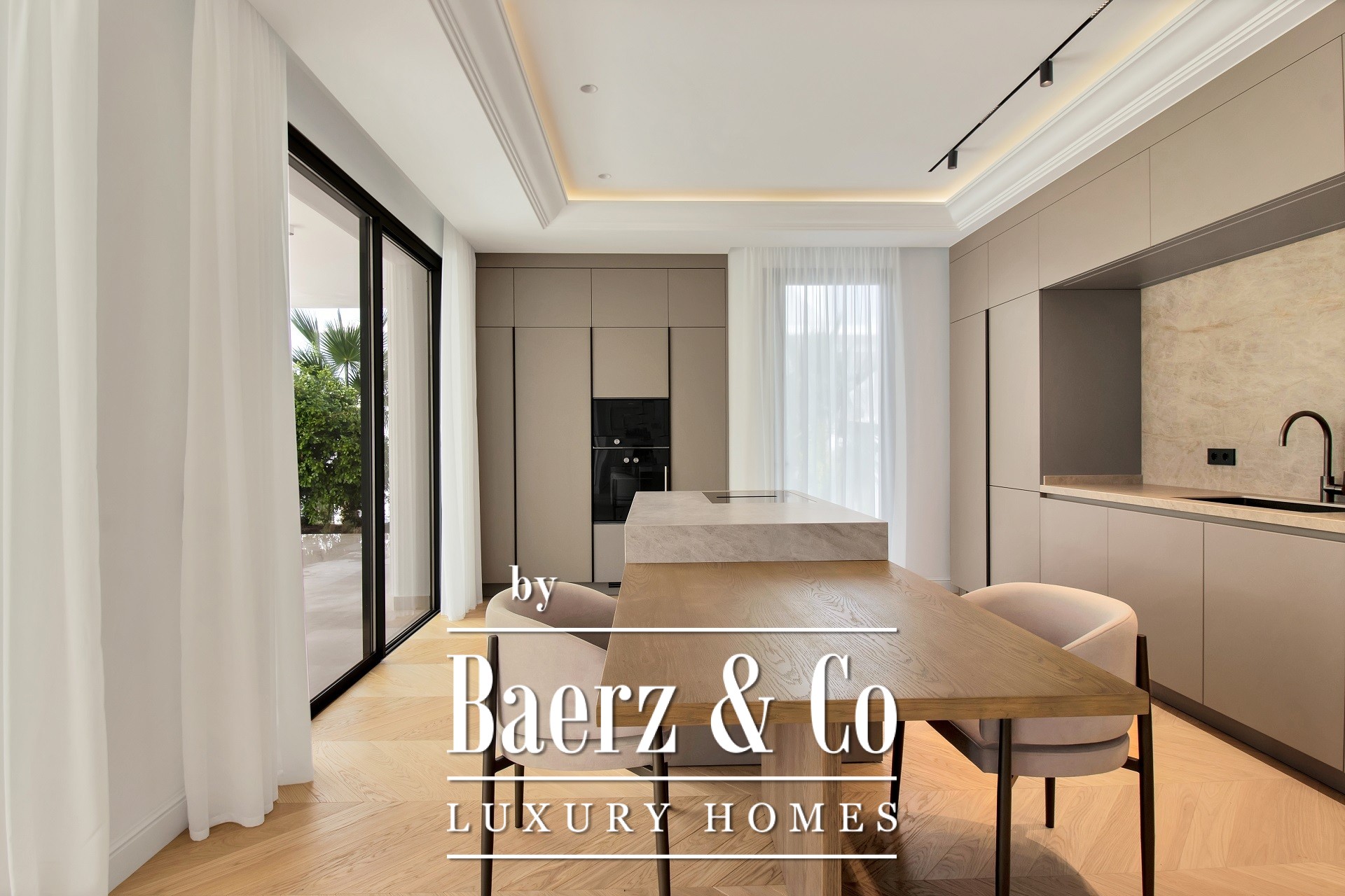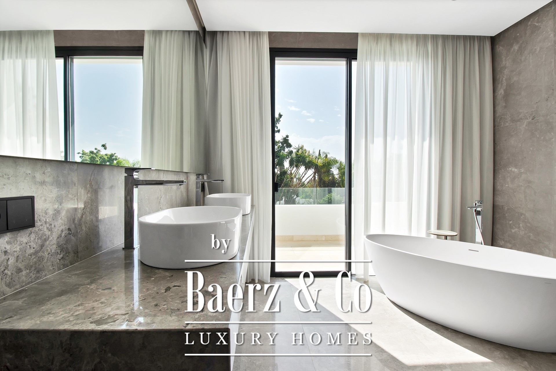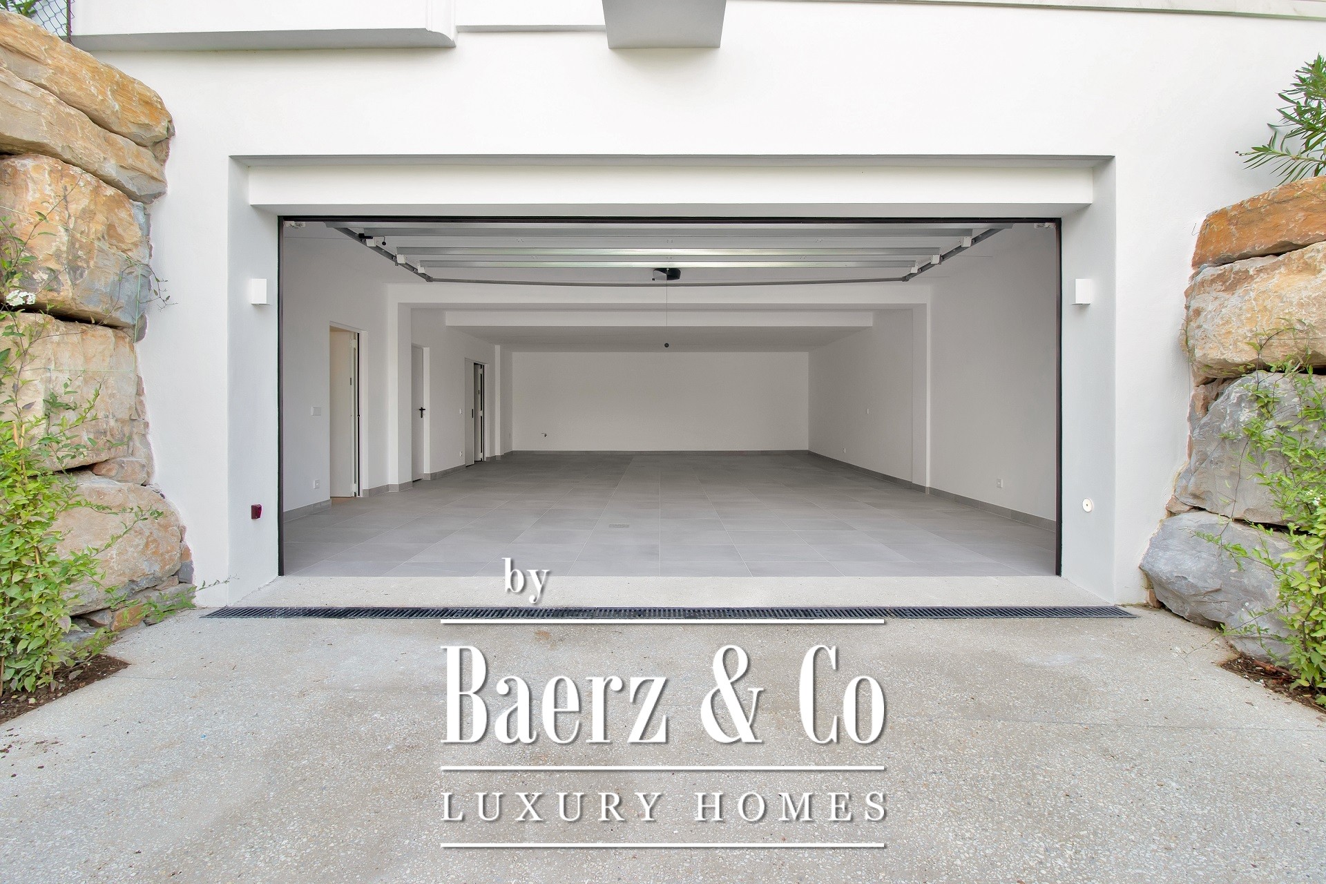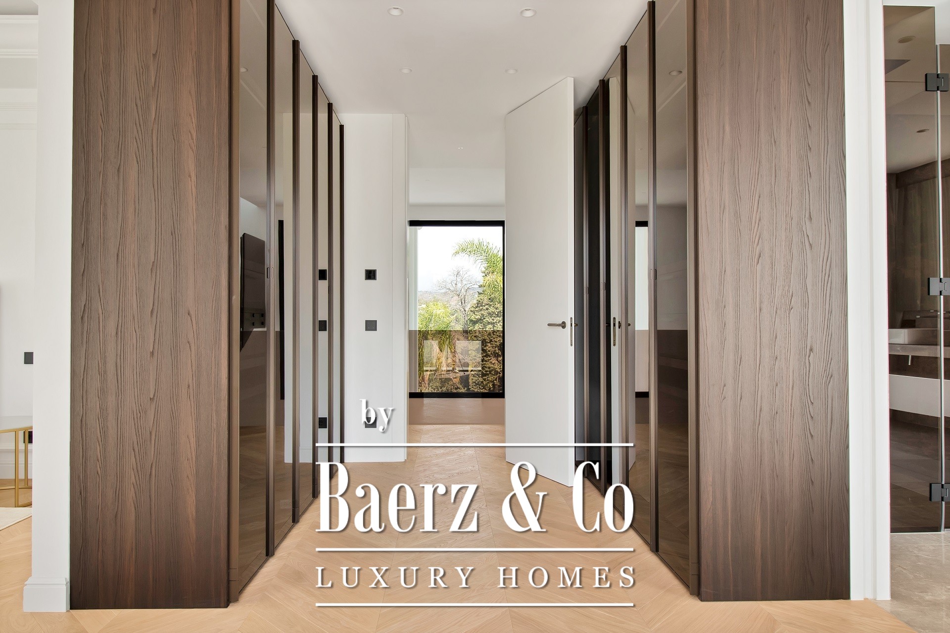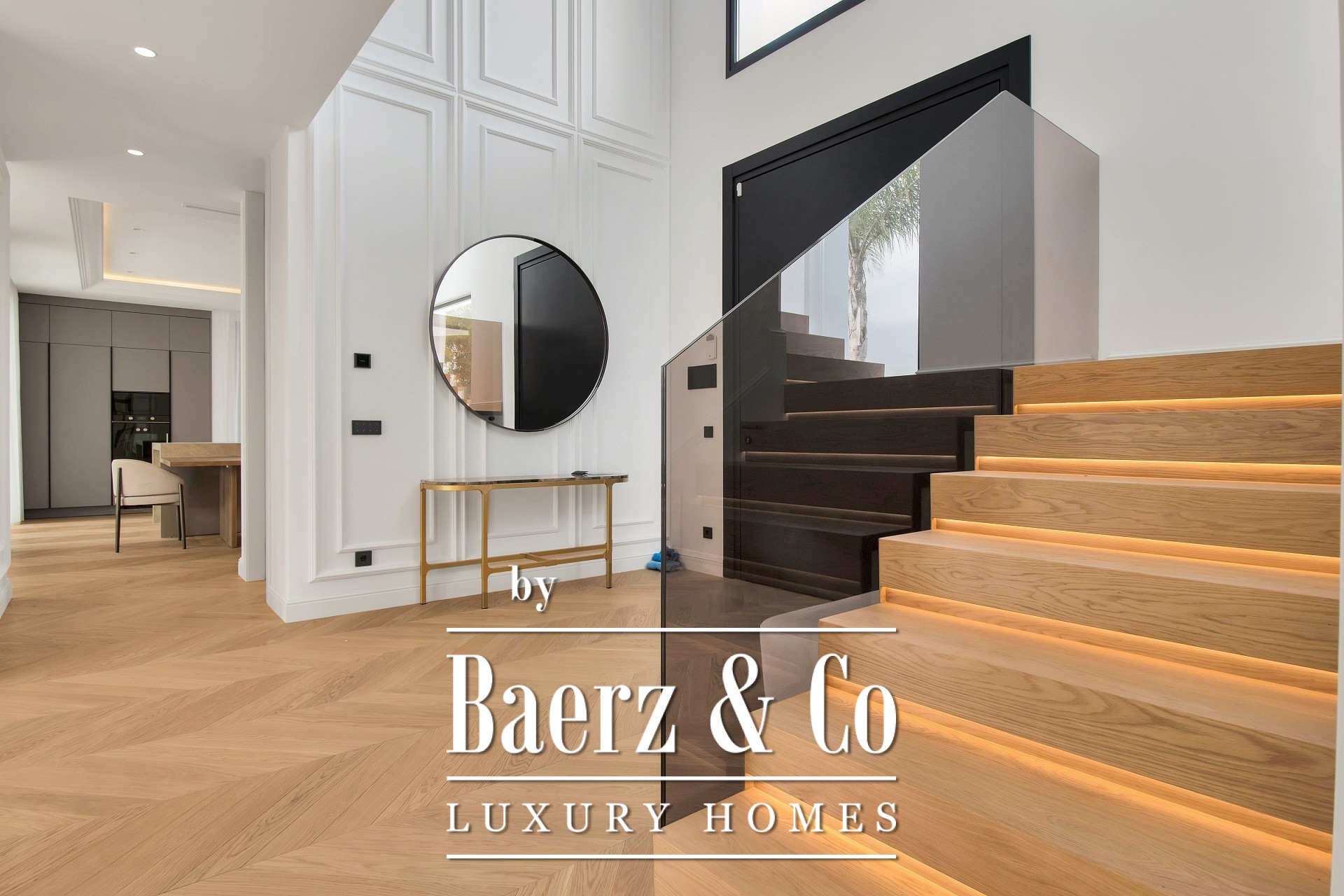 The villa is well proportioned in terms of layout, spread over 3 levels and a solarium to create an exquisitely tasteful 5-bedroom residence with multiple entertaining areas. Access to the villa is impressive thanks to its double height ceiling and large contemporary pillars. Entering the villa, the main floor has a large space divided into several areas, one of them with a large fireplace, dining area and living area. The fully equipped kitchen with outstanding appliances has a custom made island. The entire floor has access to the terraces, garden and pool, with areas to relax and have fun.