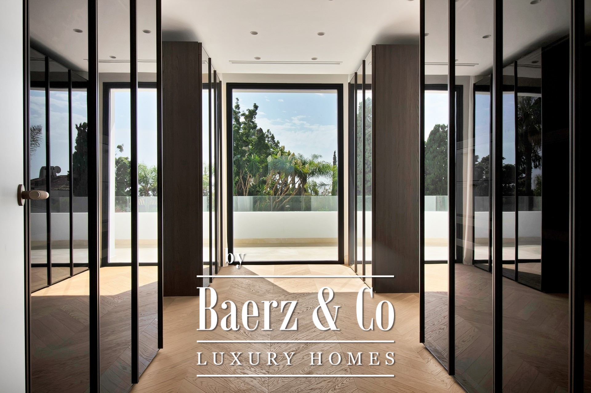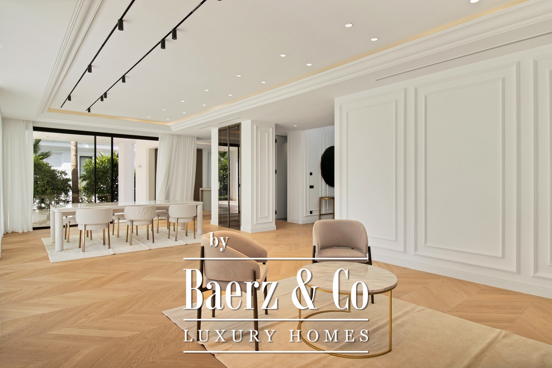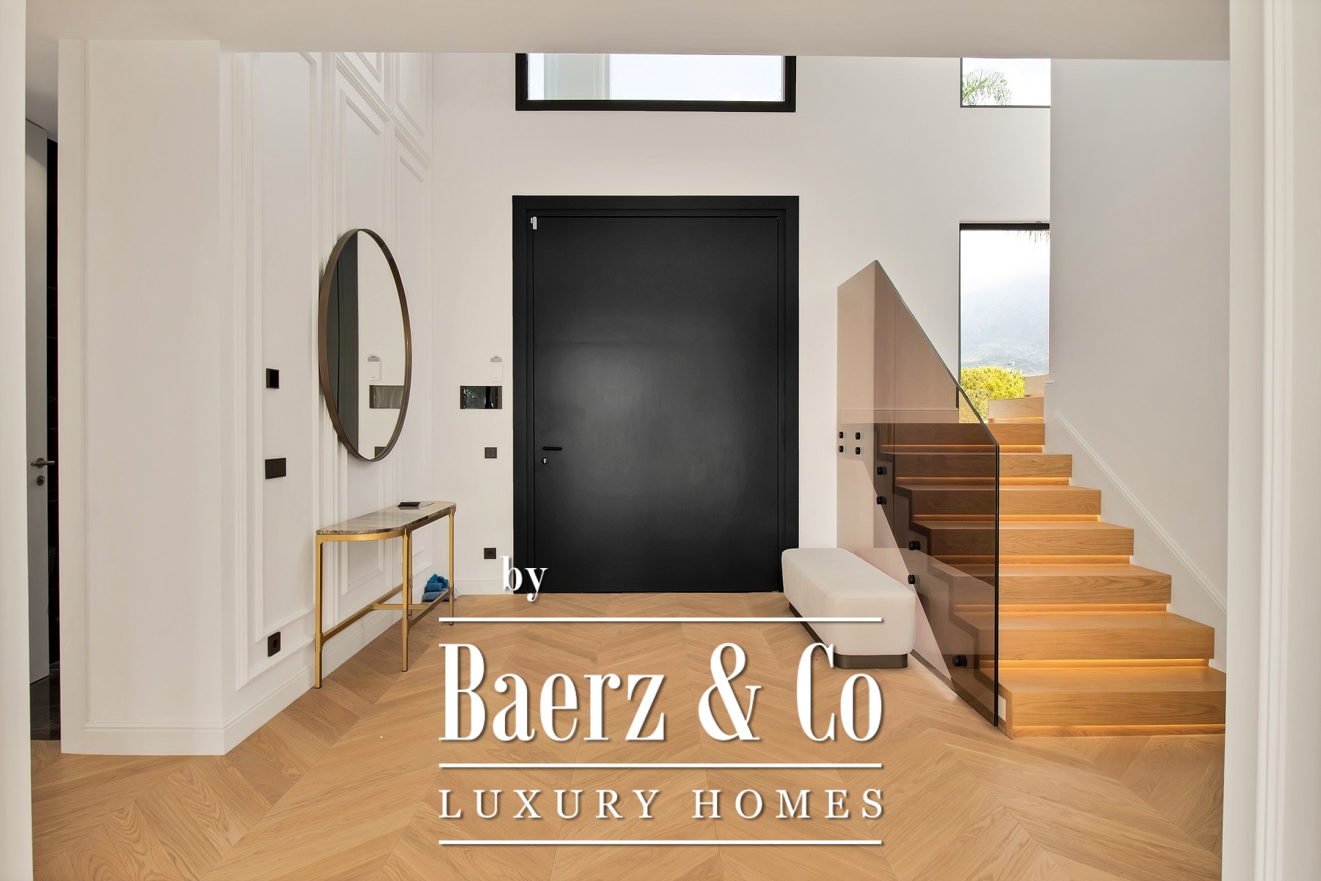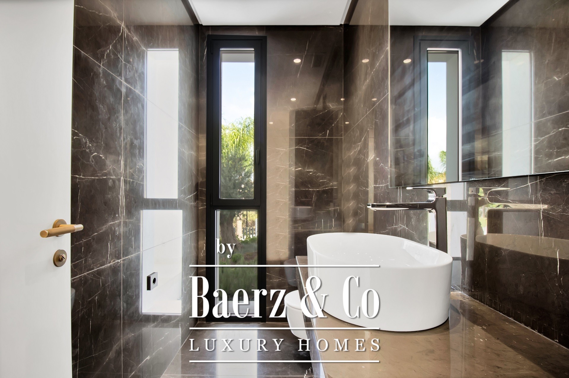 The villa is well proportioned in terms of layout, spread over 3 levels and a solarium to create an exquisitely tasteful 5-bedroom residence with multiple entertaining areas. Access to the villa is impressive thanks to its double height ceiling and large contemporary pillars. Entering the villa, the main floor has a large space divided into several areas, one of them with a large fireplace, dining area and living area. The fully equipped kitchen with outstanding appliances has a custom made island. The entire floor has access to the terraces, garden and pool, with areas to relax and have fun.