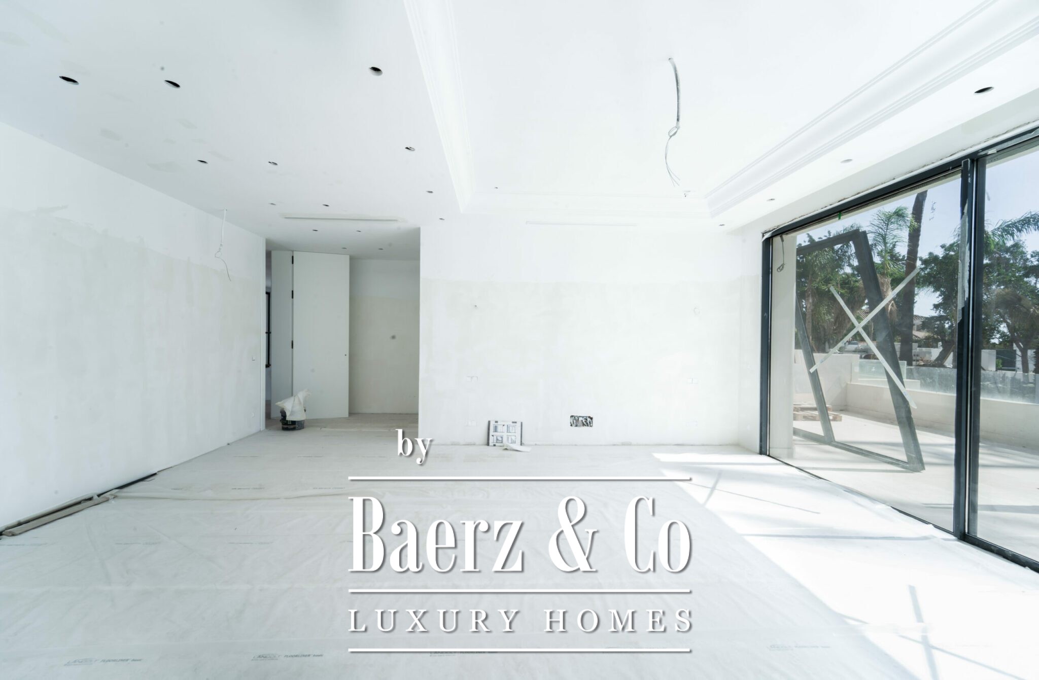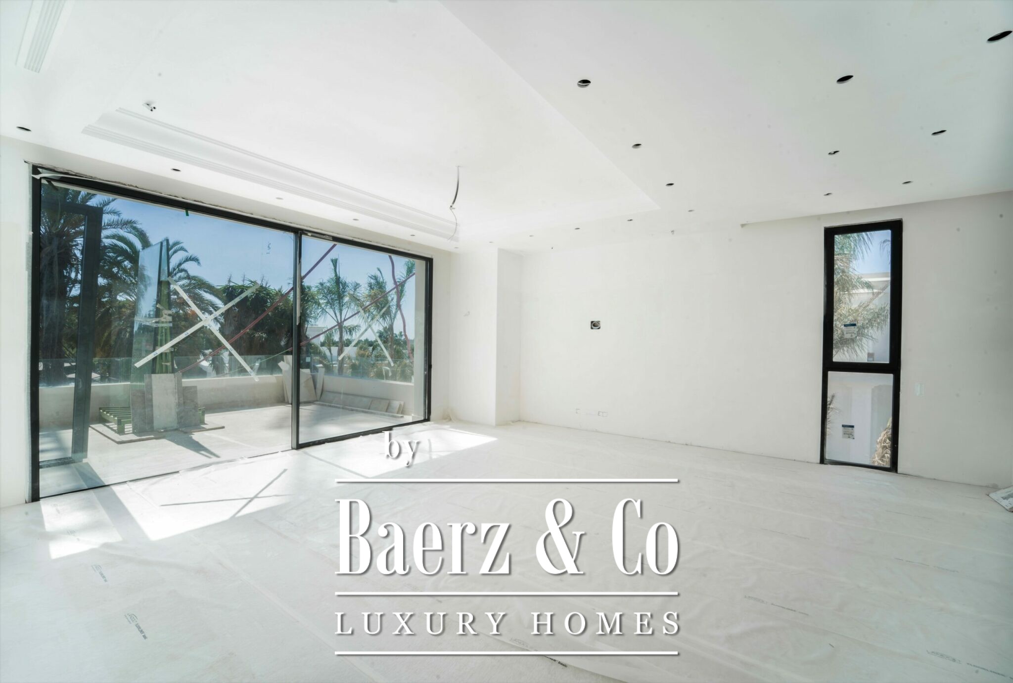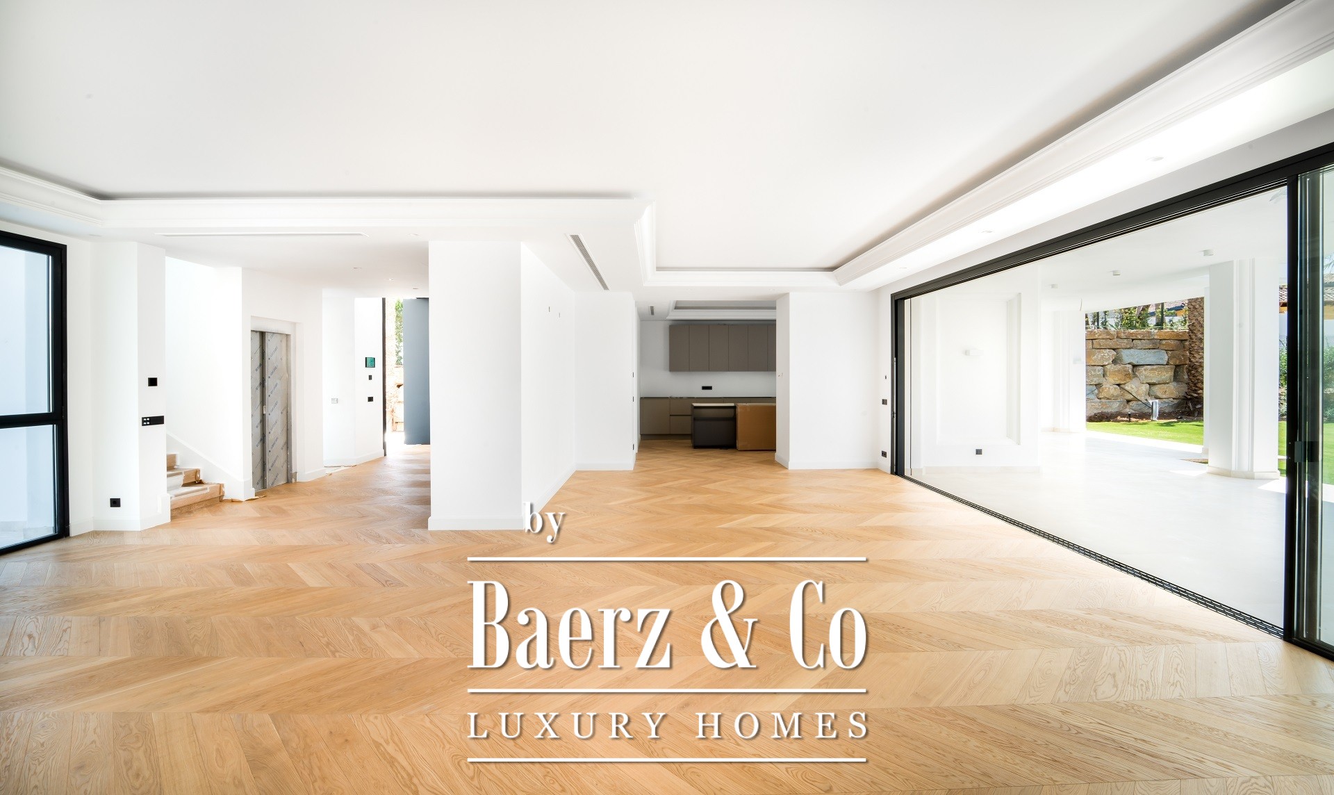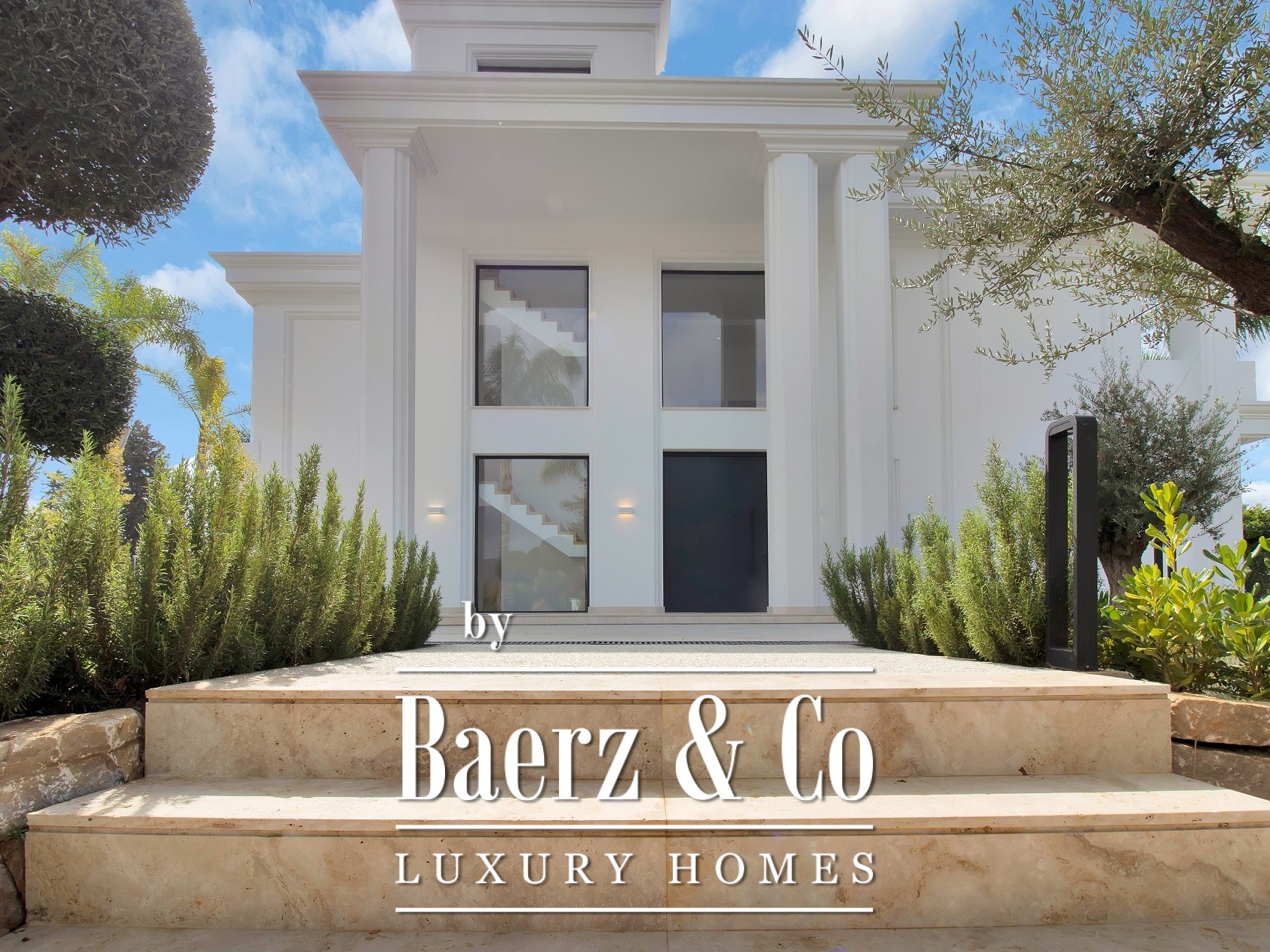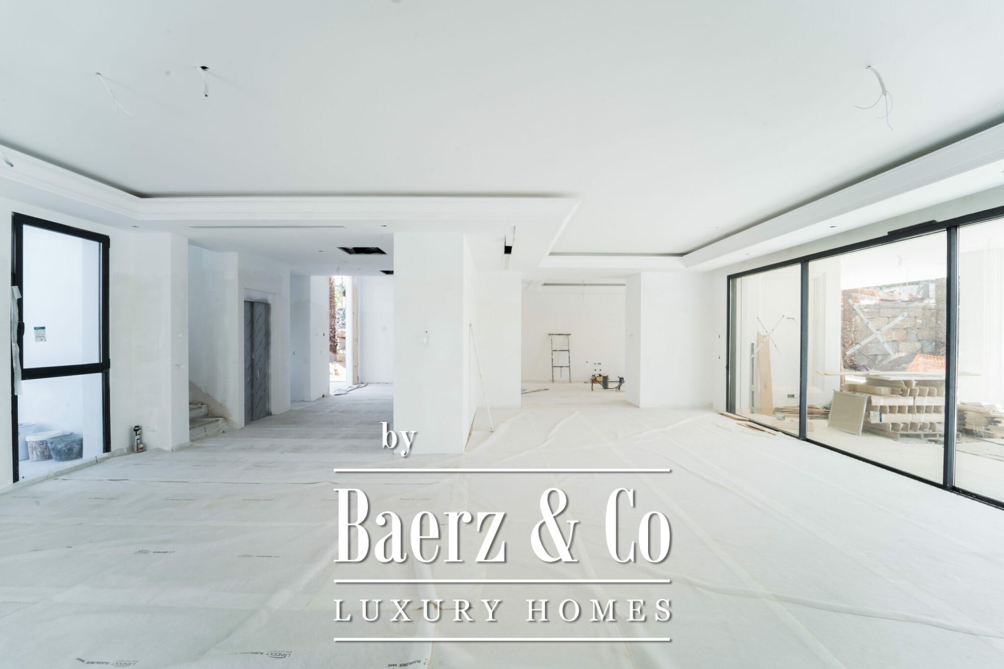 The villa is well proportioned in terms of layout, spread over 3 levels and a solarium to create an exquisitely tasteful 5-bedroom residence with multiple entertaining areas. Access to the villa is impressive thanks to its double height ceiling and large contemporary pillars. Entering the villa, the main floor has a large space divided into several areas, one of them with a large fireplace, dining area and living area. The fully equipped kitchen with outstanding appliances has a custom made island. The entire floor has access to the terraces, garden and pool, with areas to relax and have fun.