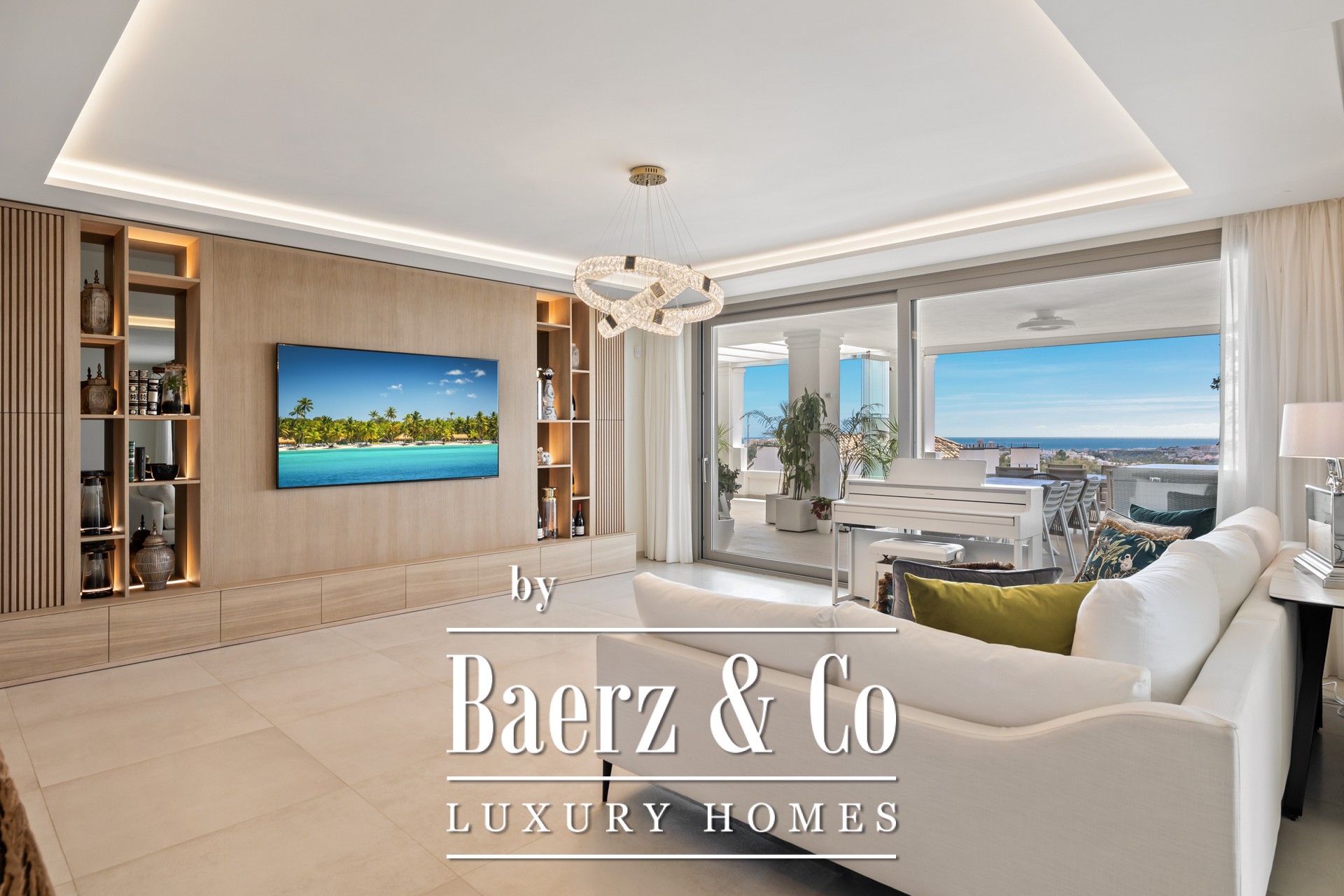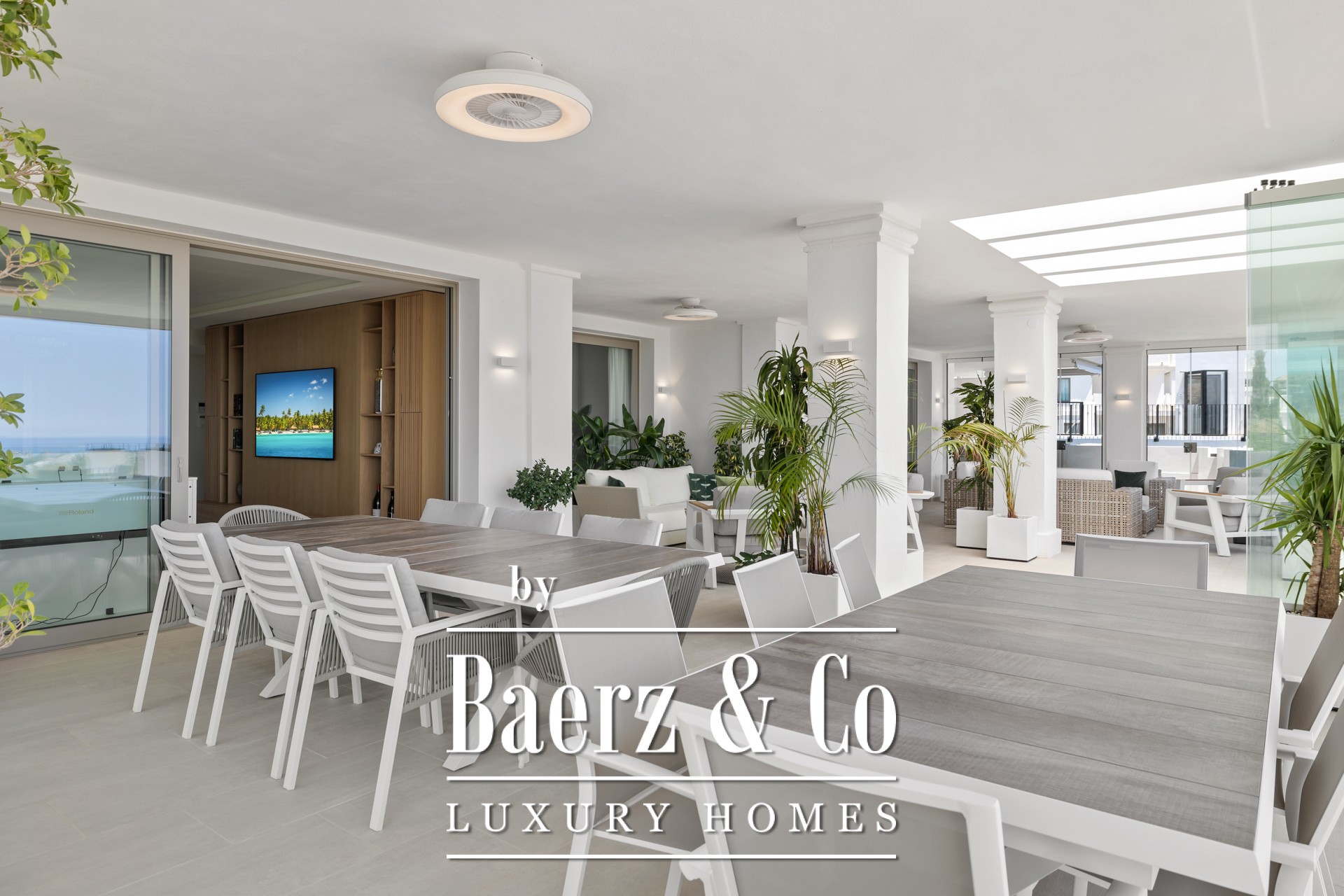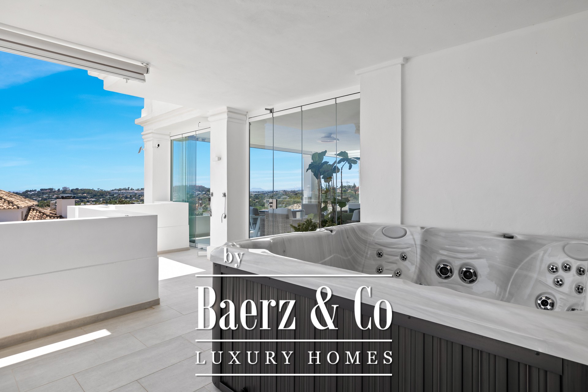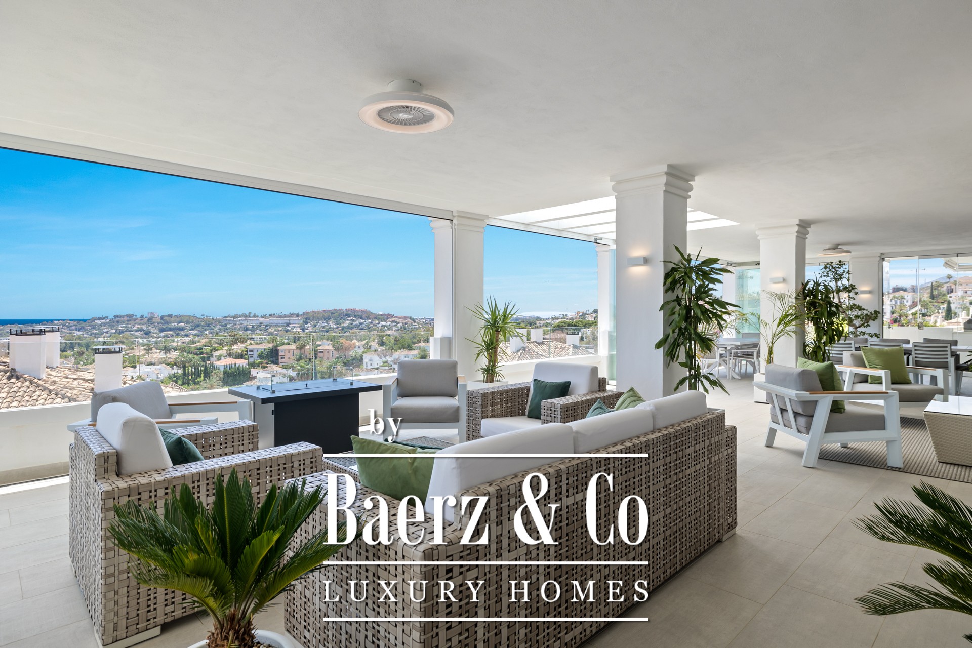 A truly unique stunning 7-bed ground floor apartment located in urb. of Nueva Andalucia. Built to the highest standards. South facing with spectacular views to the coast and Mediterranean. Only a short drive to all amenities, the beach, Puerto Banus and Marbella centre.
