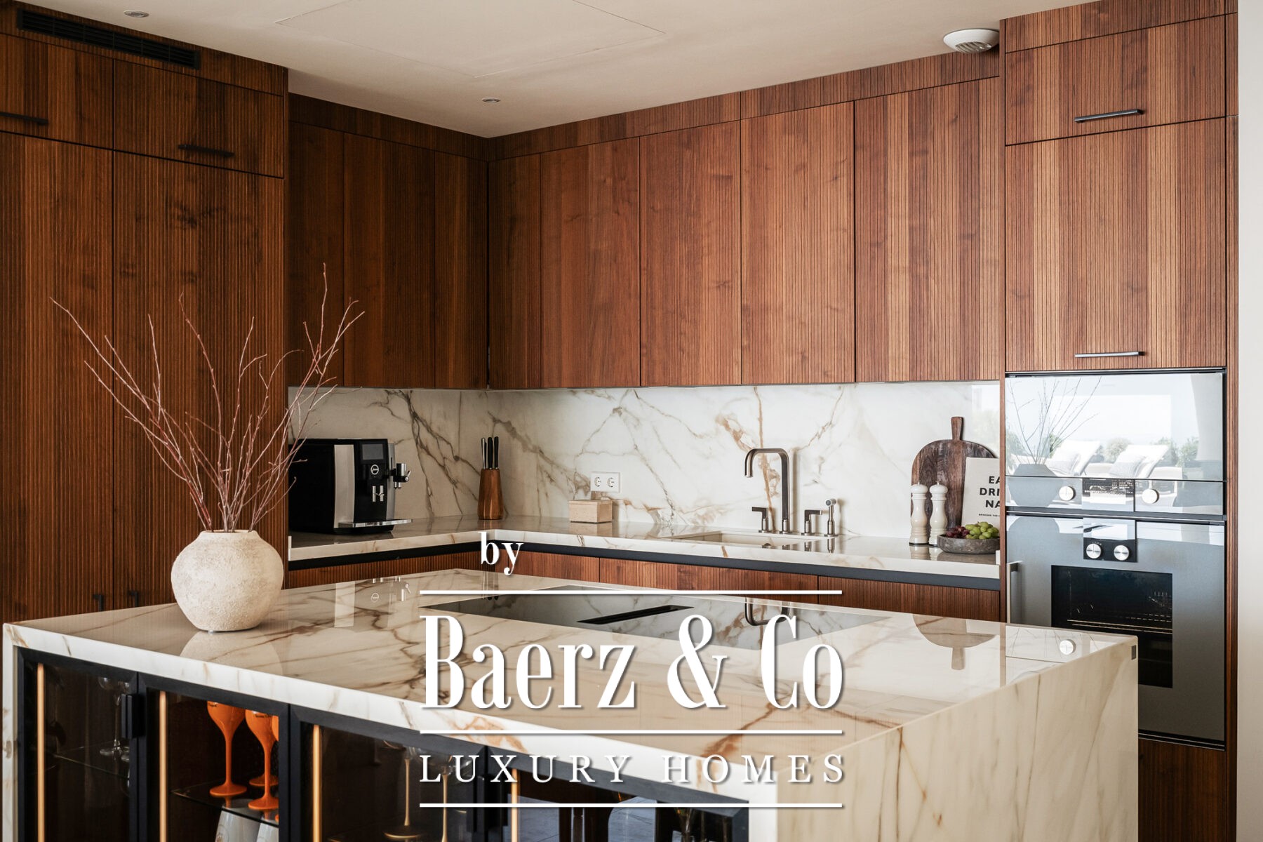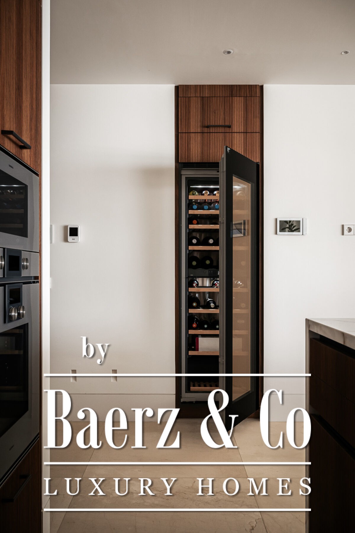 A central hall divides the layout. On one side, the social spaces: an open-plan kitchen with Gaggenau and Miele appliances, floor-to-ceiling wine display, and automated windows that open fully to merge interior and exterior. An L-shaped terrace wraps the space with sea views, lounge, dining area, jacuzzi, outdoor shower and summer kitchen—surrounded by landscaped greenery that brings the atmosphere of a private villa.