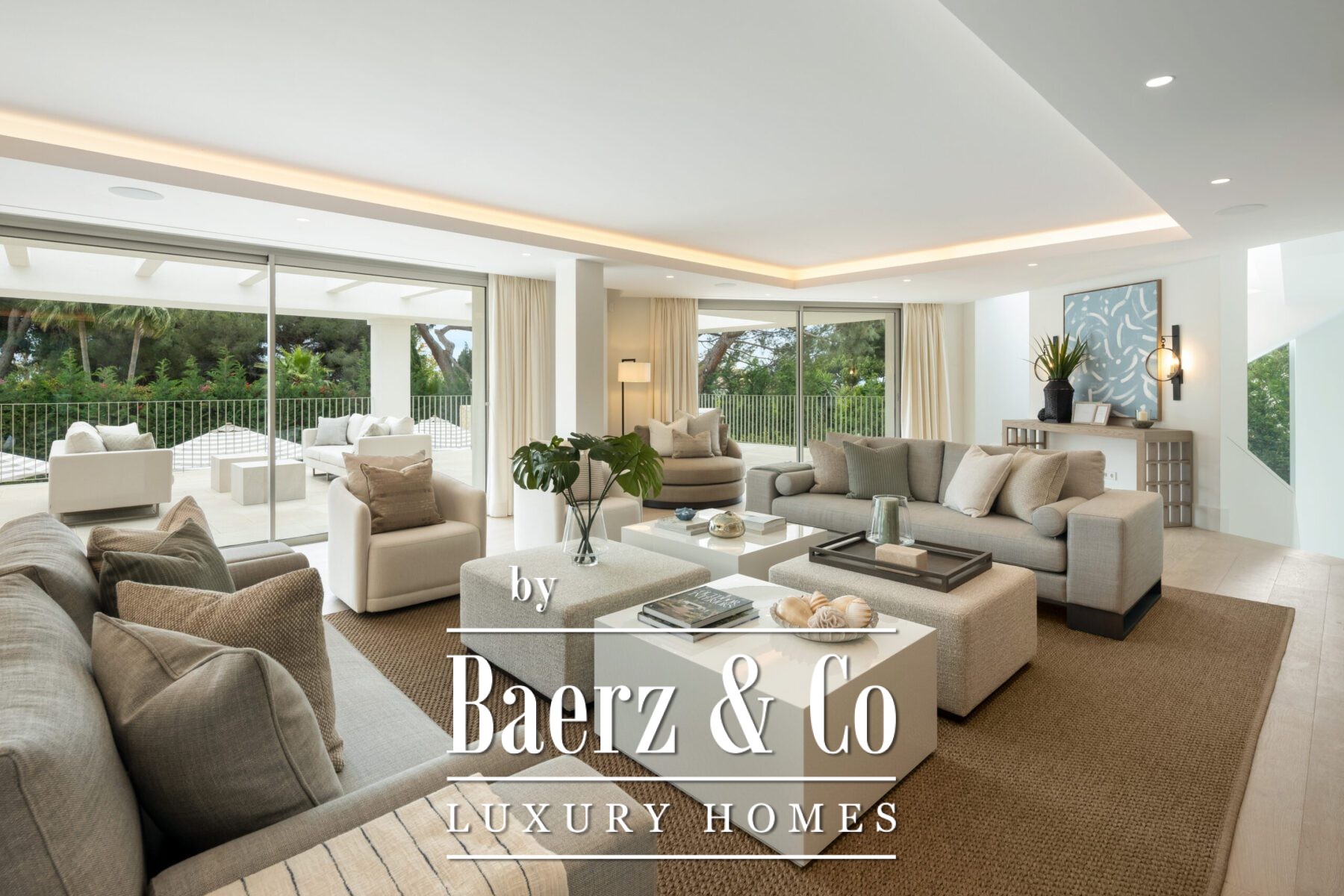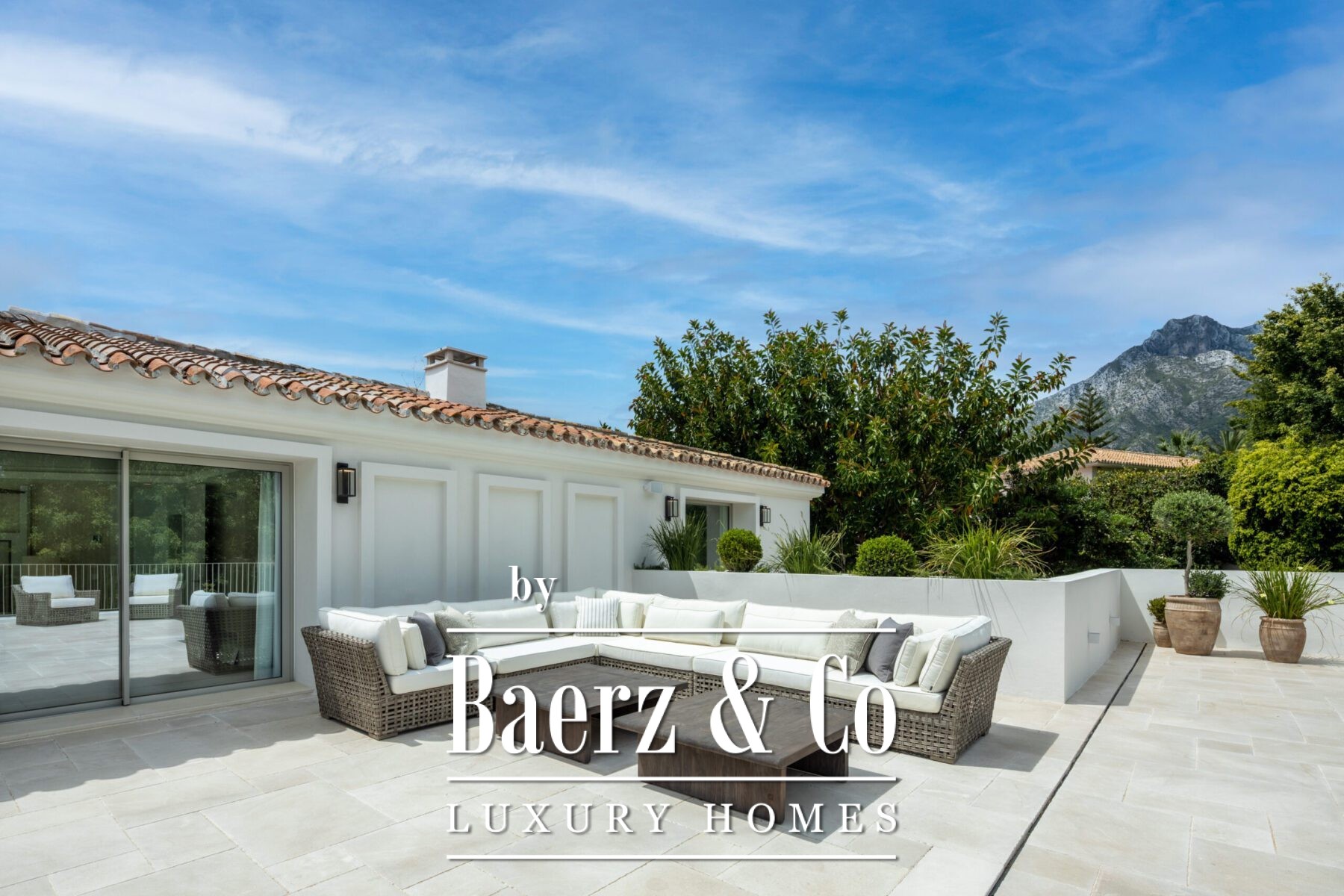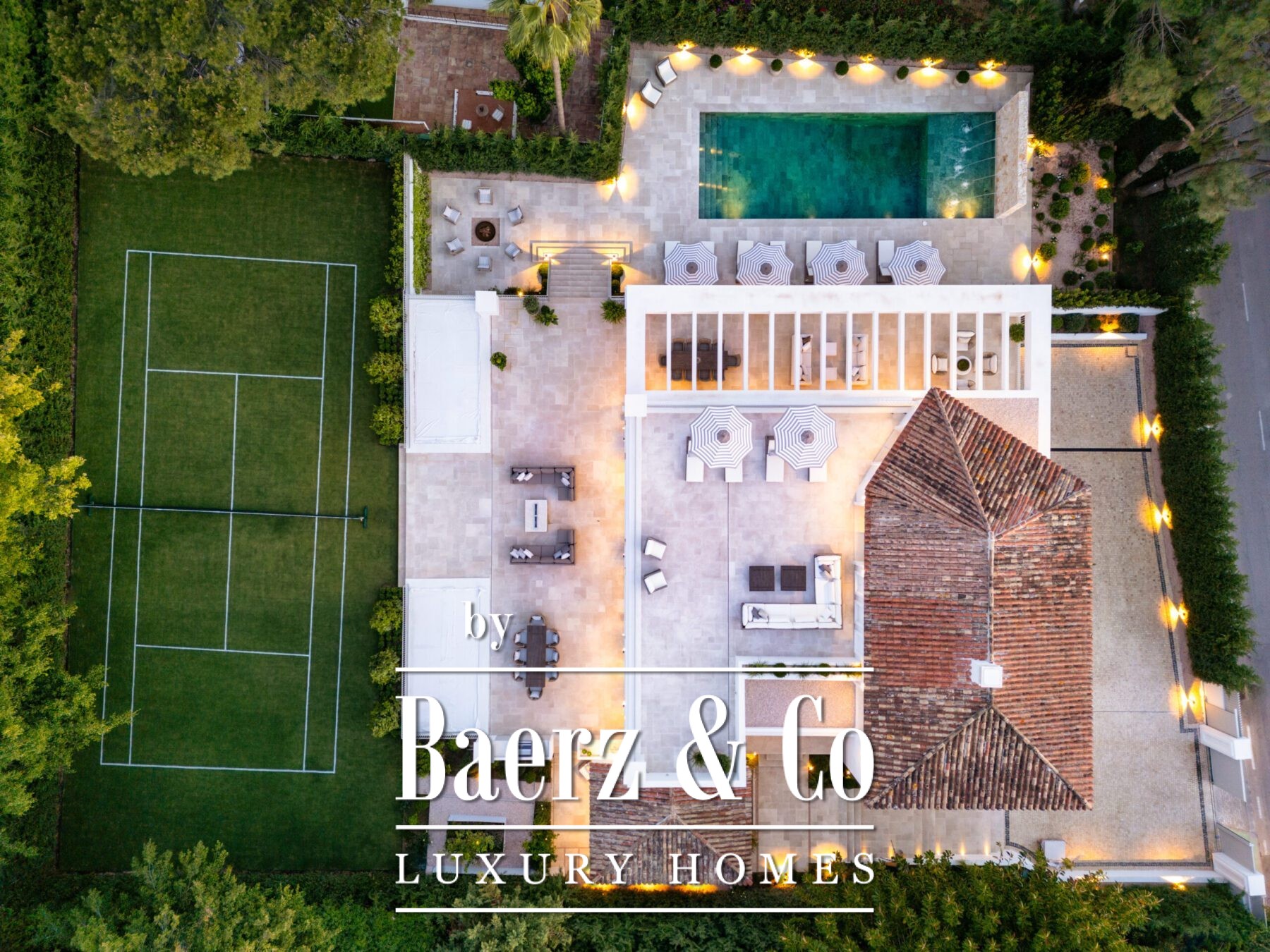 Positioned on a flat 2,370 m² plot with 712 m² of internal space, the villa combines sharp architectural lines with warm natural materials and traditional touches, creating a timeless and inviting character. Expansive glass doors open to landscaped gardens, a large swimming pool and multiple outdoor dining and lounge areas. The property also enjoys impressive views of La Concha mountain. It stands out as one of the only homes on the Golden Mile with a full-size private grass tennis court.