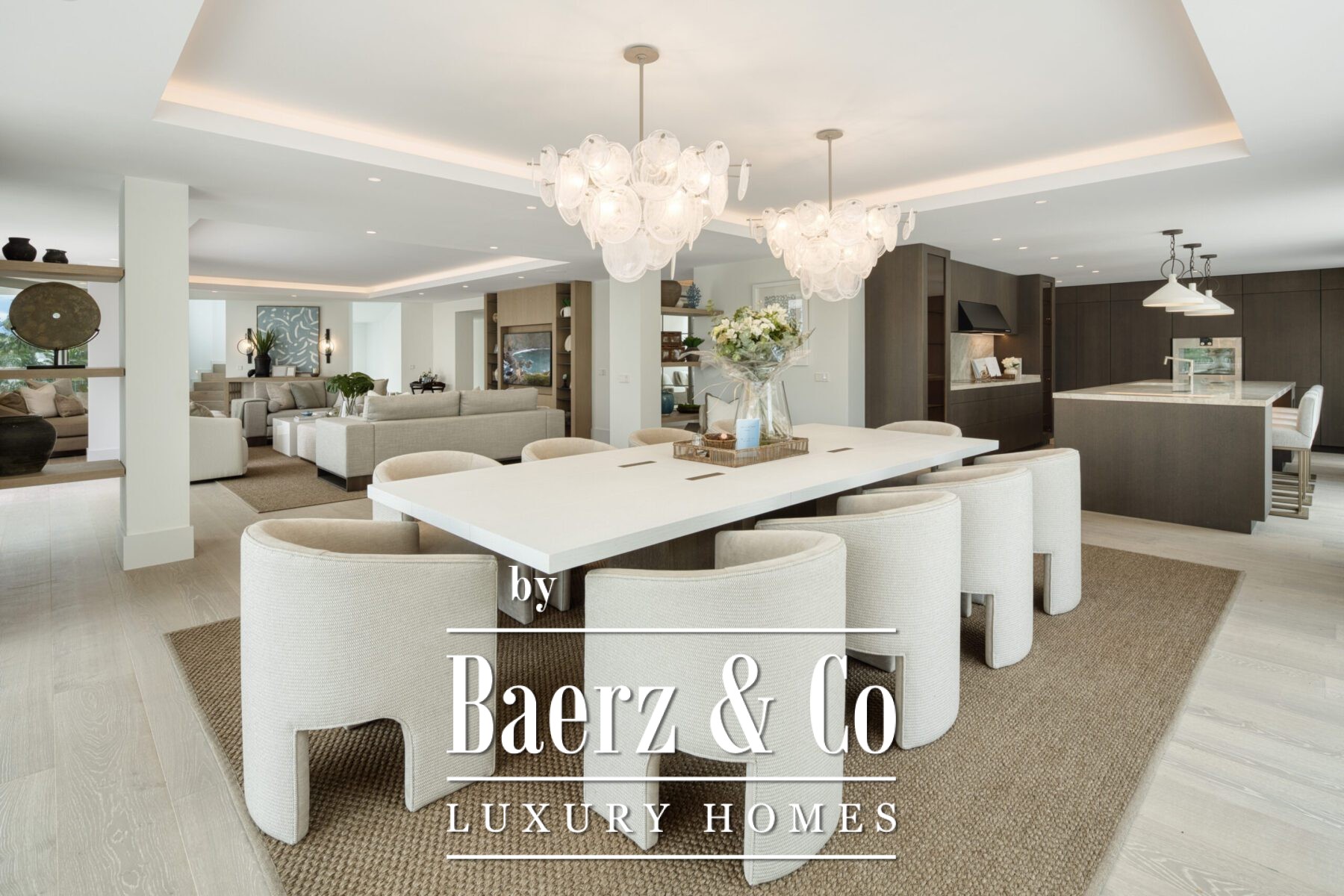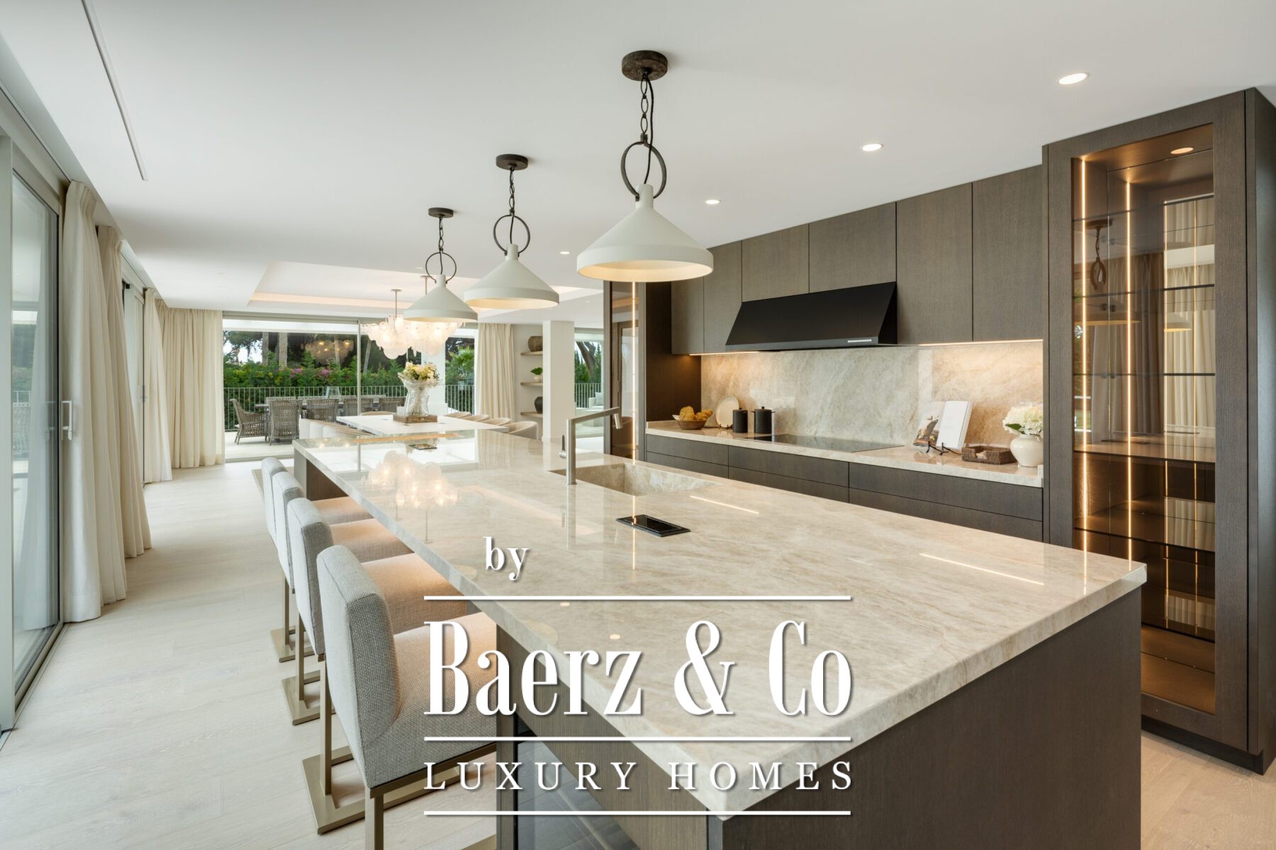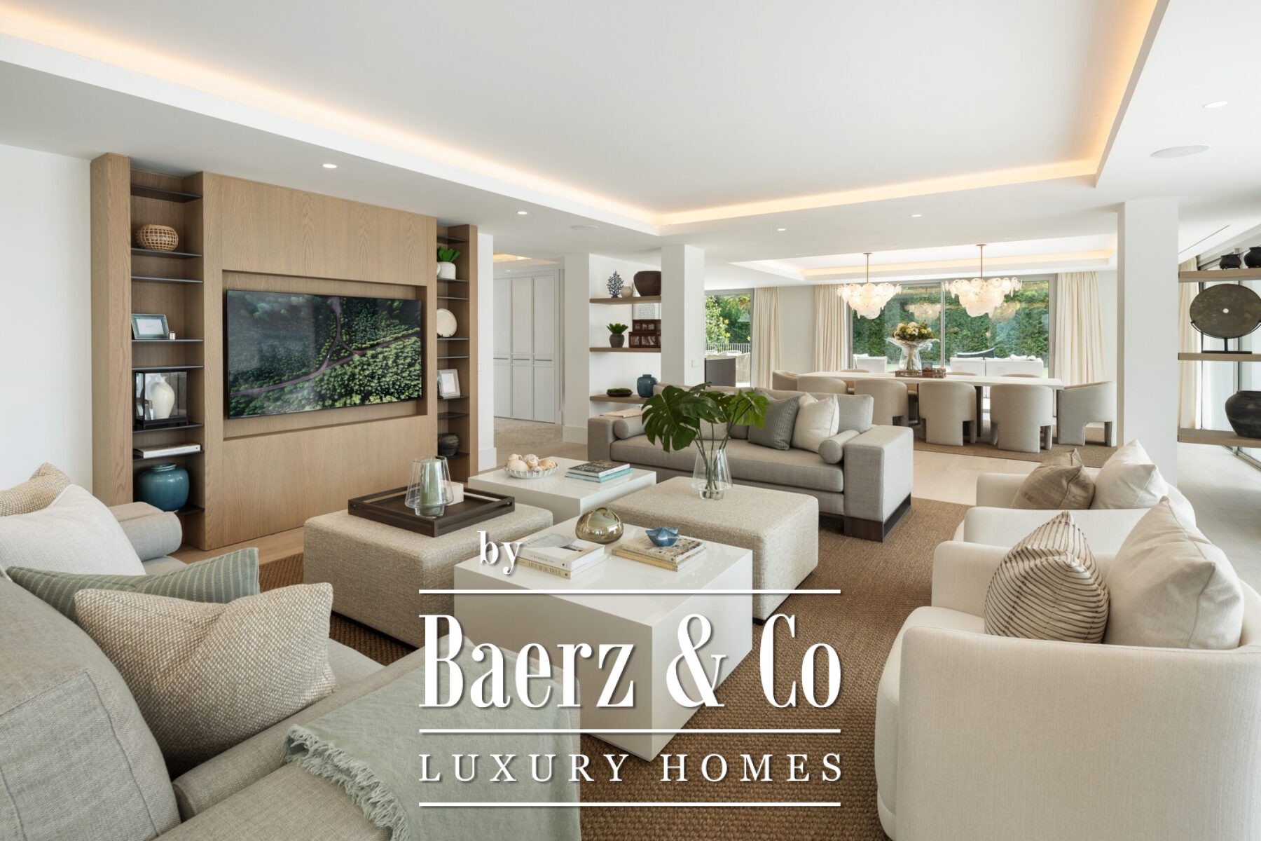 Positioned on a flat 2,370 m² plot with 712 m² of internal space, the villa combines sharp architectural lines with warm natural materials and traditional touches, creating a timeless and inviting character. Expansive glass doors open to landscaped gardens, a large swimming pool and multiple outdoor dining and lounge areas. The property also enjoys impressive views of La Concha mountain. It stands out as one of the only homes on the Golden Mile with a full-size private grass tennis court.