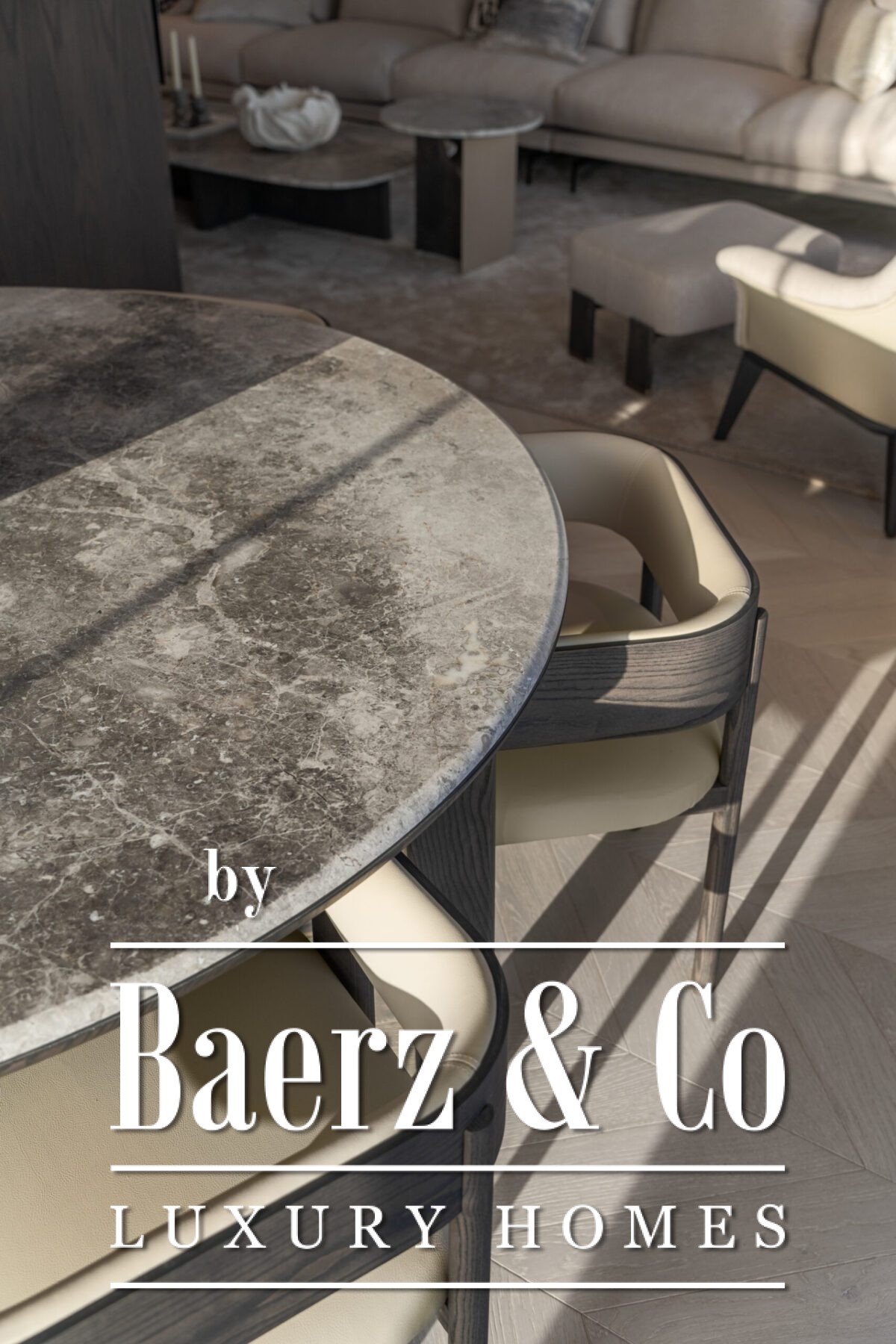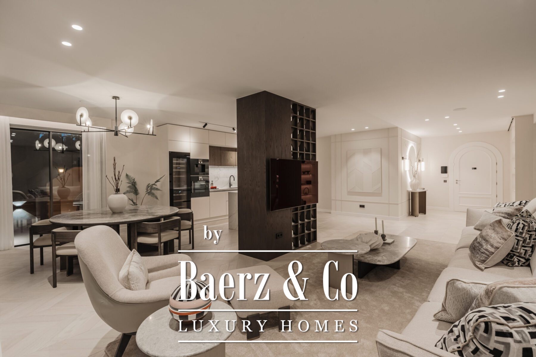 The apartment features an open-concept living and dining area with floor-to-ceiling windows that flood the space with natural light and create a seamless transition to the expansive outdoor terrace. The kitchen is equipped with state-of-the-art Gaggenau appliances, natural oak floors add warmth and character, and a smart home system allows for effortless control of lighting, temperature, and more.