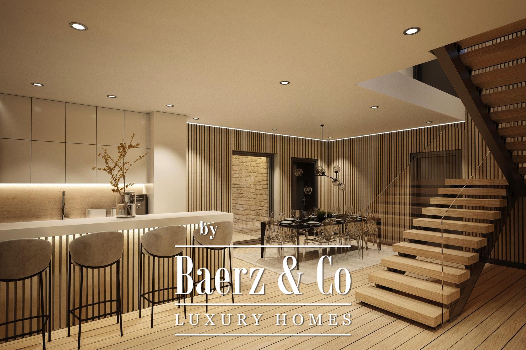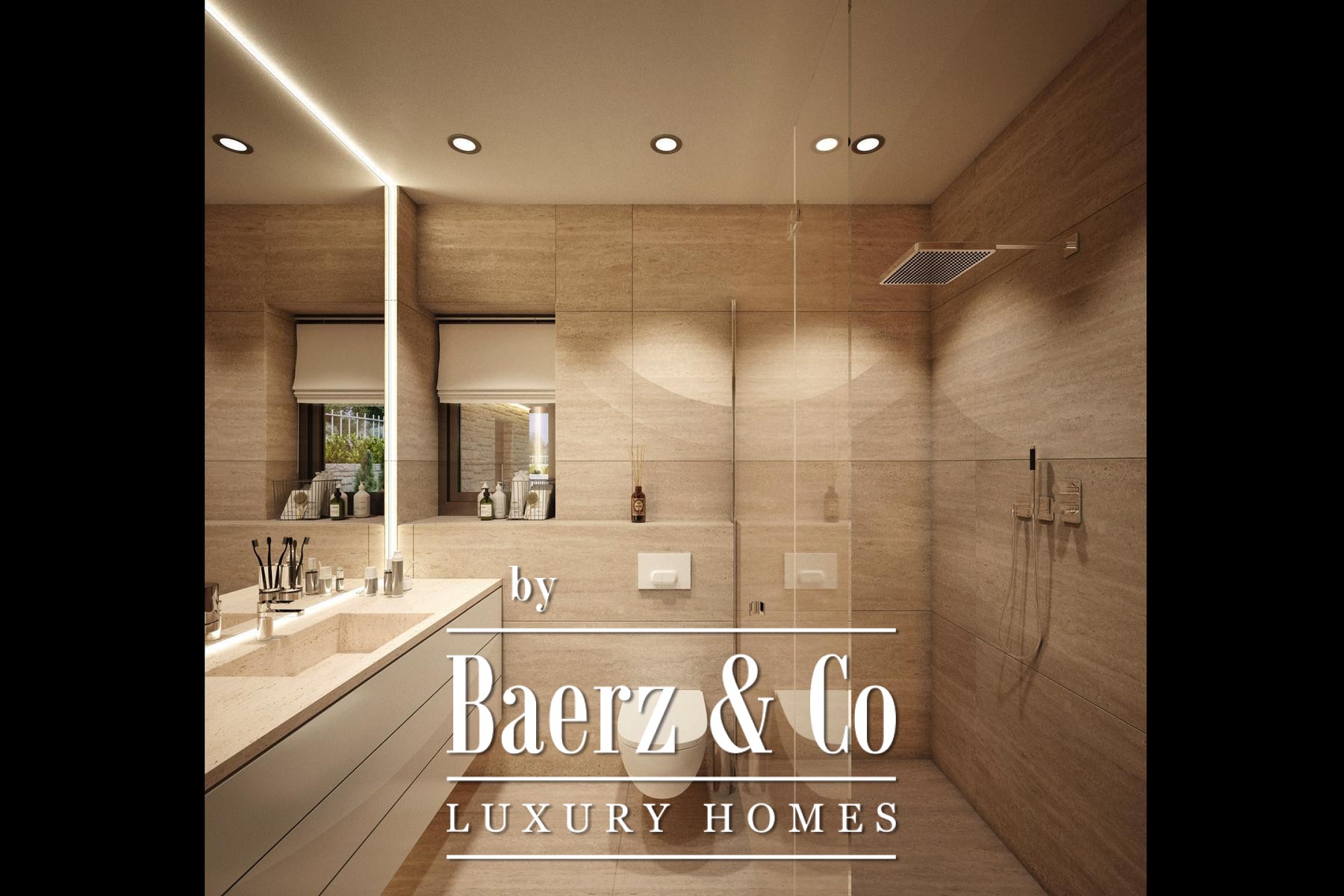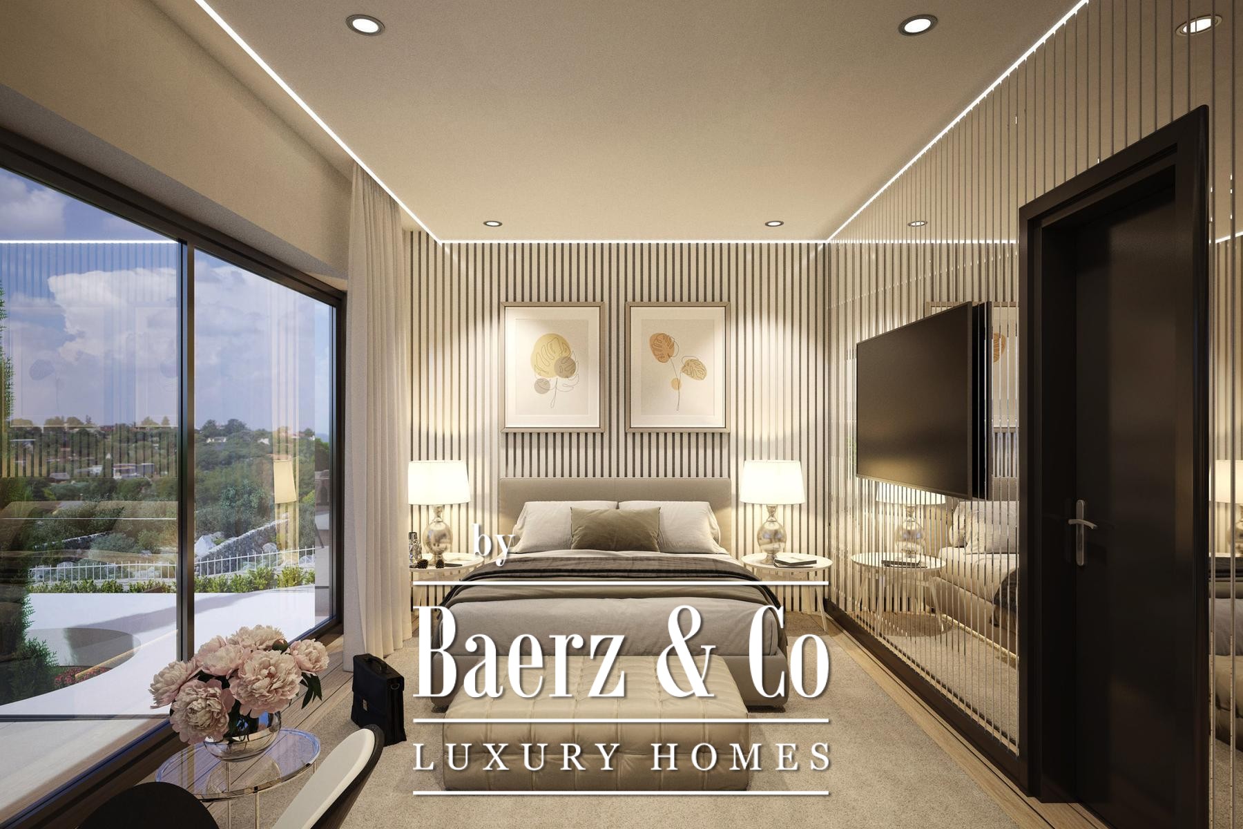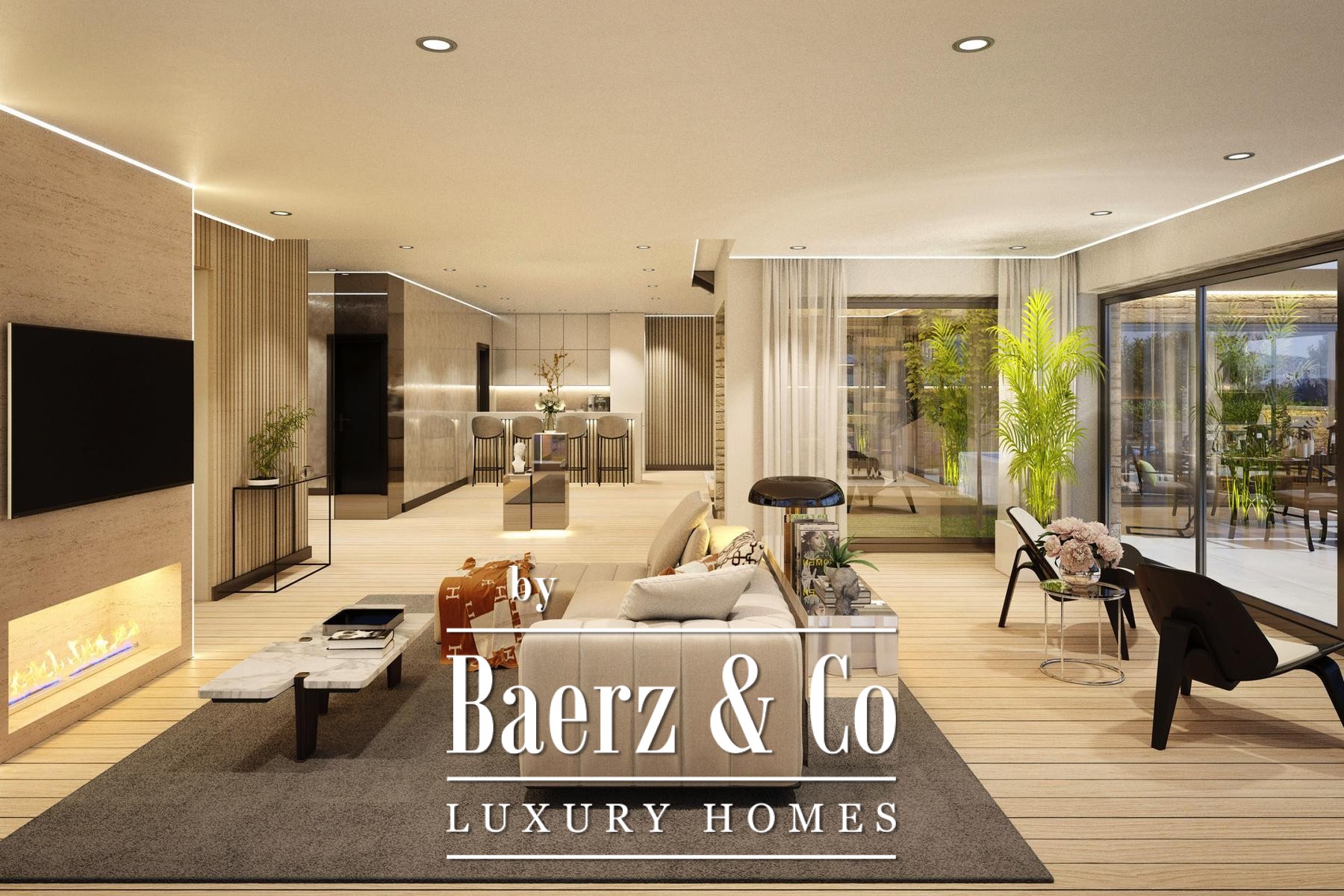 On the ground level, the entrance flows into a living area where an open-plan kitchen and dining space lead onto the terrace, encouraging a blend of privacy and sociability. This level also includes a bedroom with en-suite bathroom, a fitness area with sauna, and an additional bathroom. Upstairs, two principal suites feature private bathrooms, wardrobes, access to the 97 m² terrace, alongside another bedroom with its own bath.