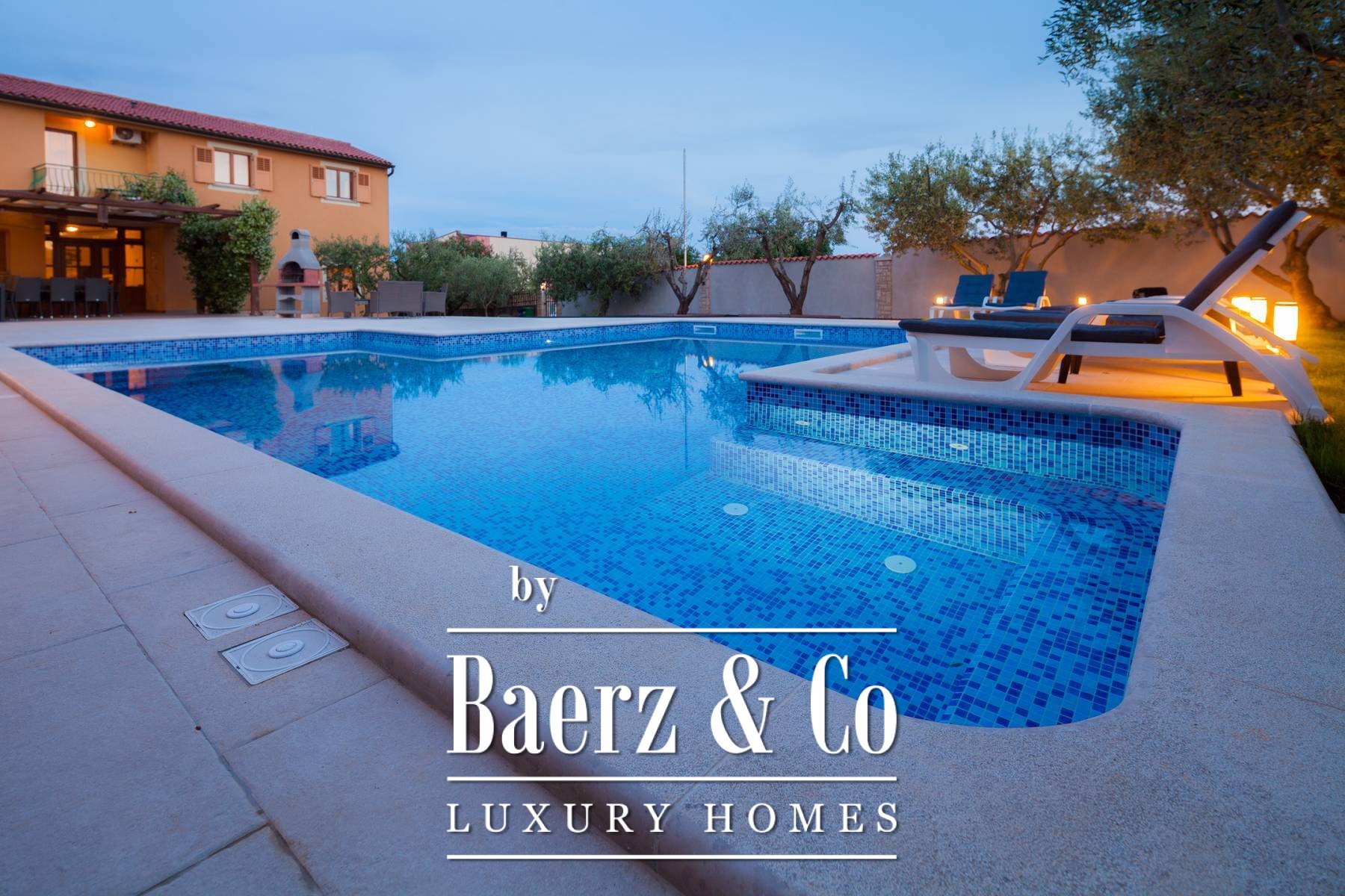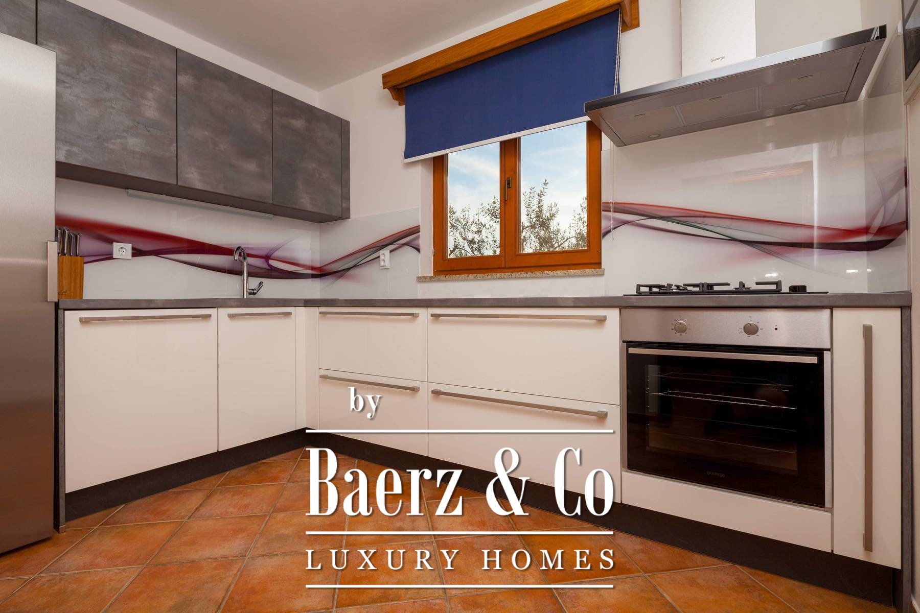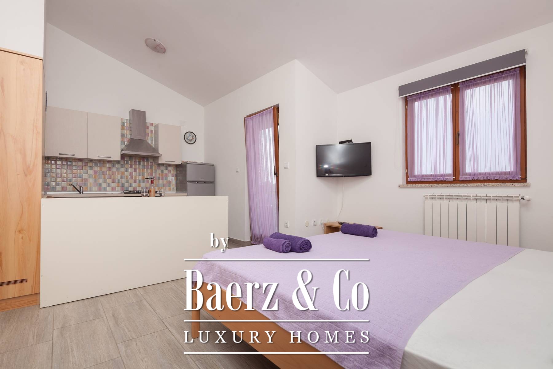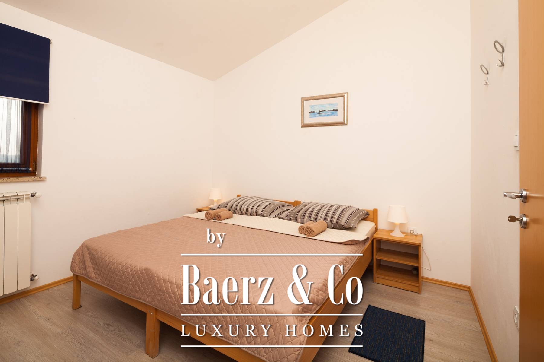 the back of the house there is a separate entrance that leads to the floor where the two sides are located. One spacious three-room apartment and one smaller one-room apartment. The three-room apartment consists of: an entrance hall, a toilet, a bathroom, a kitchen with a dining room, three bedrooms (one can easily be converted into a living room) and a terrace. The smaller apartment consists of: an entrance hall, a bathroom with a toilet, a bedroom, a kitchen with a dining room and a living room (the living room has a pull-out bed) and a terrace. On the ground floor of the building there is a garage for four cars, a game room (table tennis, darts, table football...) and a boiler room. The pool is 70m2 and has a jacuzzi and a shallow area for children. Heating is central gas. Additional nine air conditioners in the house. It is sold in a fully furnished condition. The apartment house in Banjole accommodates up to 20 guests. It is categorized for rent and very well occupied, and the annual income reaches 80-90 thousand euros. An ideal property for vacation and as an investment. In the immediate vicinity of the house there is a supermarket, restaurants, Benin pump, ATM, fish market, etc., which makes this house even more interesting for investment. The sea is only 800 meters away. The house is sold separately for 1,200,000 euros net, and the plot of land next to the house, which is 900 m2, can only be sold as a package with the house, and then the price is 1,300,000 euros net.