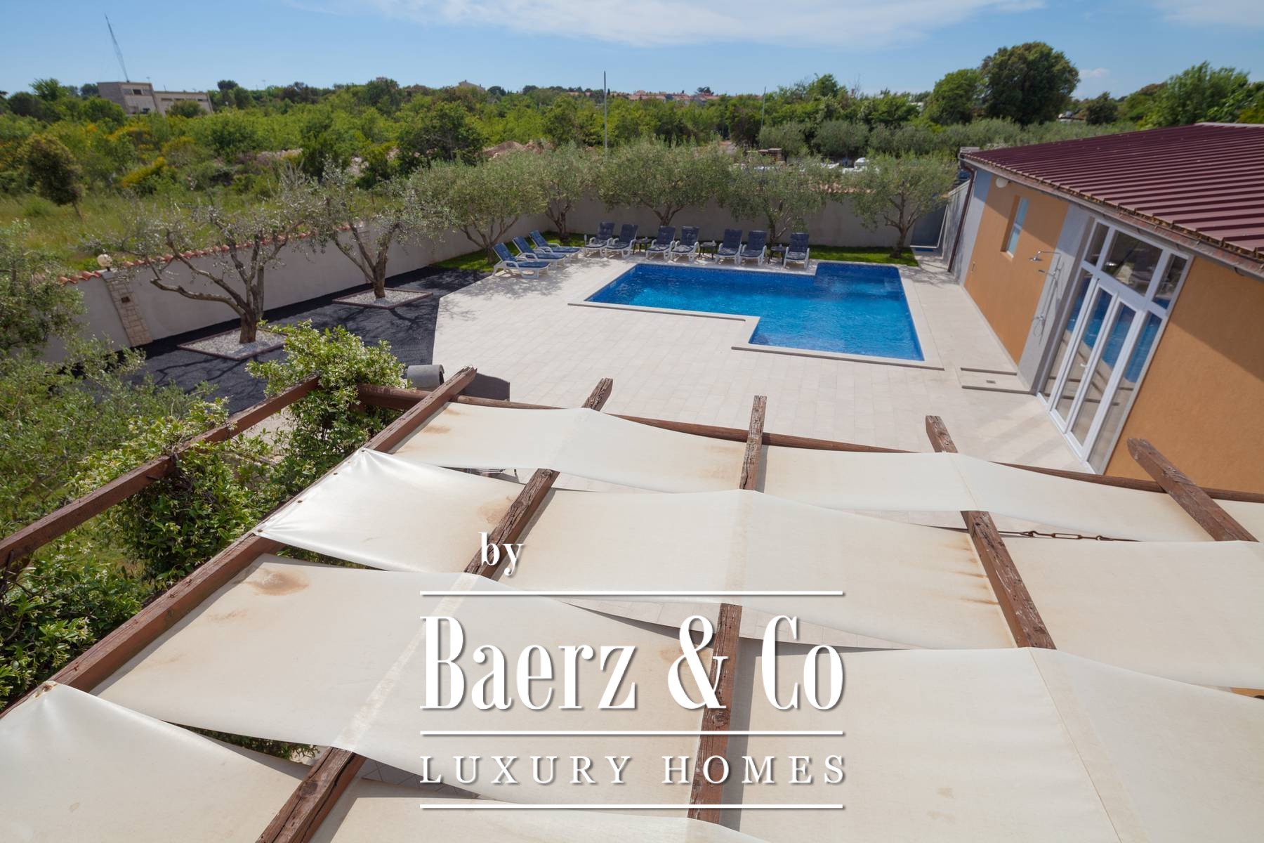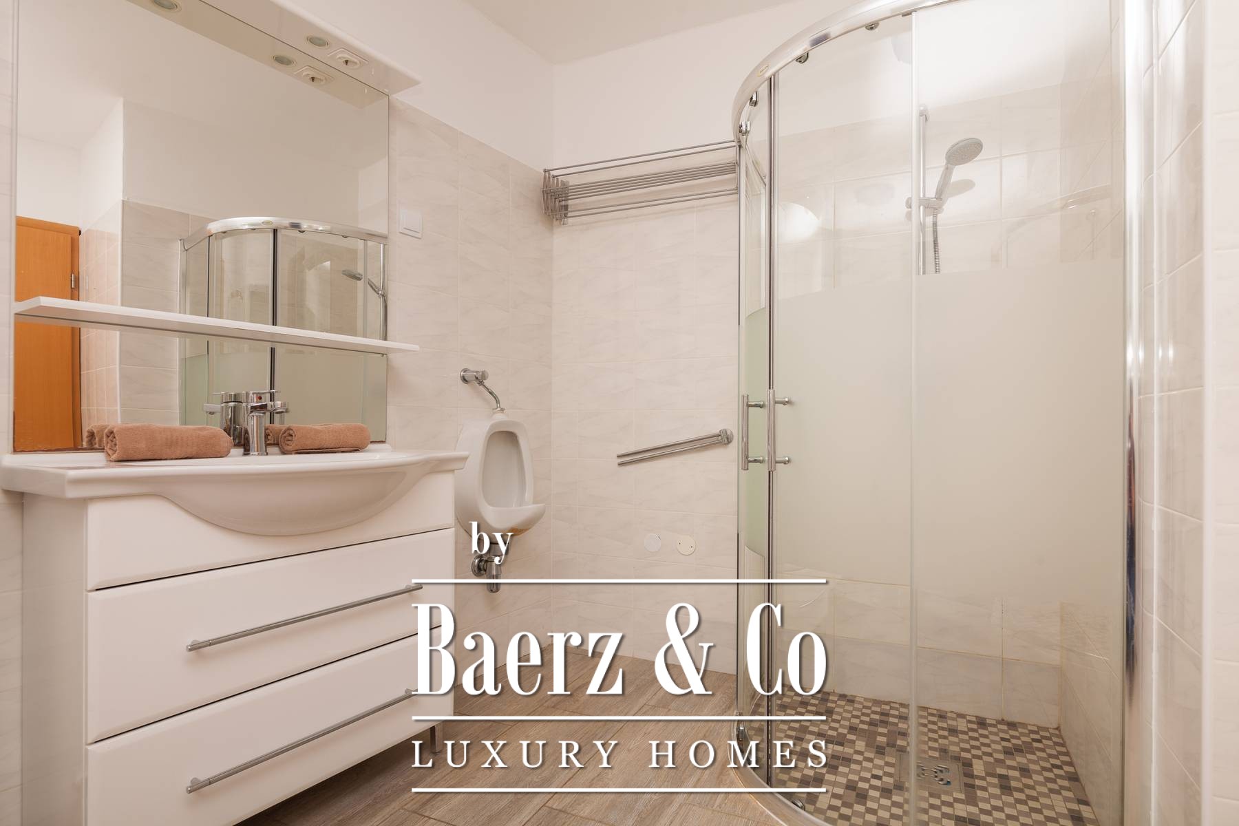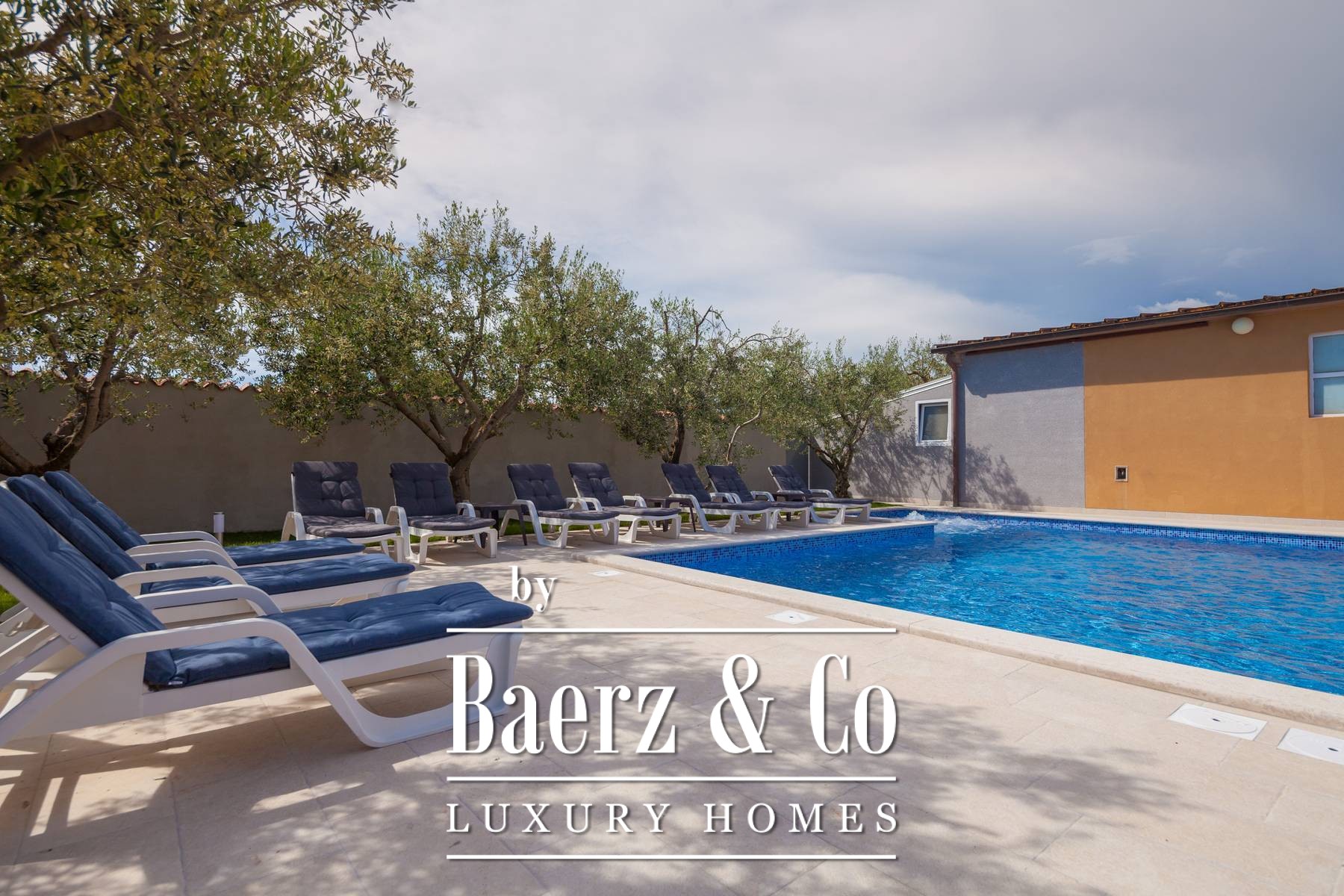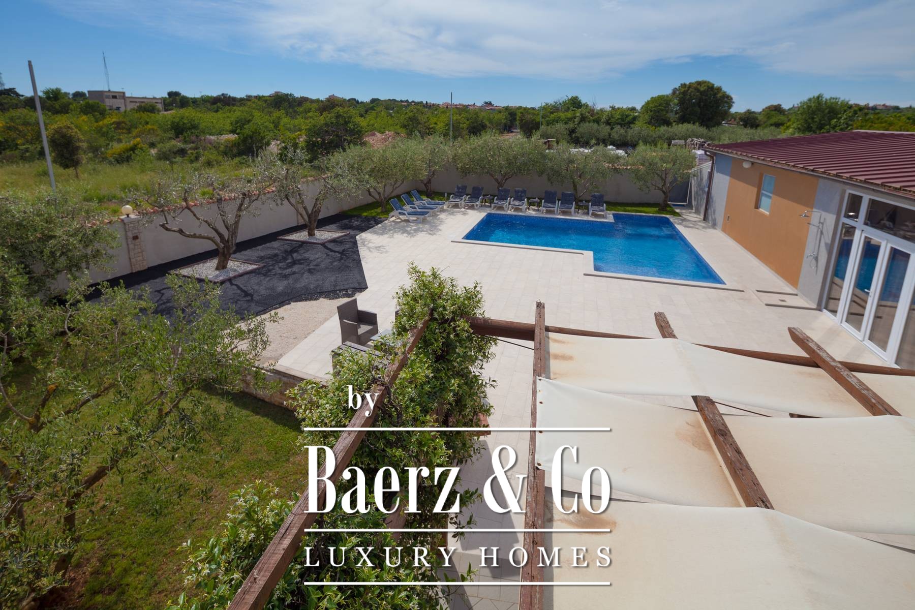 the back of the house there is a separate entrance that leads to the floor where the two sides are located. One spacious three-room apartment and one smaller one-room apartment. The three-room apartment consists of: an entrance hall, a toilet, a bathroom, a kitchen with a dining room, three bedrooms (one can easily be converted into a living room) and a terrace. The smaller apartment consists of: an entrance hall, a bathroom with a toilet, a bedroom, a kitchen with a dining room and a living room (the living room has a pull-out bed) and a terrace. On the ground floor of the building there is a garage for four cars, a game room (table tennis, darts, table football...) and a boiler room. The pool is 70m2 and has a jacuzzi and a shallow area for children. Heating is central gas. Additional nine air conditioners in the house. It is sold in a fully furnished condition. The apartment house in Banjole accommodates up to 20 guests. It is categorized for rent and very well occupied, and the annual income reaches 80-90 thousand euros. An ideal property for vacation and as an investment. In the immediate vicinity of the house there is a supermarket, restaurants, Benin pump, ATM, fish market, etc., which makes this house even more interesting for investment. The sea is only 800 meters away. The house is sold separately for 1,200,000 euros net, and the plot of land next to the house, which is 900 m2, can only be sold as a package with the house, and then the price is 1,300,000 euros net.