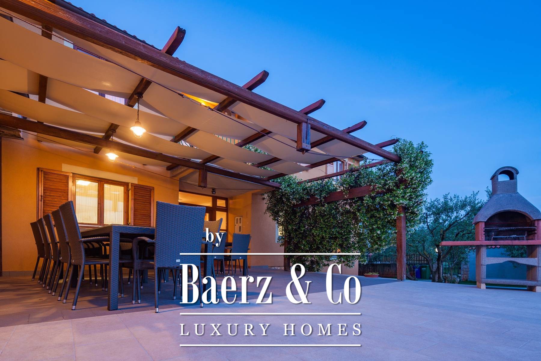 This apartment house of 500m2 (ground floor 250m2, first floor 250m2) is located on a closed plot of 800m2 in a quiet and intimate location in Banjole, isolated from view and noise. The house in Banjole also has a 225 m2 hall that is currently unused and can be used as an indoor wellness area and connected to the swimming pool. Furthermore, as the house is located in the K1 zone (business zone, mainly shopping) and is not completely built, it can be upgraded. The permitted built-up area is 50%, and currently around 37% is used. The house has two floors in the residential part and one floor in the hall part, and it can be built on 3 floors, so there is space and possibilities there as well. A beautiful and spacious house in Banjole consists of a ground floor and a first floor and is divided as follows: - on the ground floor of the house there is a residential unit with the following layout: entrance hall, kitchen, living room with dining room and fireplace that can also be used as a tavern, toilet, bathroom with laundry room, bedroom/study, terrace and a spacious garden with a 50m2 hydromassage pool with a children's area, barbecue, children's playground, outdoor shower, a huge hall that can be used to make a beautiful and spacious wellness and SPA area. - on the first floor of the house is a practical apartment consisting of: hallway, bathroom with toilet and hydromassage shower, three bedrooms, living room with kitchen (currently serving as the fourth bedroom) and terrace. From