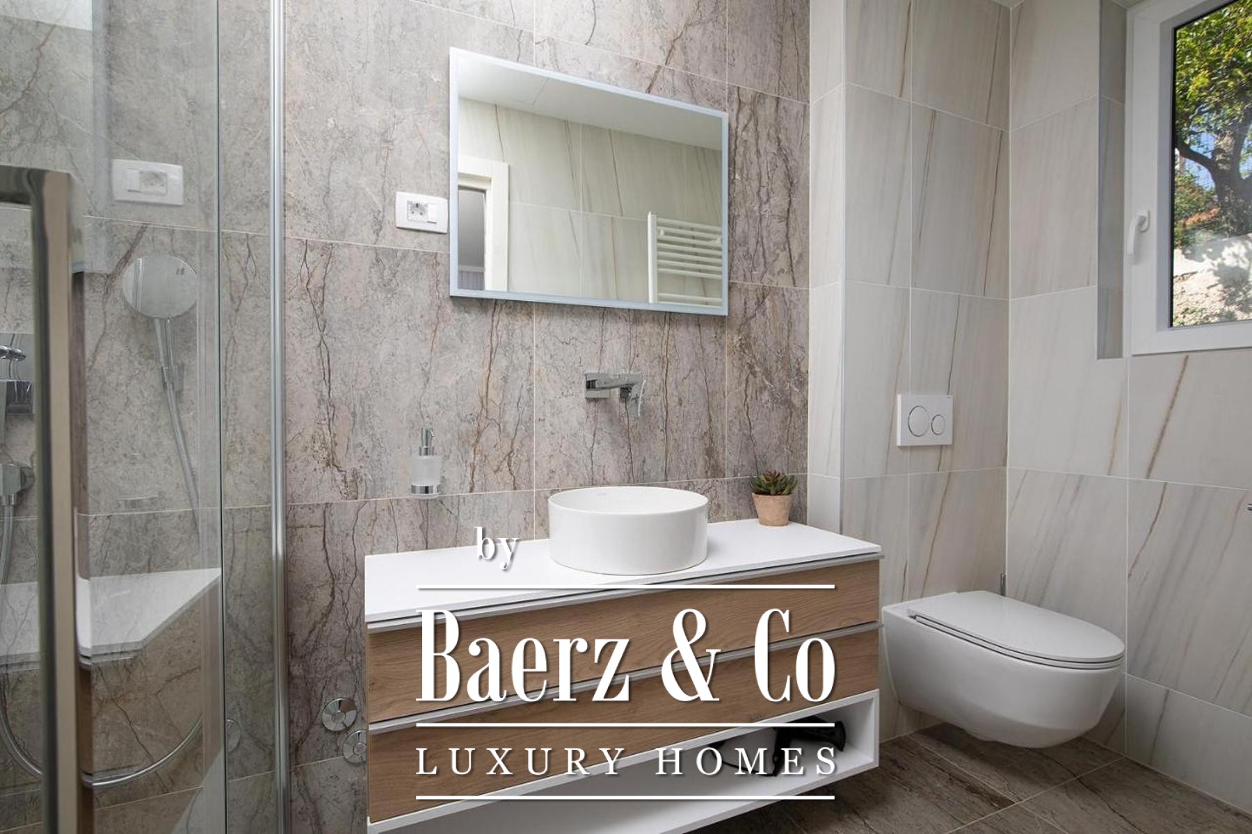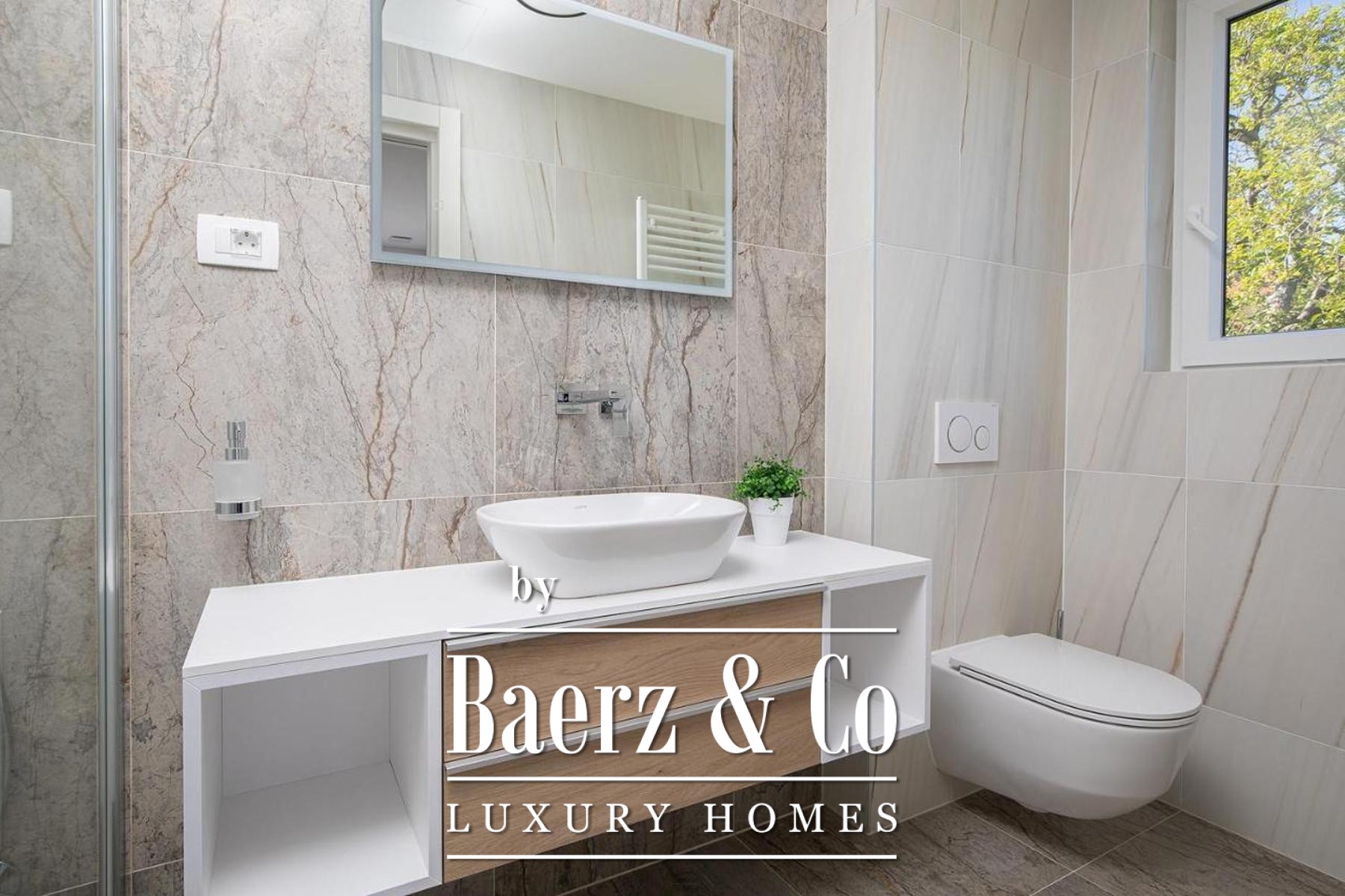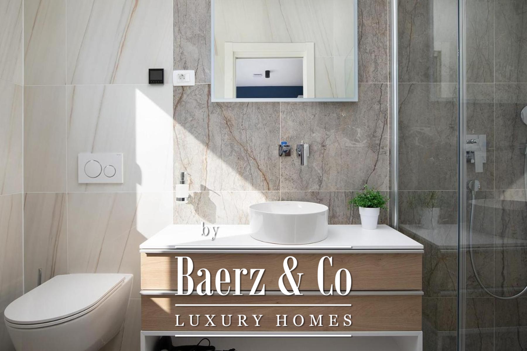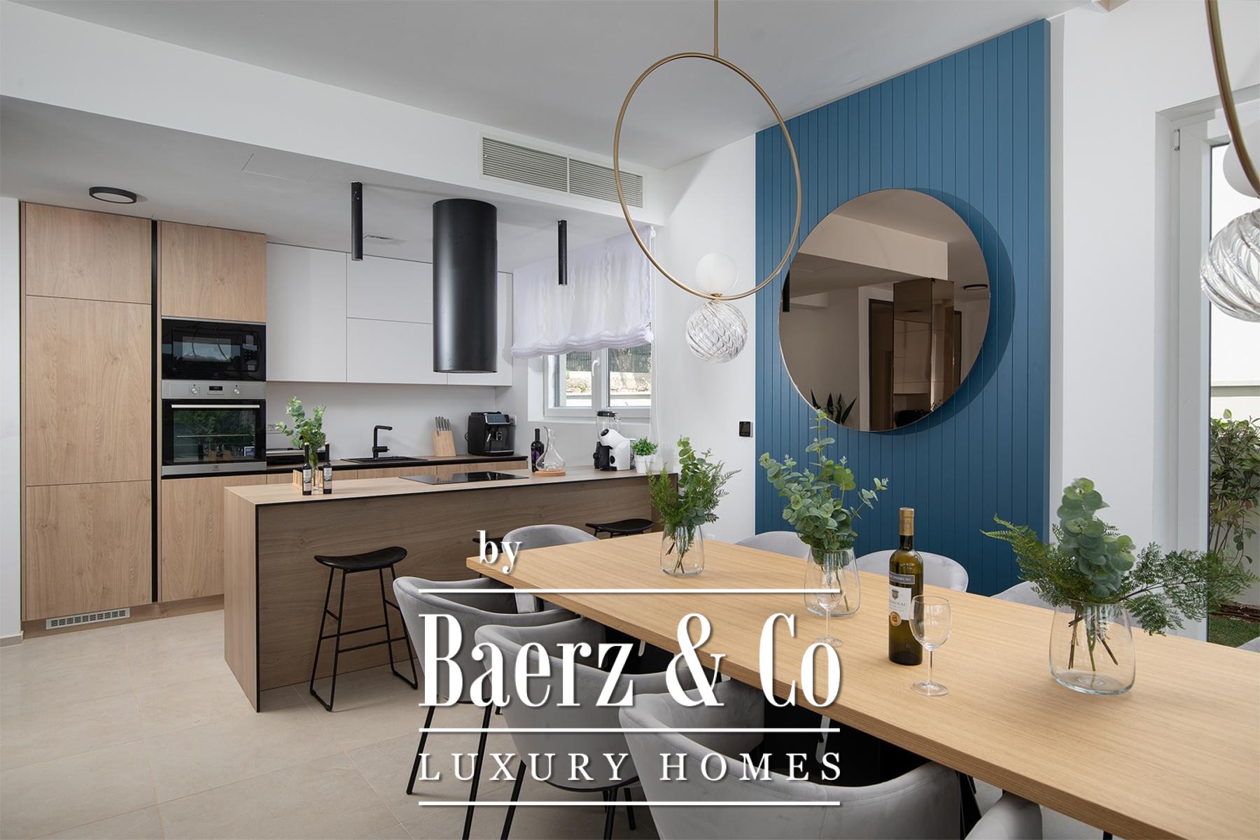 Upstairs, five bedrooms each offer their own bathroom, privacy, and vast glass walls framing serene views of the sea and surrounding pine forest. The interplay of sunset light and natural material defines the home’s refined presence. Underfloor heating, a heat pump system, and full air conditioning ensure year-round comfort across every detail. This luxury townhouse for sale in Medulin is a carefully curated retreat, expressing a Mediterranean rhythm in both its architecture and atmosphere.