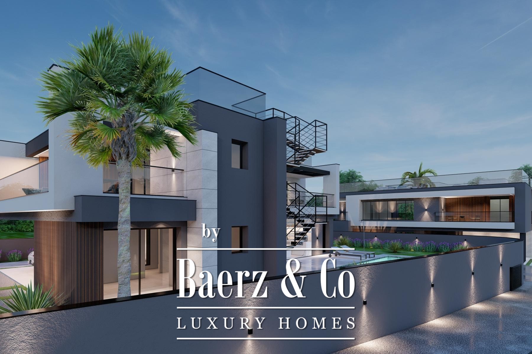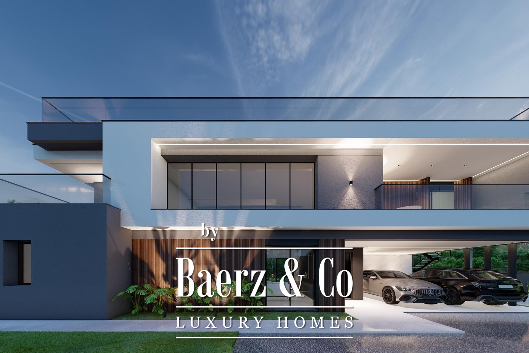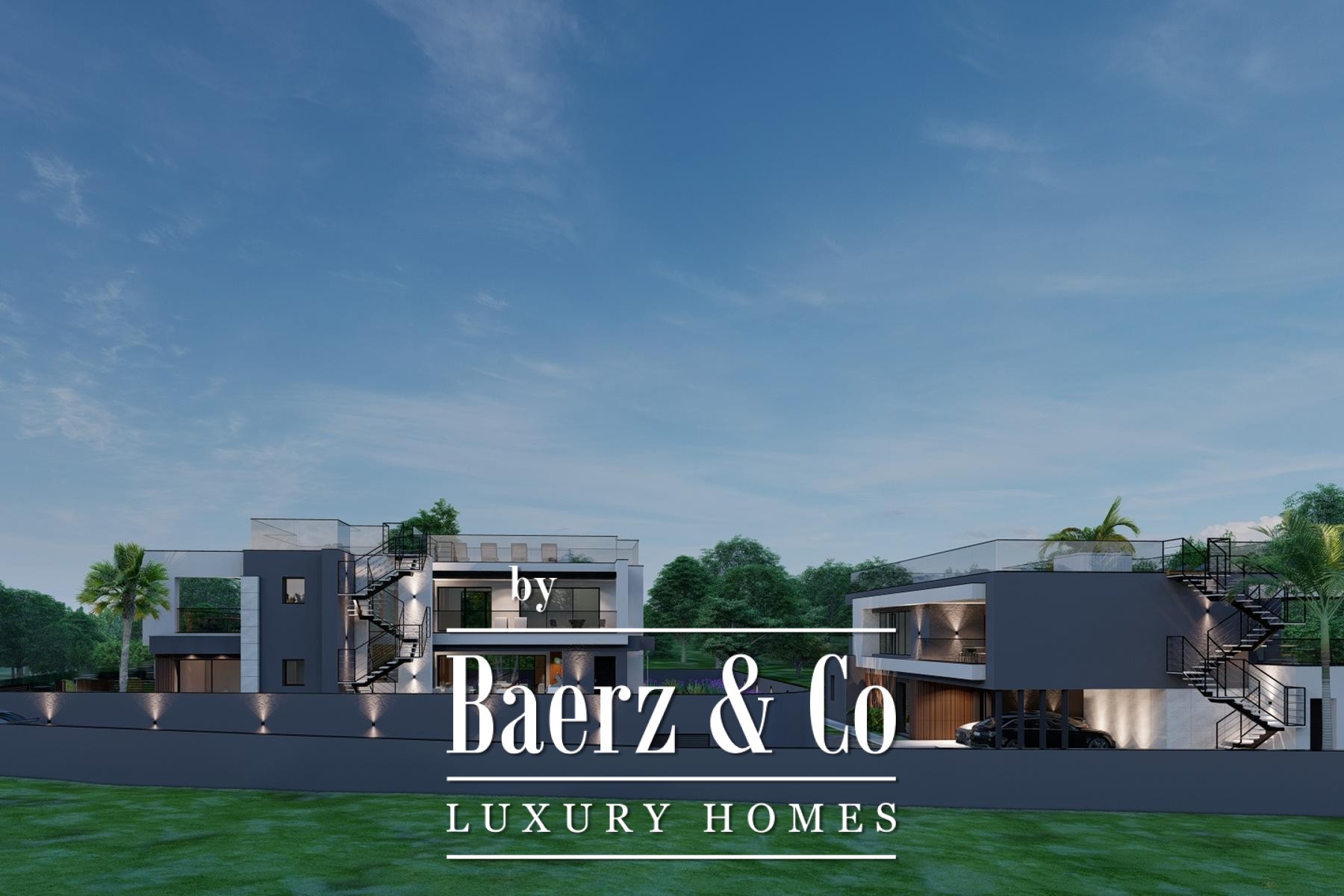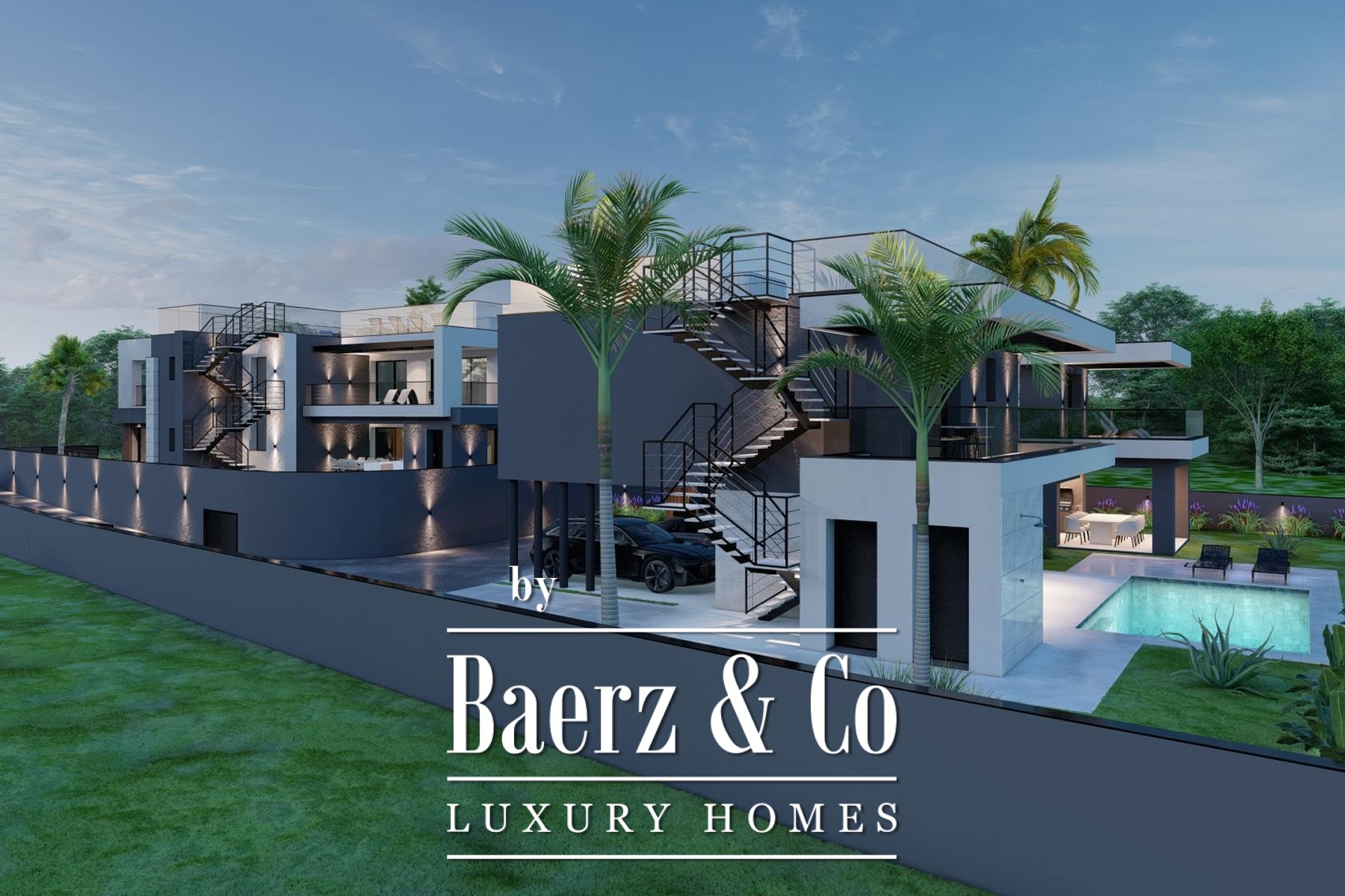 Townhouse Medulin presents a contemporary residence in the southern region of the Istrian peninsula, set just 20 meters from the Adriatic. This property spans 417 m² across two levels, complemented by a rooftop terrace, and rests on a 720 m² plot that balances interior space with outdoor living. The orientation and layout engage southern light, flooding the open-plan living room with a clarity that extends through to the covered terrace and swimming pool. A sleek kitchen, one bedroom with private bath, guest facilities, dedicated technical and storage rooms create practical ease on the ground floor.