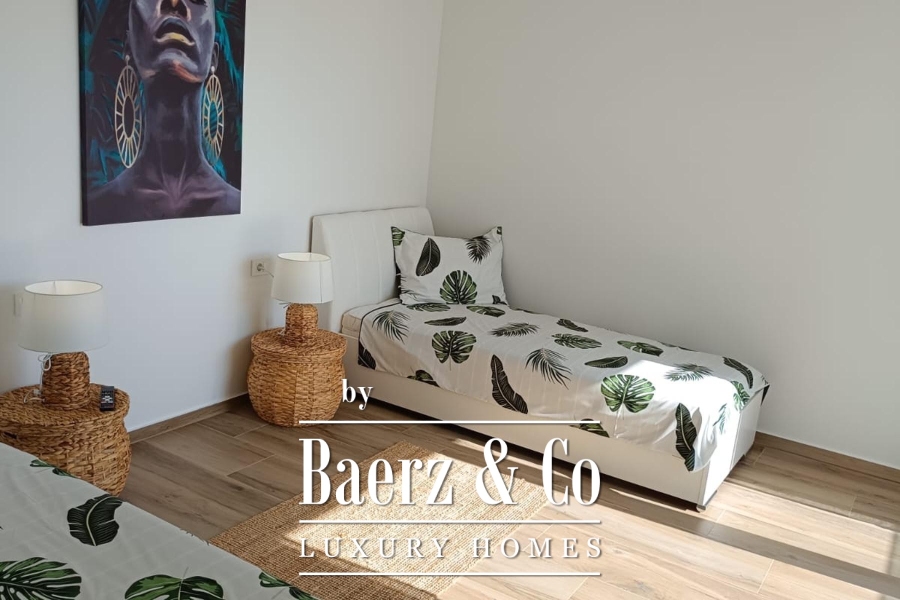 The ground floor welcomes residents with an entrance hall, guest toilet, and pantry, alongside a bedroom with a private bathroom. The open-plan living space, merging kitchen and dining areas, flows seamlessly onto a covered terrace accessible from both living and sleeping quarters. Upstairs, two further bedrooms each have en-suite bathrooms; one adjoins a private terrace, and the other opens to a shared terrace with a relaxation room, featuring a sauna, shower, and sweeping sea outlooks.