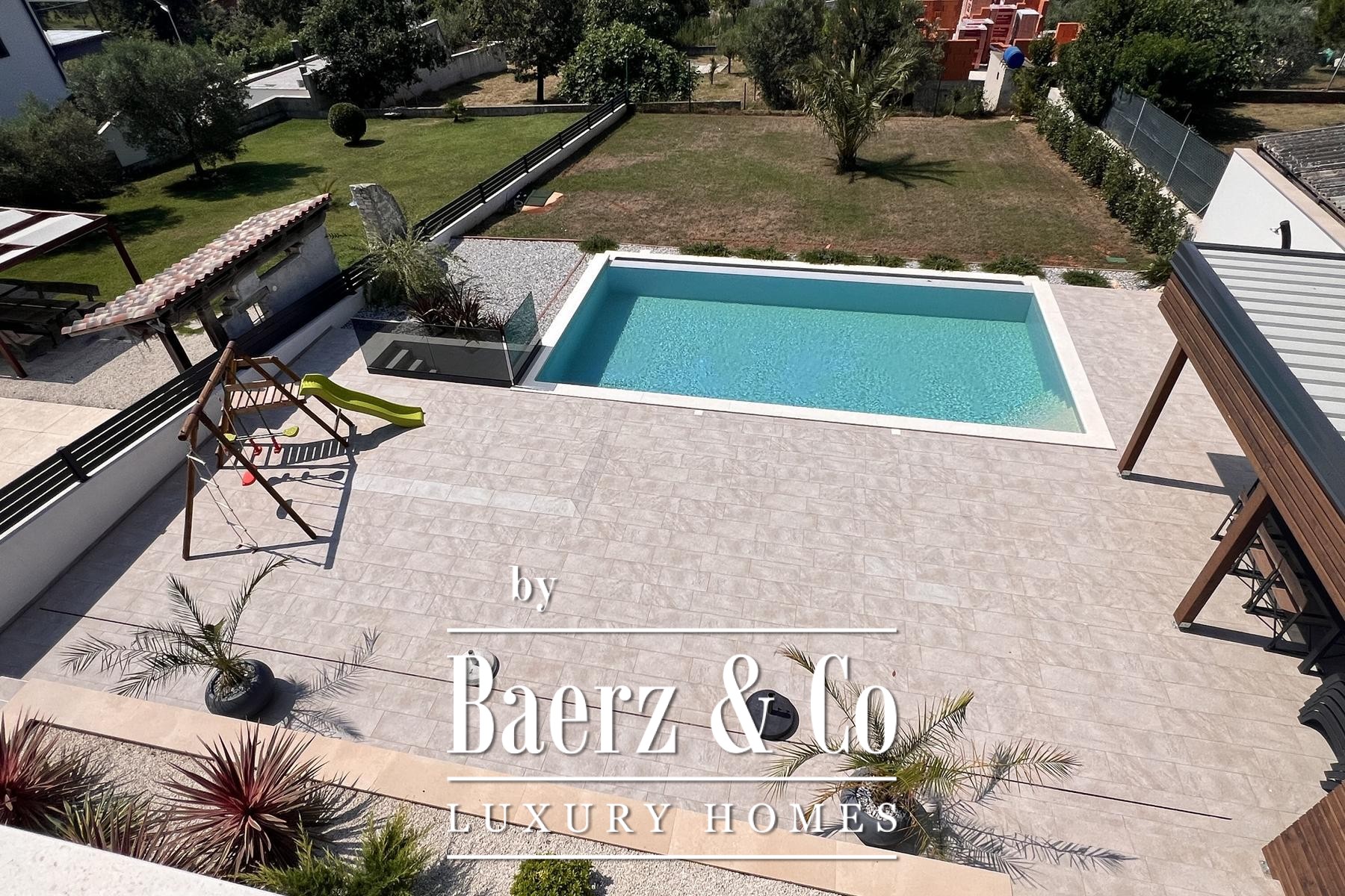 Central to the landscaped courtyard lies a 45 m² swimming pool, bordered by a sunbathing area, summer kitchen with barbecue, an outdoor shower, and a playground. Four parking spaces are conveniently positioned by the entrance. Floors throughout are finished in refined ceramics, with electric underfloor heating in bathrooms and inverter air conditioning in every room. Villa Medulin is presented fully furnished and is currently operated as a tourist rental, offering a blend of comfort, design, and discretion on the Adriatic coast.